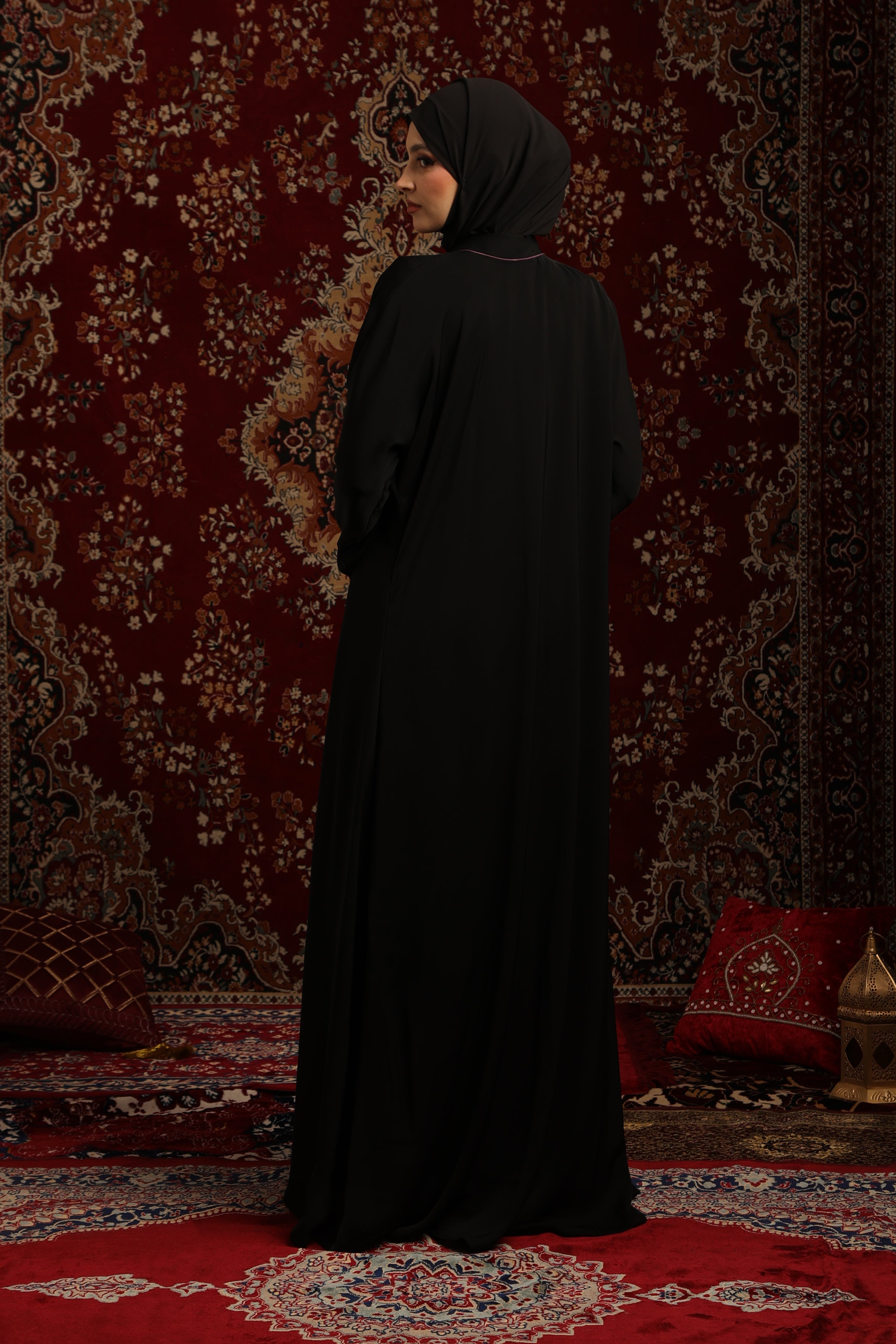 تفاصيل ياقة الشال المصنوعة يدويًا: السمة المميزة لهذه العباية الفاخرة هي ياقة الشال الرائعة، المزينة بتفاصيل يدوية دقيقة. تضفي هذه الحرفية المتقنة لمسةً راقيةً مستوحاة من عالم الأزياء الراقية، مما يجعل التصميم بأكمله فريدًا من نوعه.
