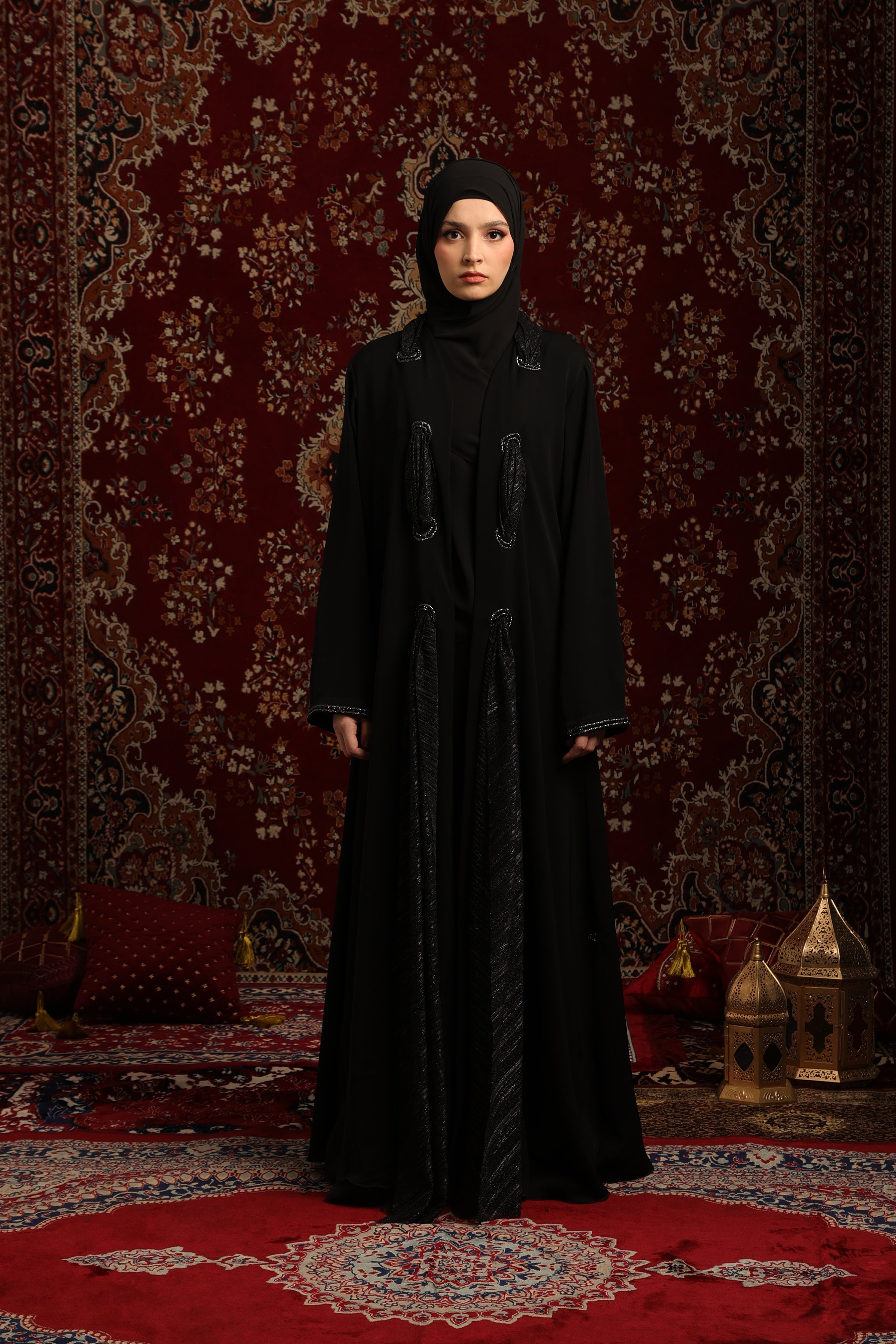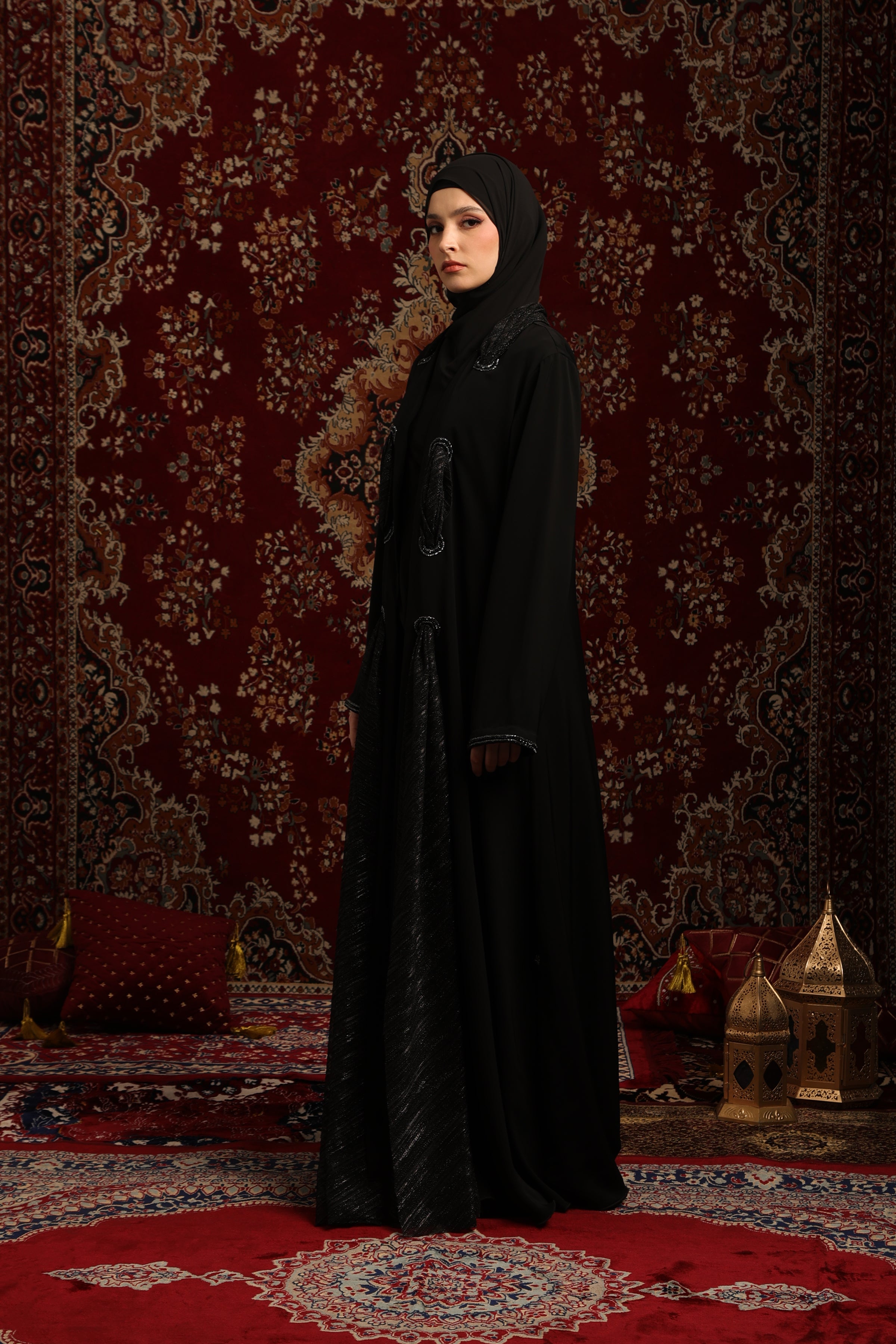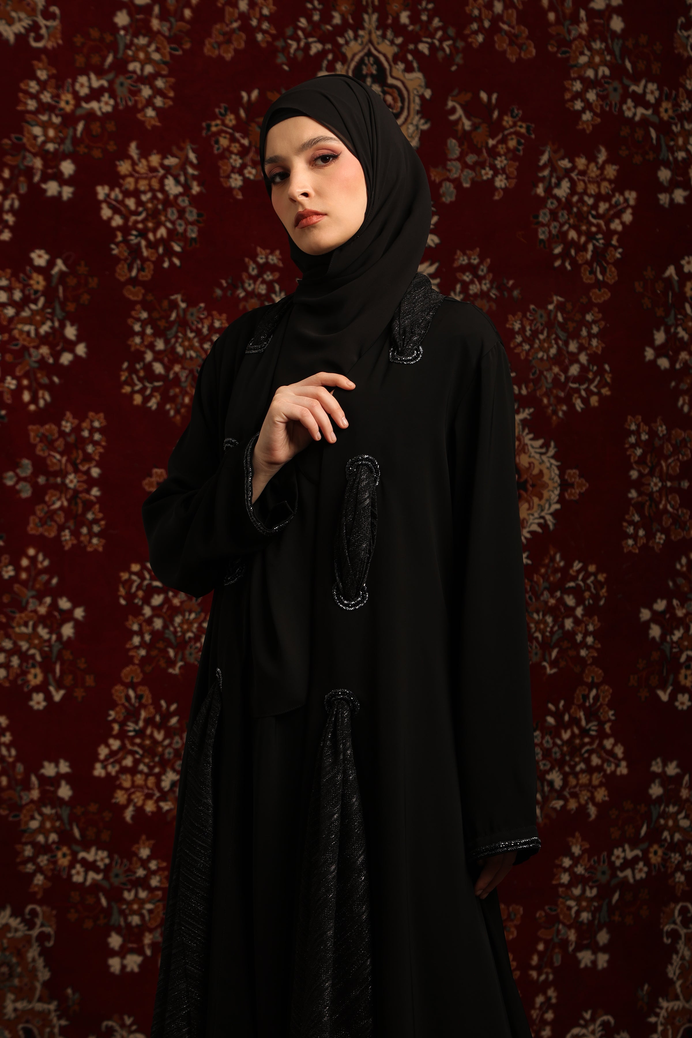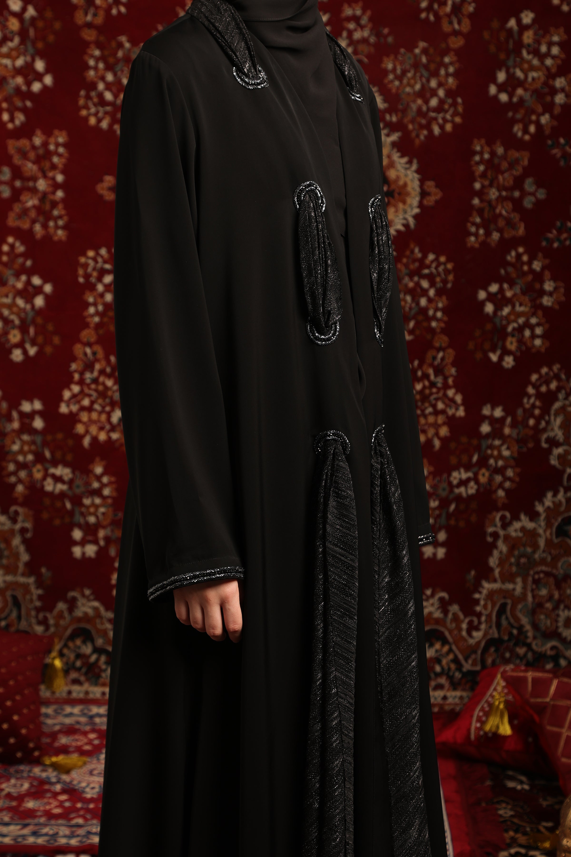 تفاصيل ياقة الشال المصنوعة يدويًا: السمة المميزة لهذه العباية الفاخرة هي ياقة الشال الرائعة، المزينة بتفاصيل يدوية دقيقة. تضفي هذه الحرفية المتقنة لمسةً راقيةً مستوحاة من عالم الأزياء الراقية، مما يجعل التصميم بأكمله فريدًا من نوعه.