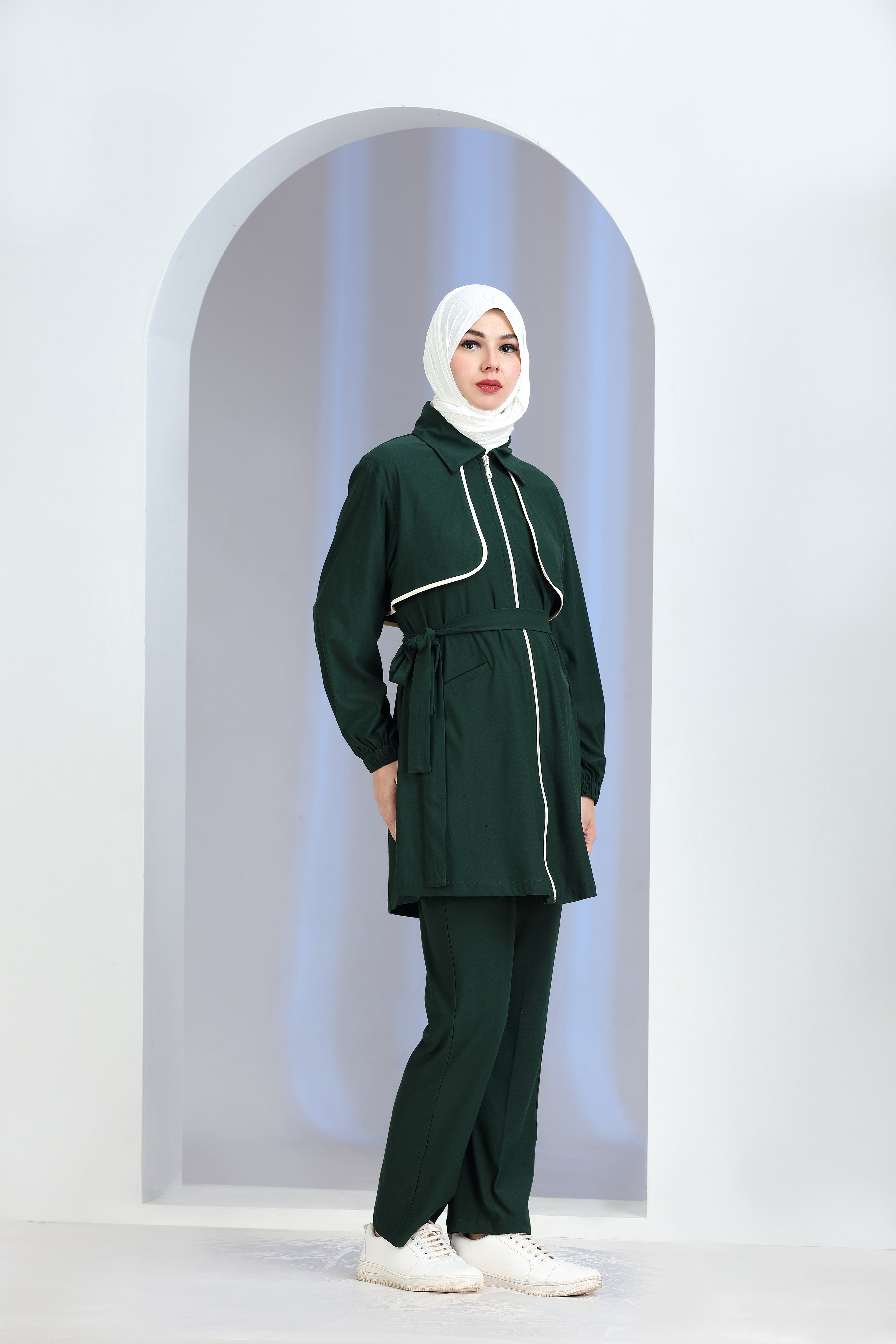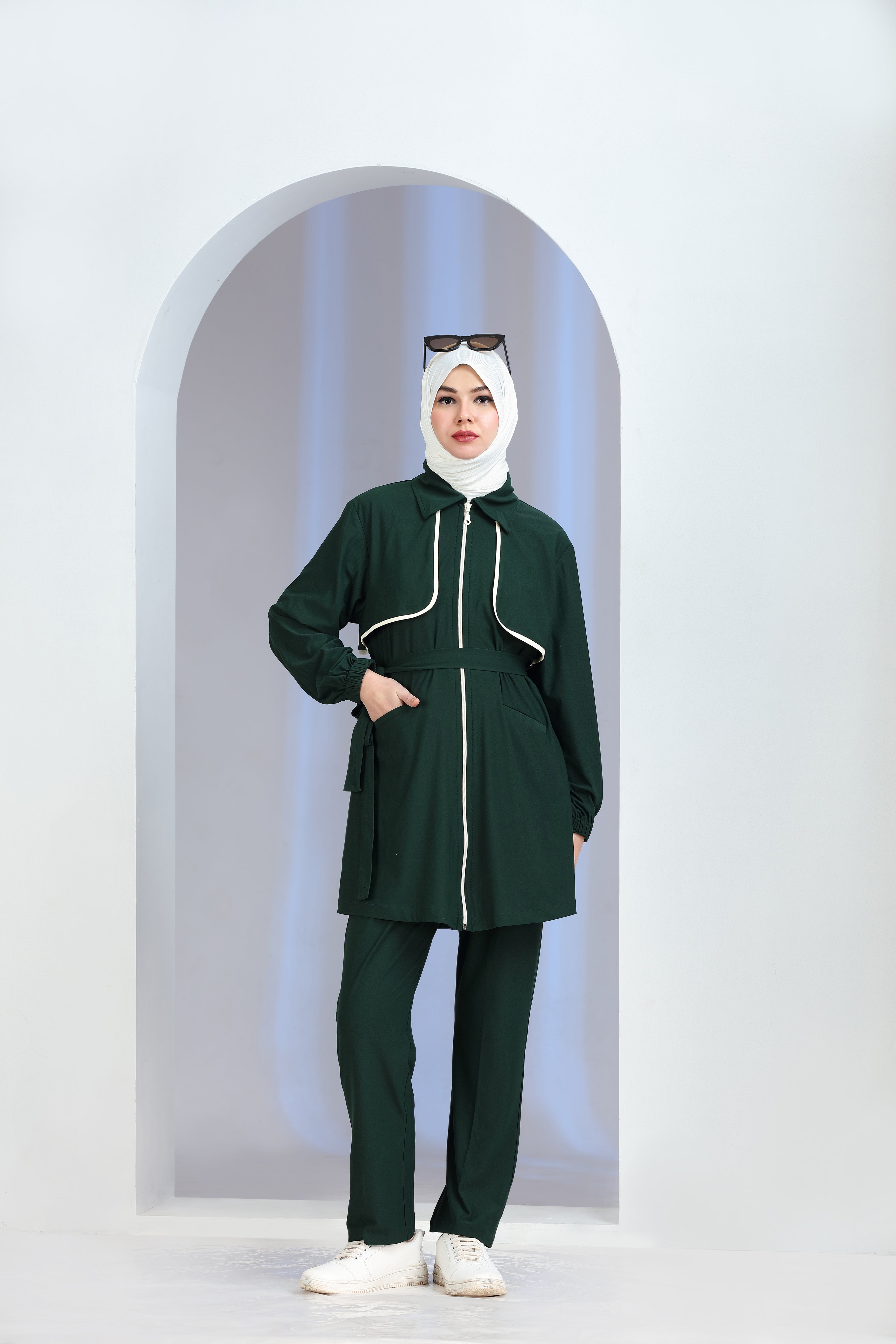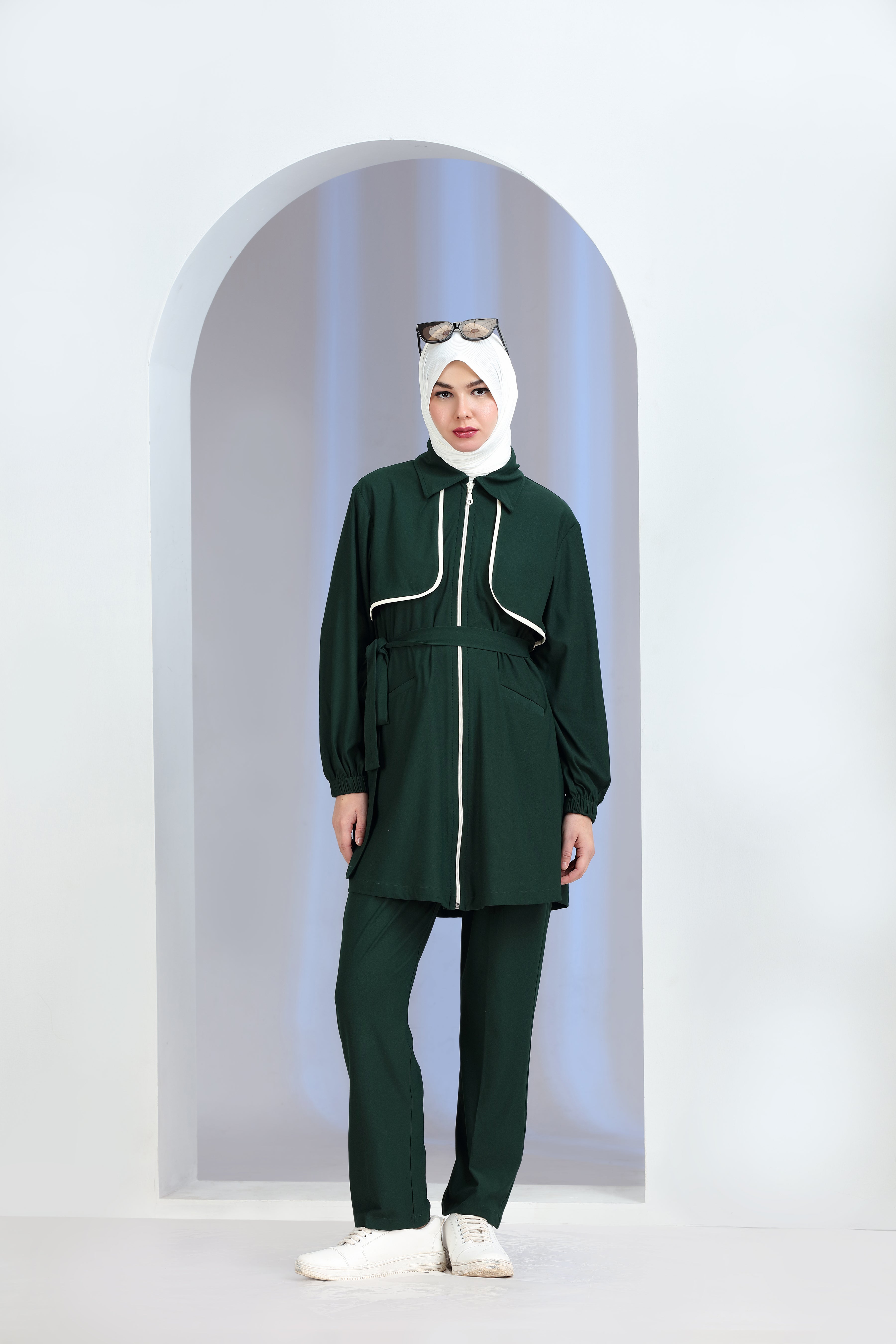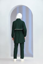 The Motus Knit Co-ord Set is designed for effortless modest dressing with a modern, structured aesthetic. This two-piece set features a longline zip-front knit top with contrast piping and an adjustable waist tie, paired with straight-fit knit trousers for a clean and polished silhouette.