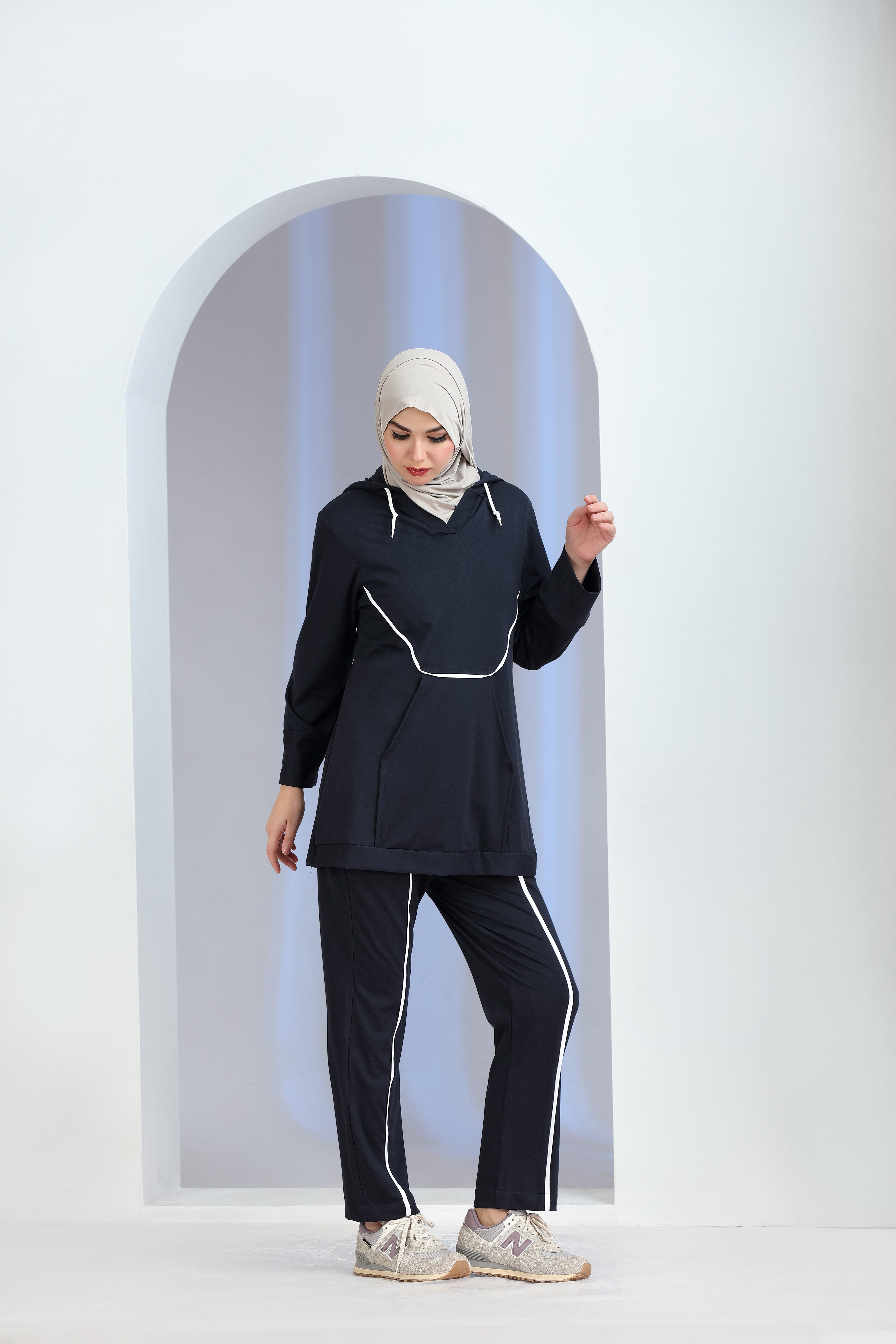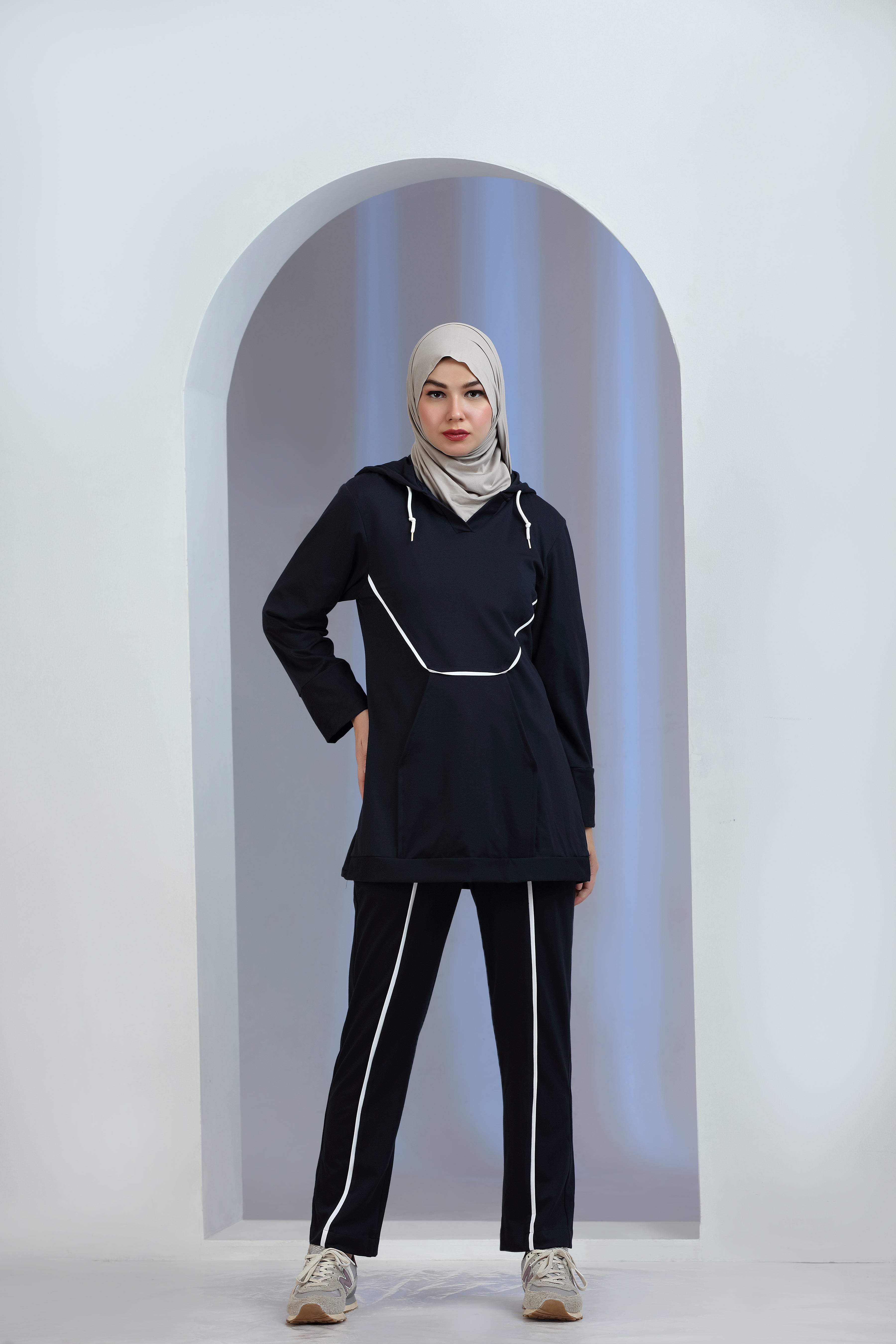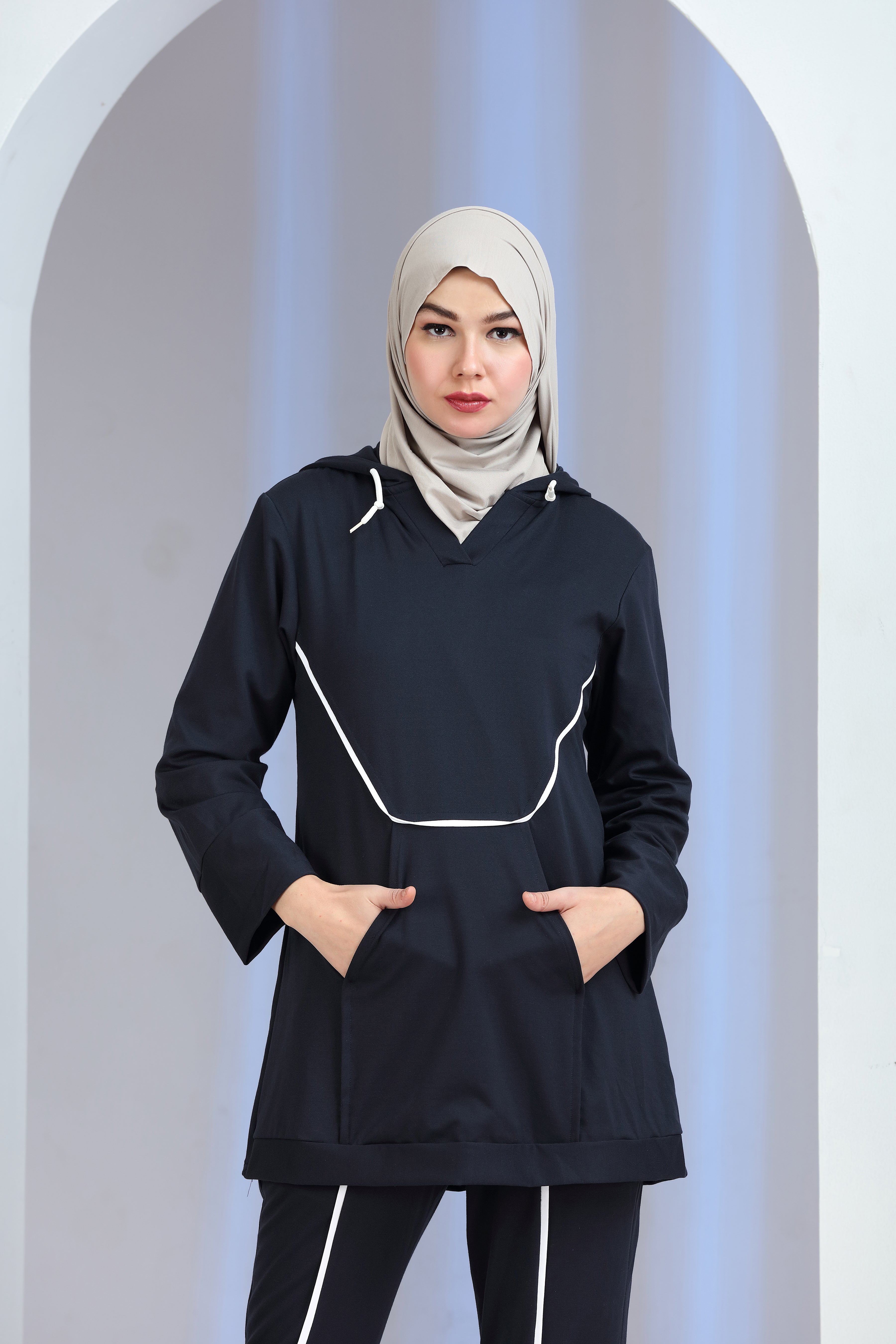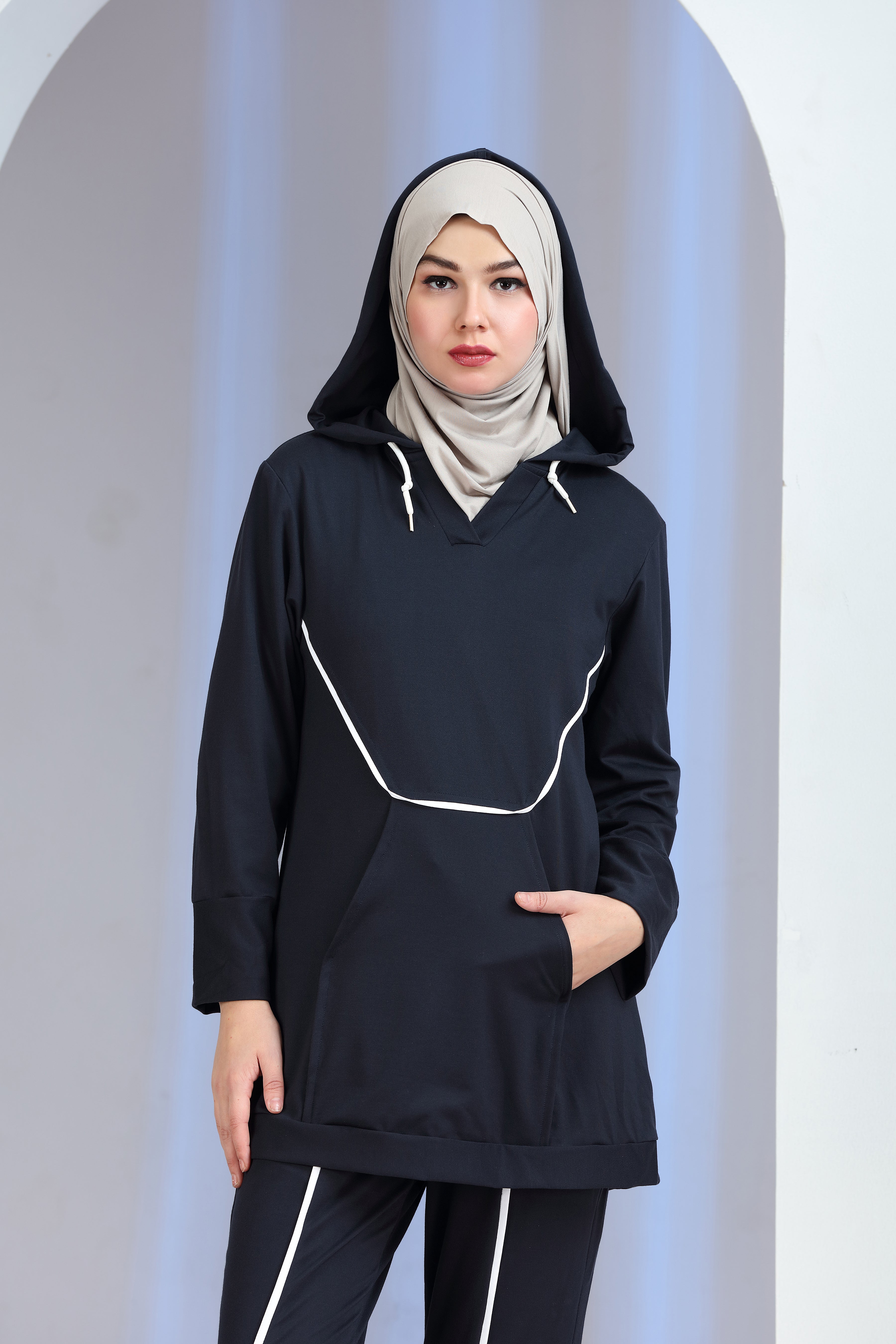 The Vibrio Knit Co-ord Set blends modern athleisure with refined modesty. Designed with a longline hooded knit top featuring contrast piping and functional front pockets, this two-piece set is paired with matching straight-fit knit trousers for a sleek, coordinated look.