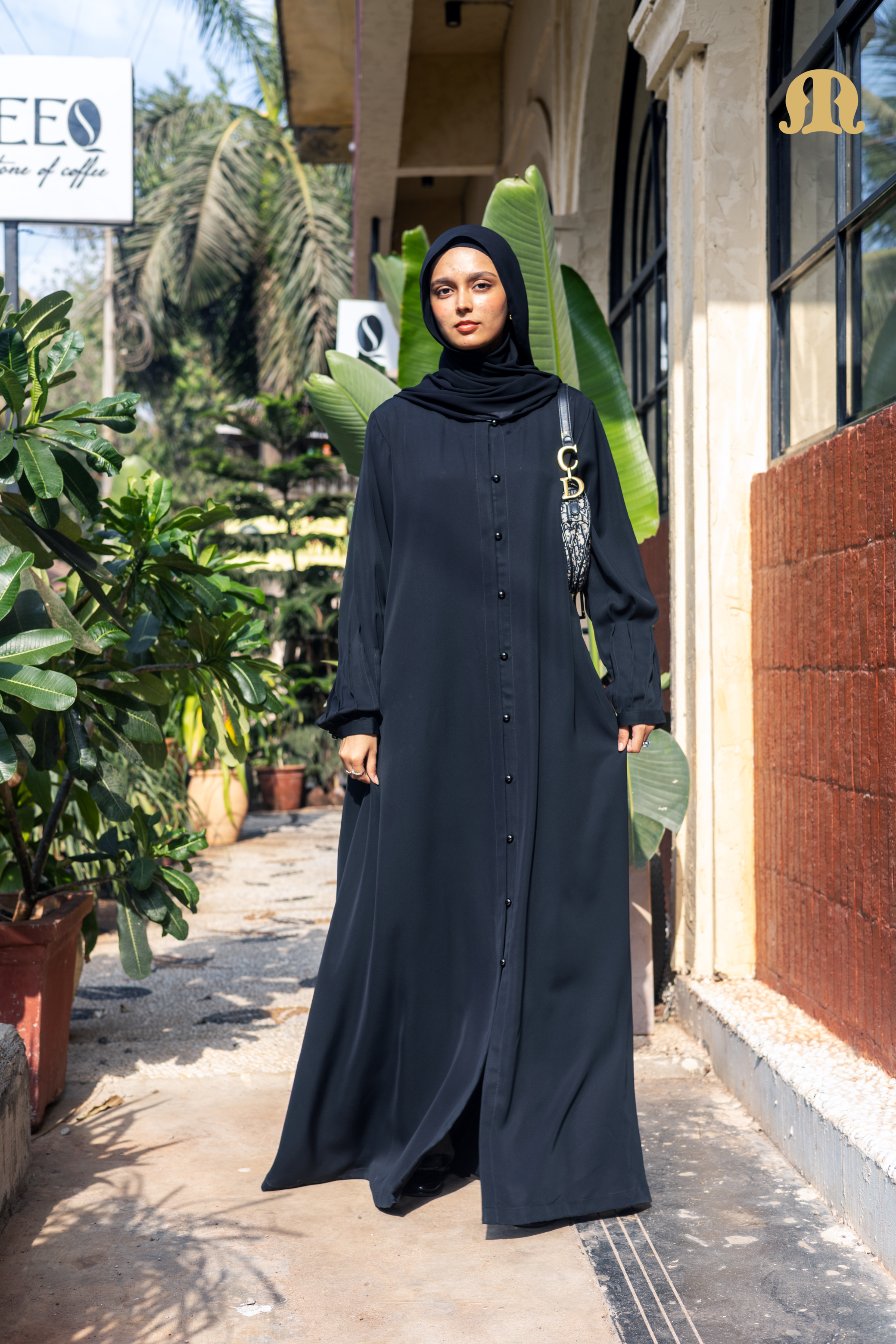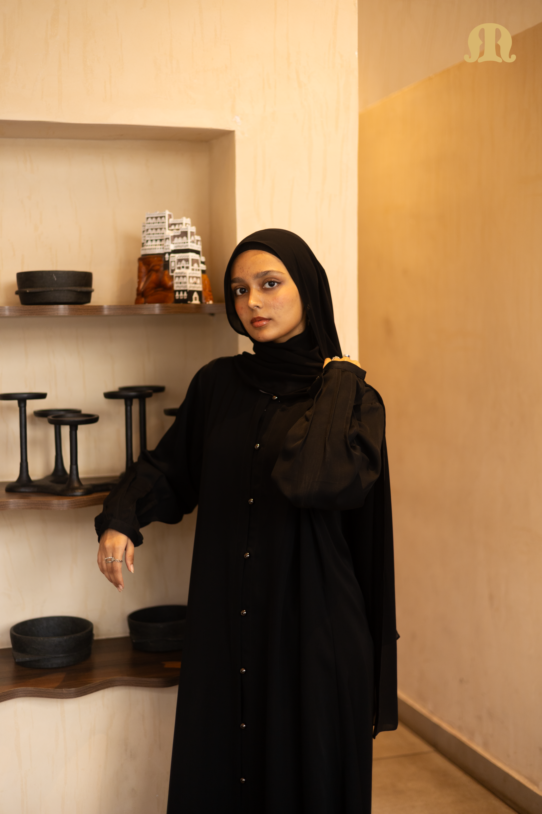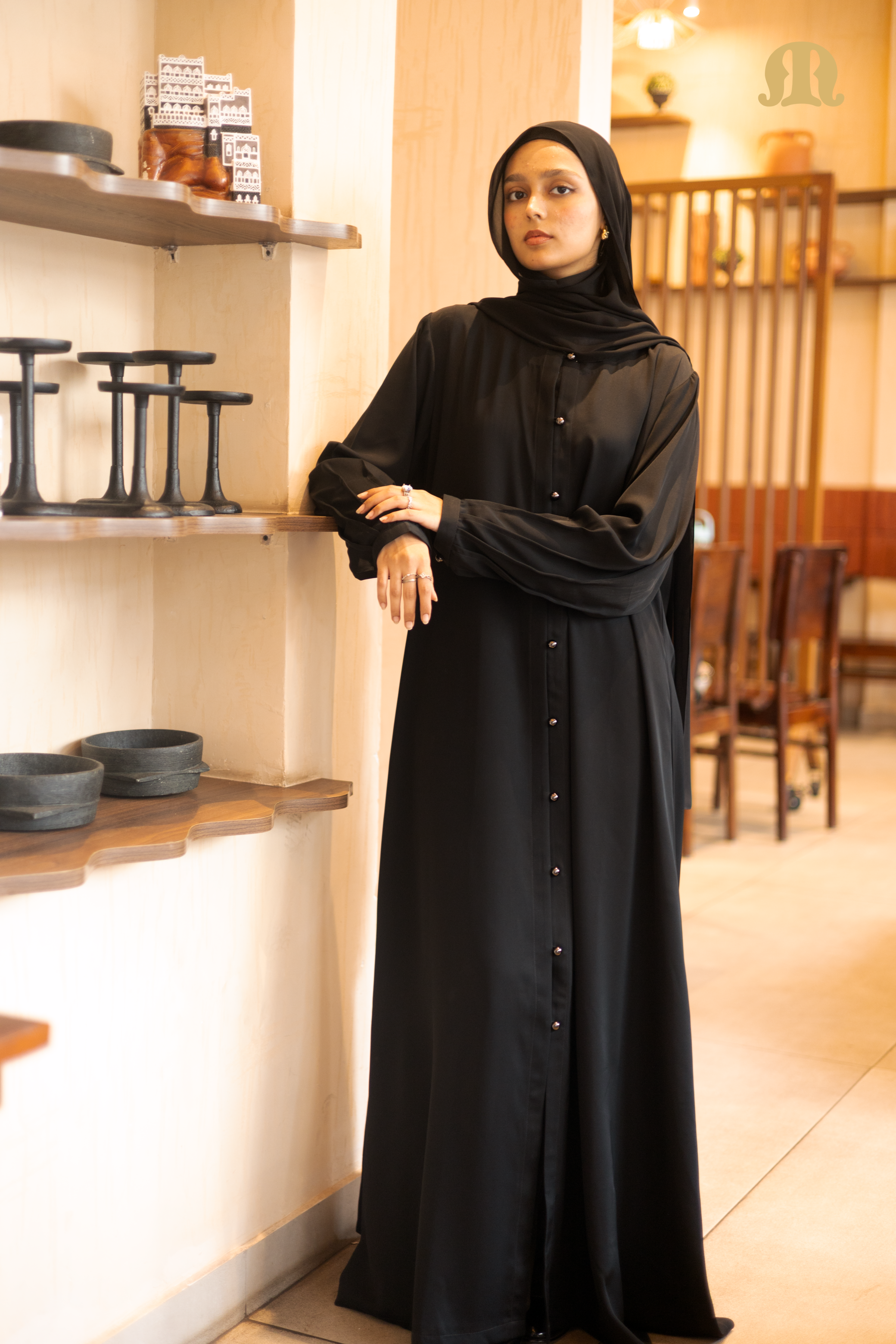 Ruww is all about fluid discipline. A row of covered buttons runs clean down the front, while the sleeves burst into generous pleats—voluminous yet contained. Cut in breathable Indonesian nida, its straight silhouette gives it a graceful fall and everyday ease.