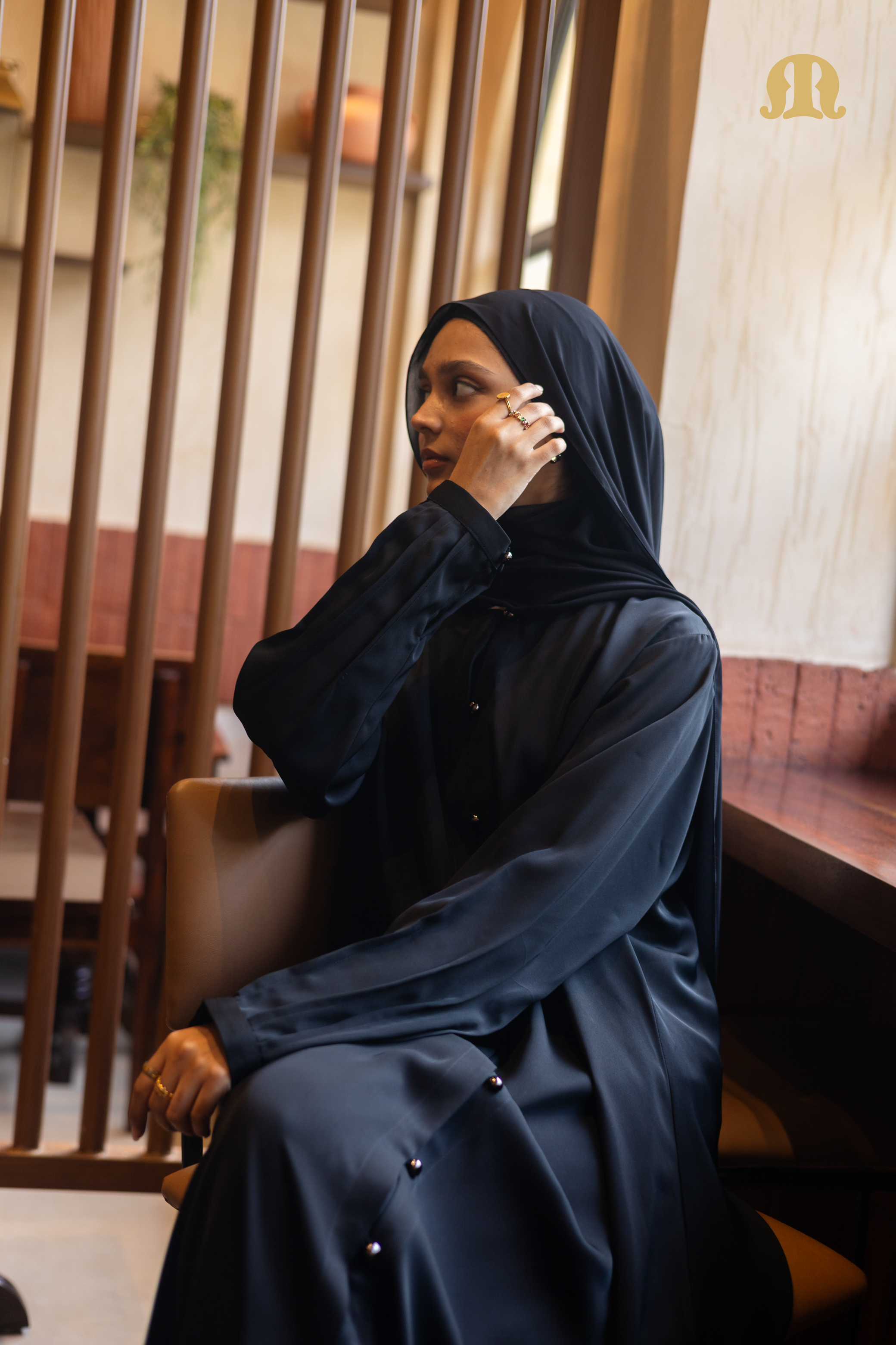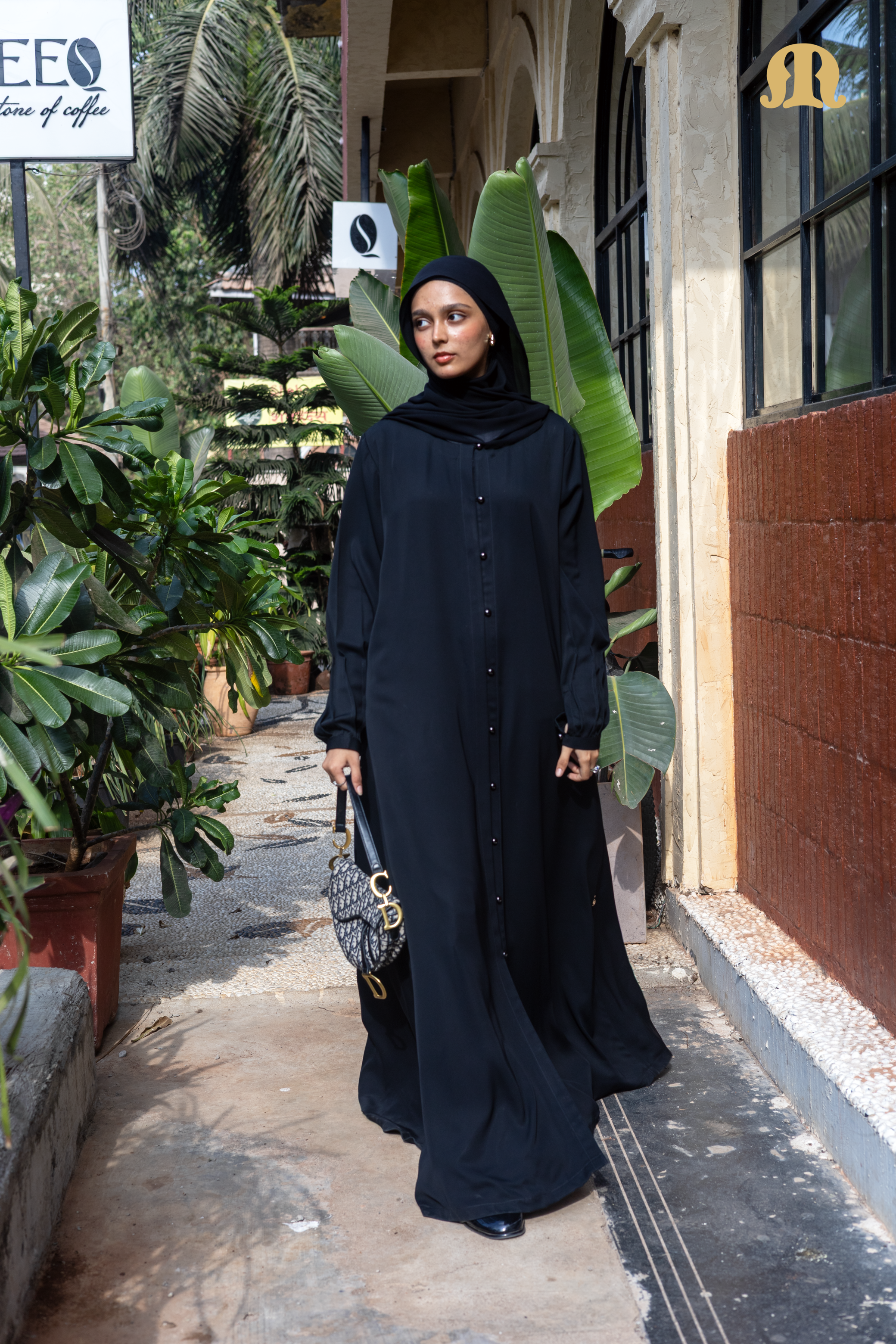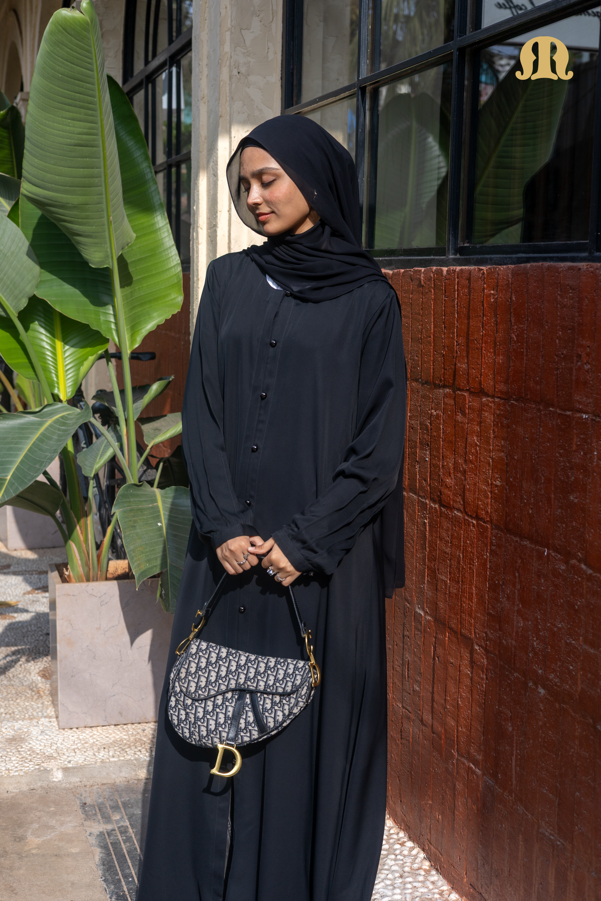 Ruww is all about fluid discipline. A row of covered buttons runs clean down the front, while the sleeves burst into generous pleats—voluminous yet contained. Cut in breathable Indonesian nida, its straight silhouette gives it a graceful fall and everyday ease.