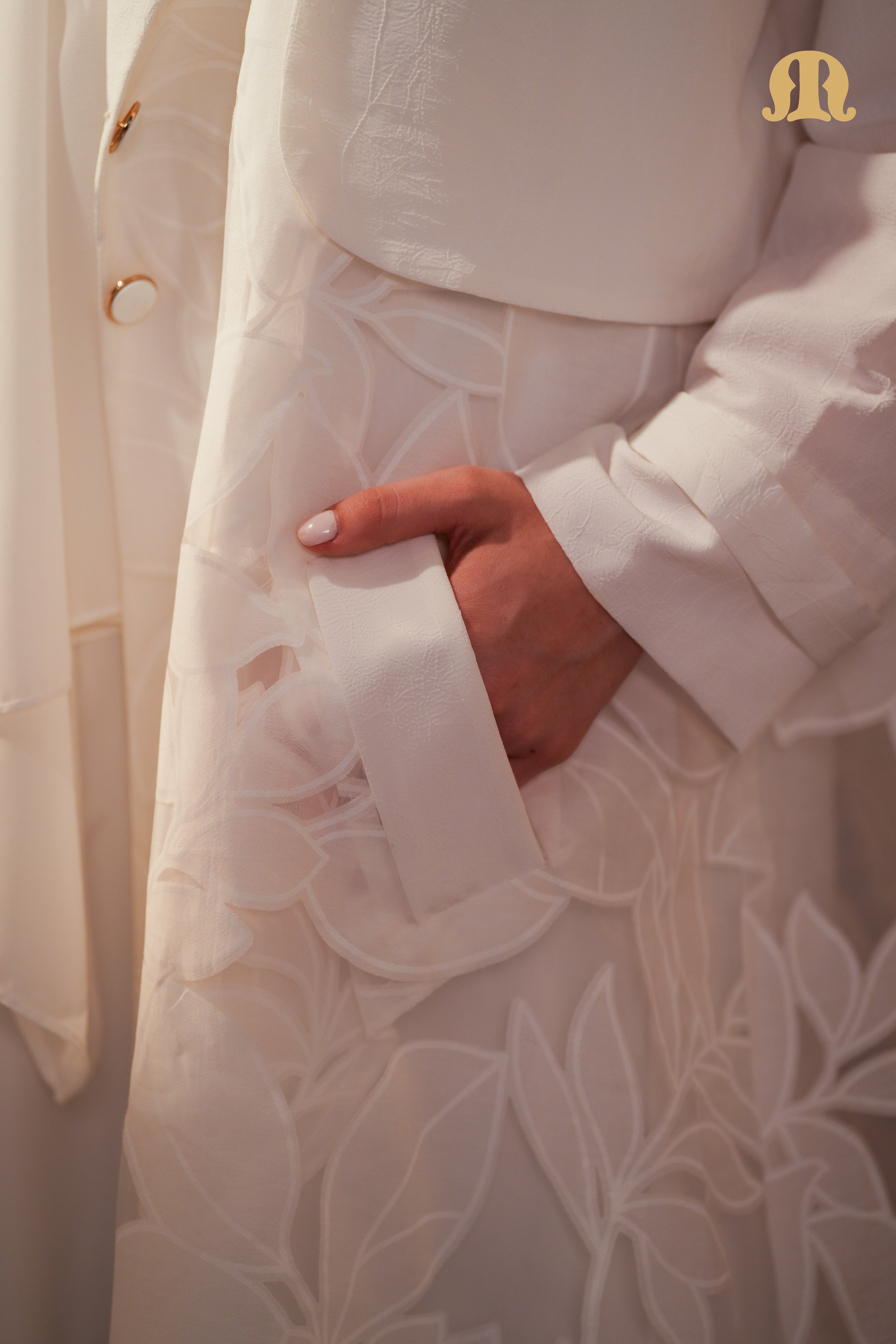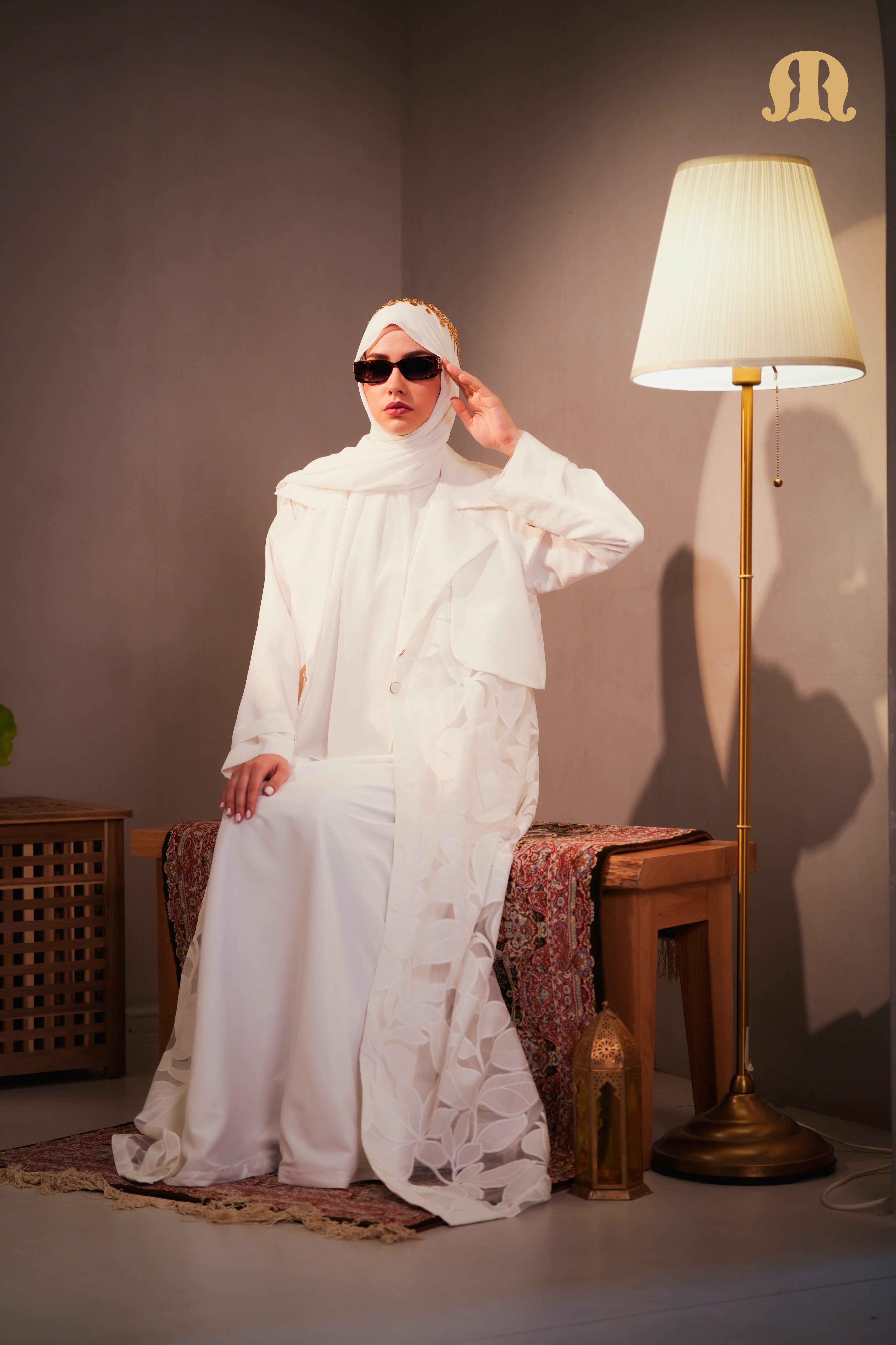 Luxurious ivory brasso fabric for an elevated touch Trench - inspired design with a polished silhouette Versatile elegance for any occasion Perfect for those who value understated sophistication Embrace the timeless charm of the Jardin Abaya – Where classic style meets modern grace."