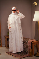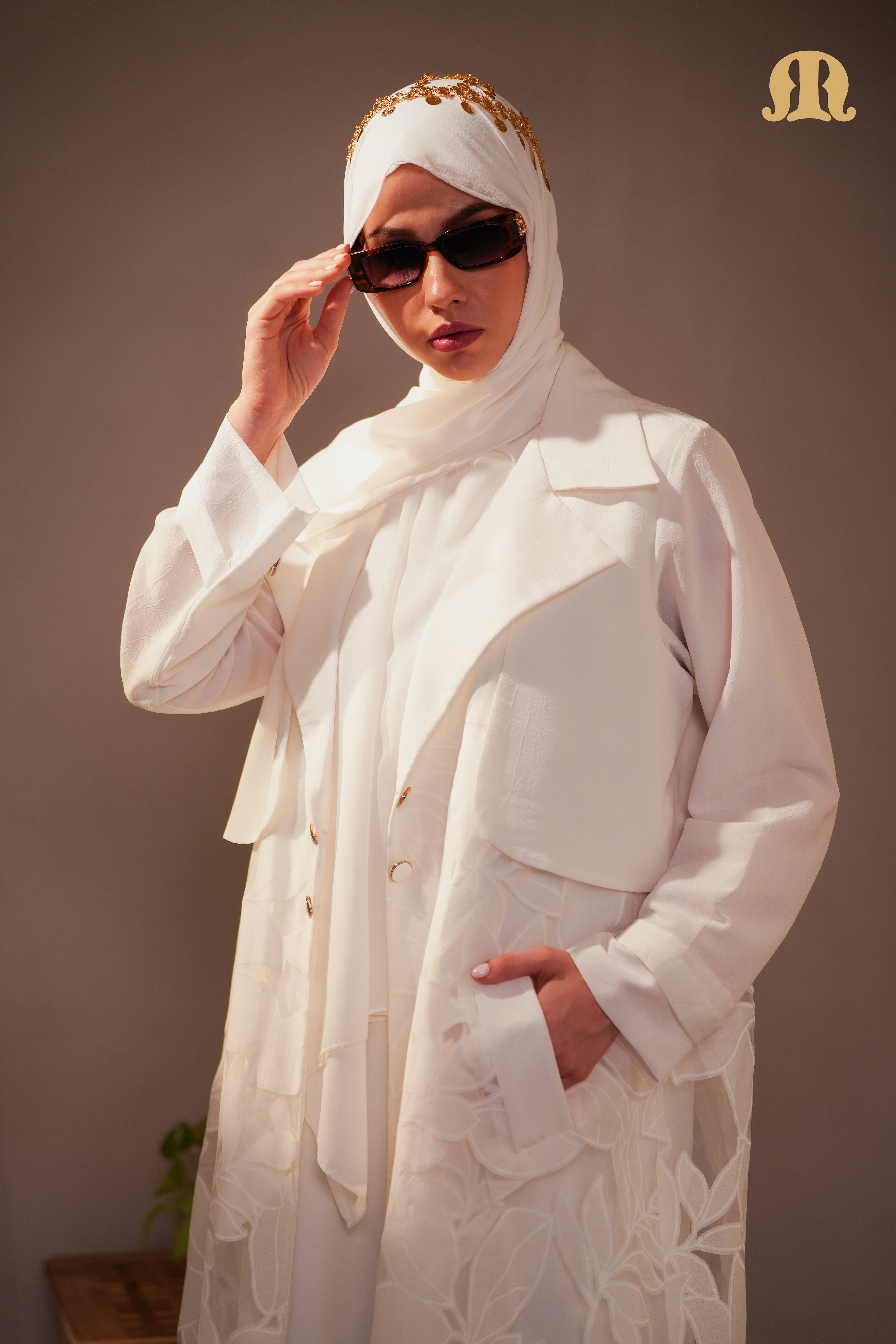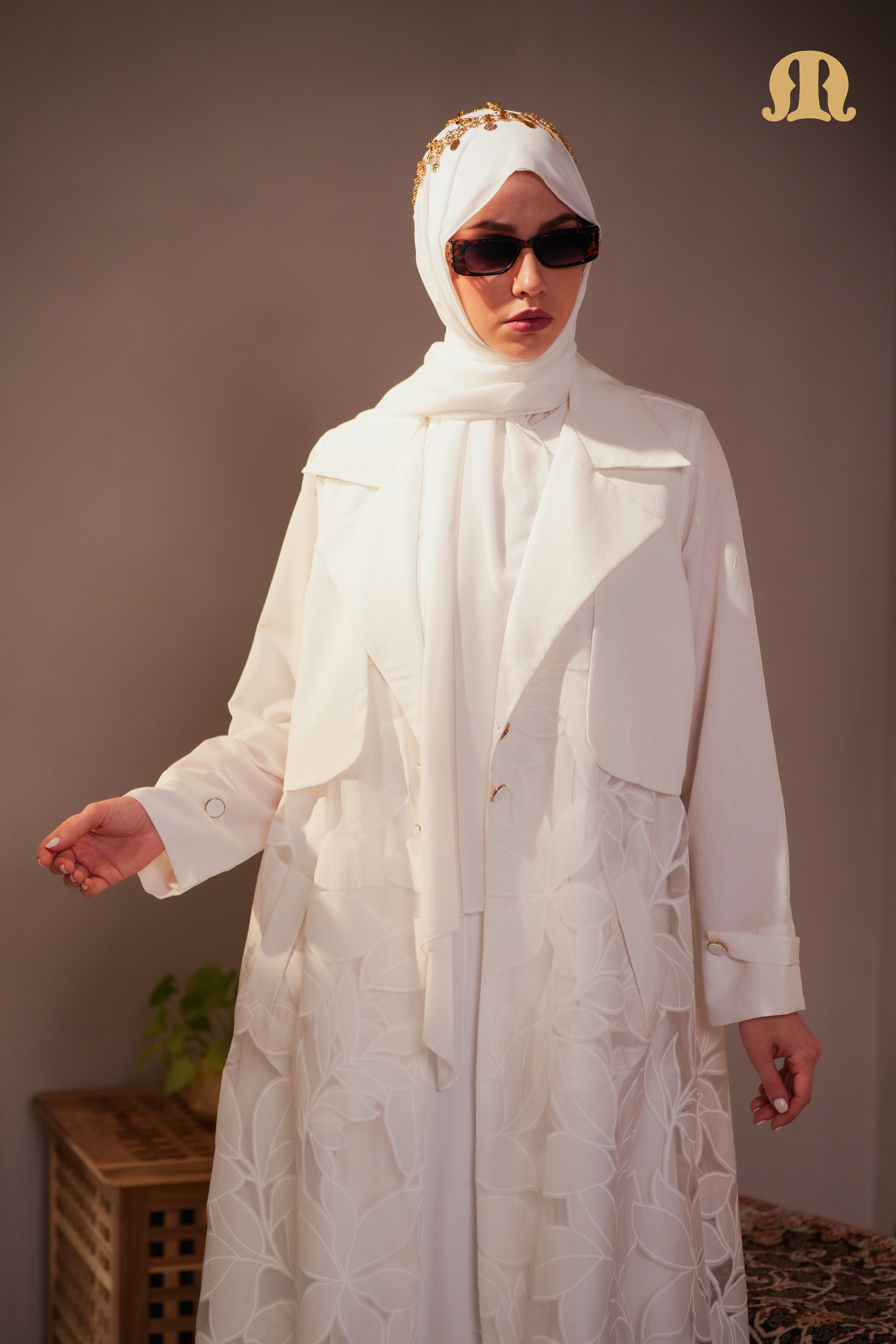 Trench Coat The Jardin Abaya merges chic trench coat style with luxurious ivory brasso fabric, creating a classic silhouette that exudes modern sophistication. Ideal for adding elegance to any ensemble, this abaya is a timeless staple for refined wardrobes.