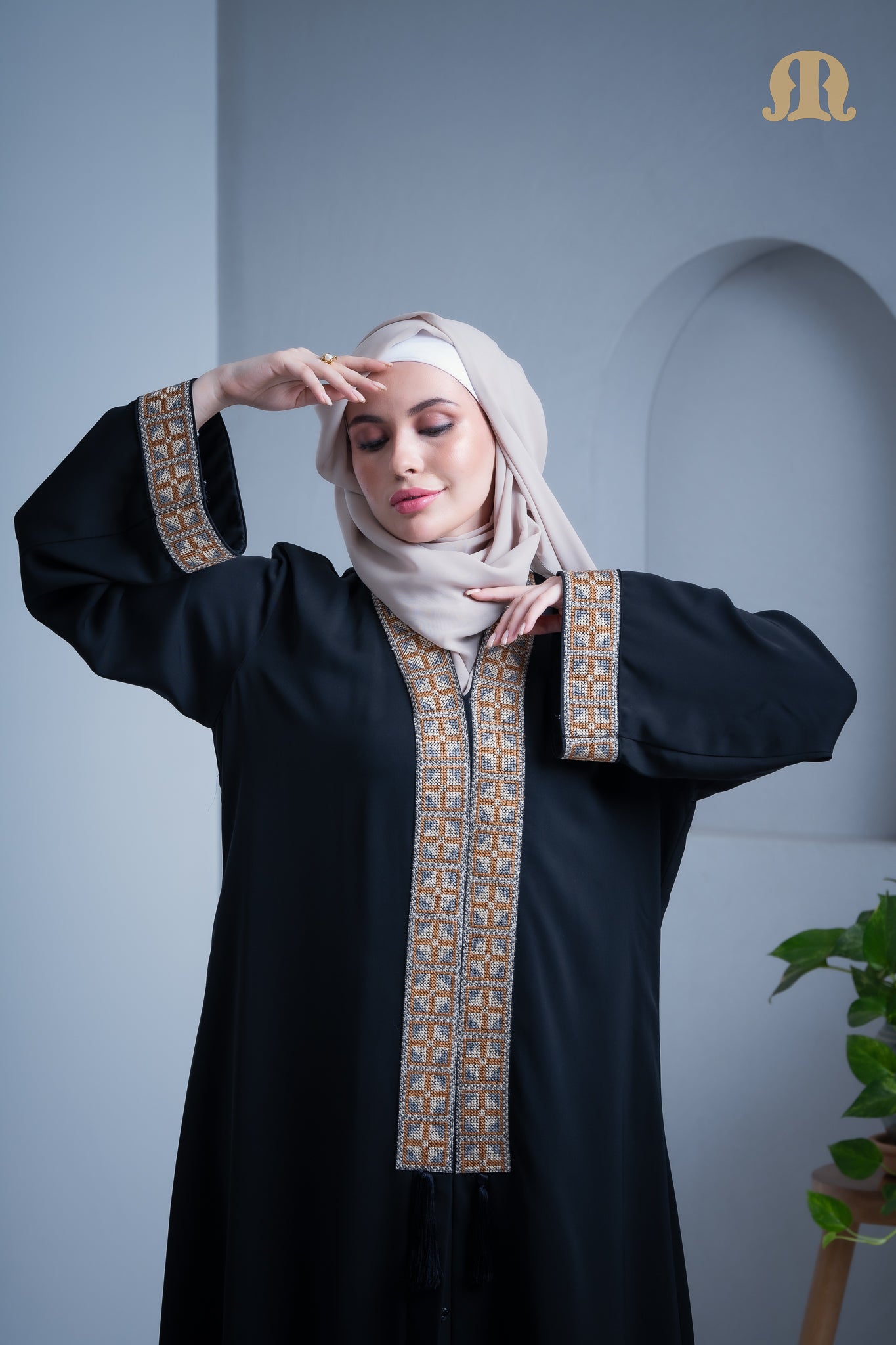 Adorned with intricate cross-stitch lace on the sleeves and neckline, the Elmas Abaya introduces a delicate touch of artistry that elevates its classic design. The cross-stitch lace adds a layer of sophistication, showcasing Mashroo’s dedication to fine detail and quality. Accentuating the front are chic tassels, which lend a contemporary edge to the traditional abaya, making it a versatile choice for various settings.