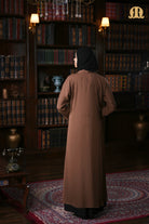 The front-close design features a lapel flap with a chic leather buckle, giving this abaya a contemporary edge. The roll-up sleeves with golden fancy buttons on both sides add a refined touch, perfect for transitioning effortlessly from formal gatherings to casual outings.