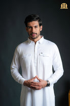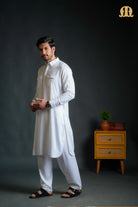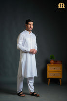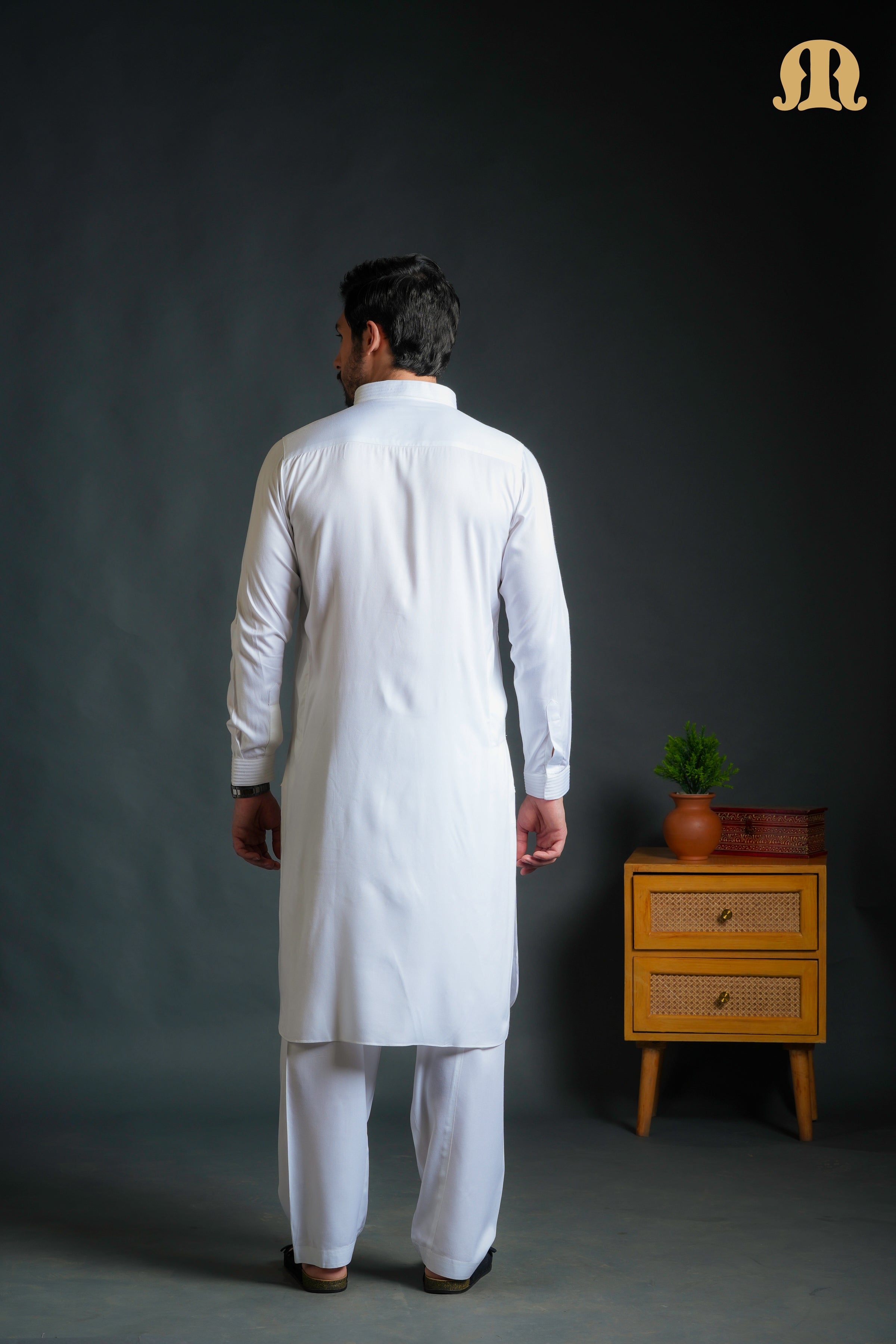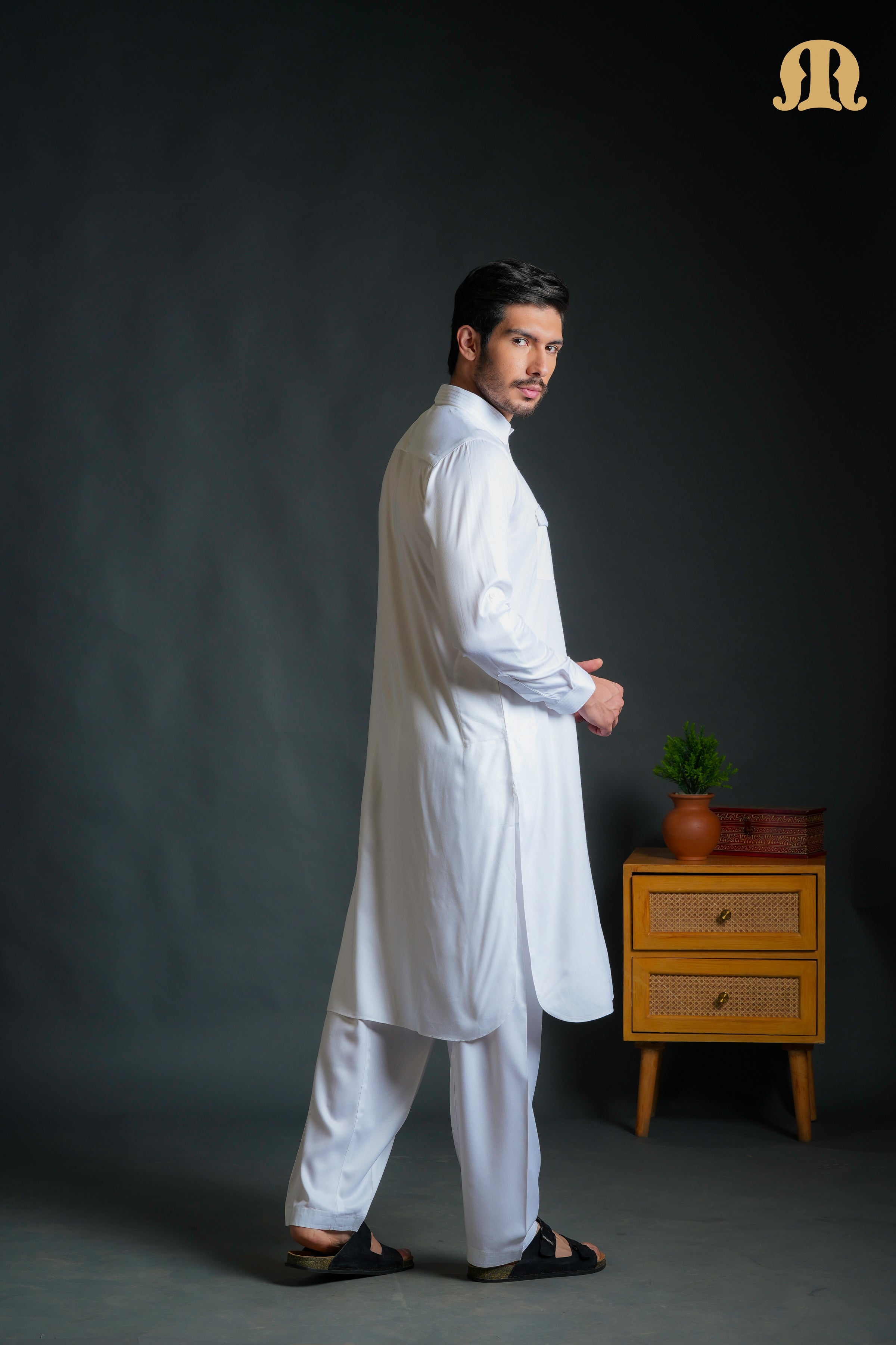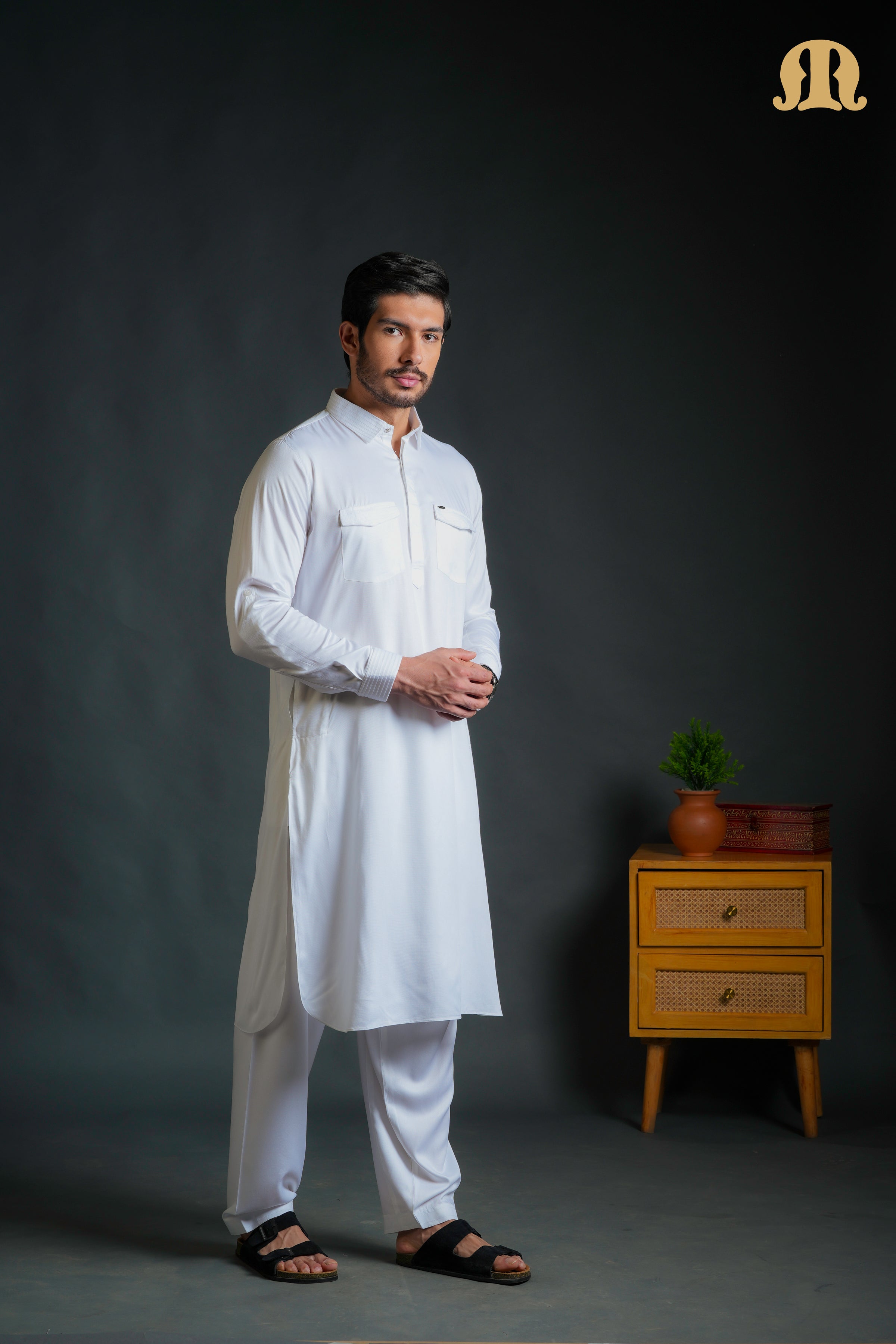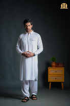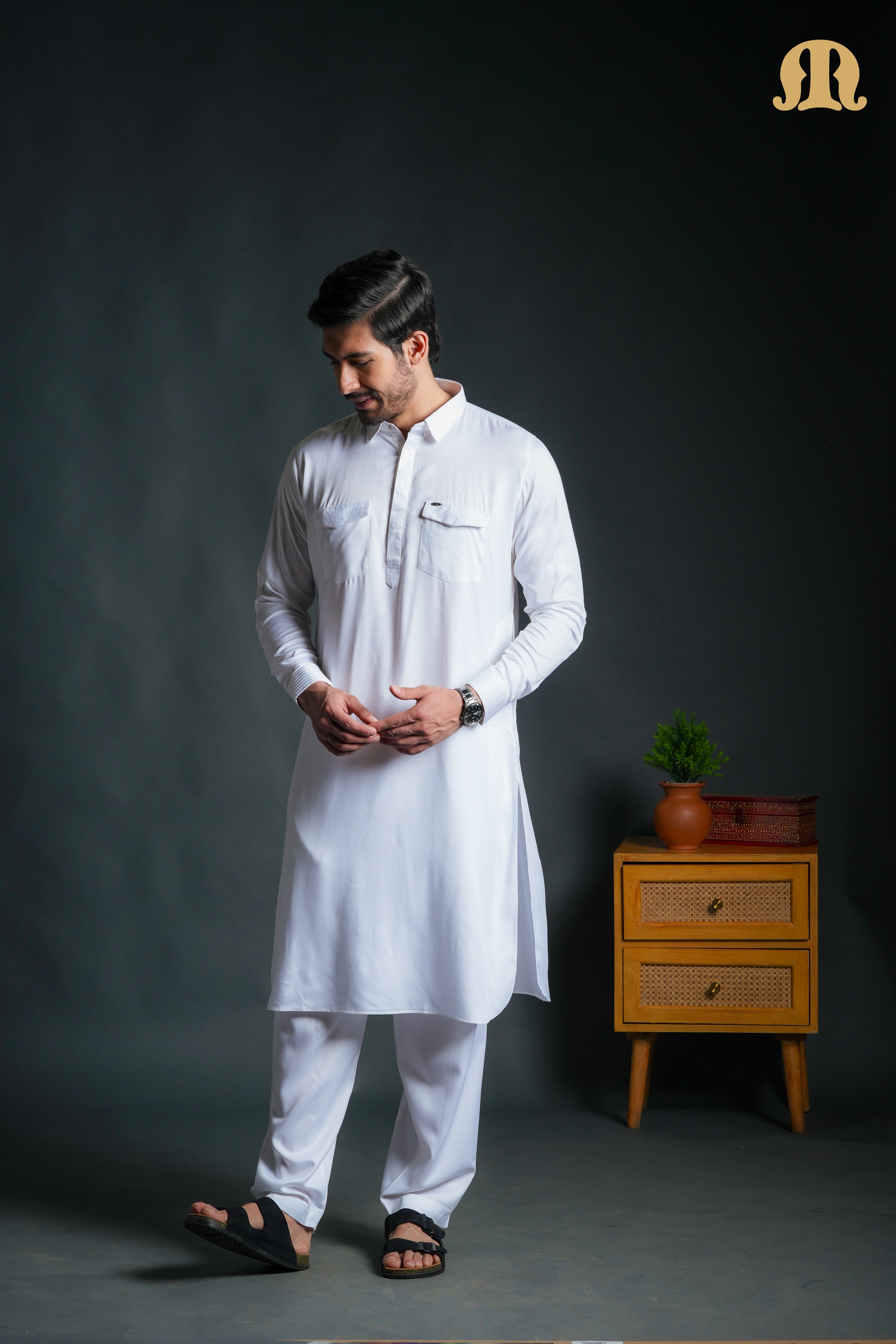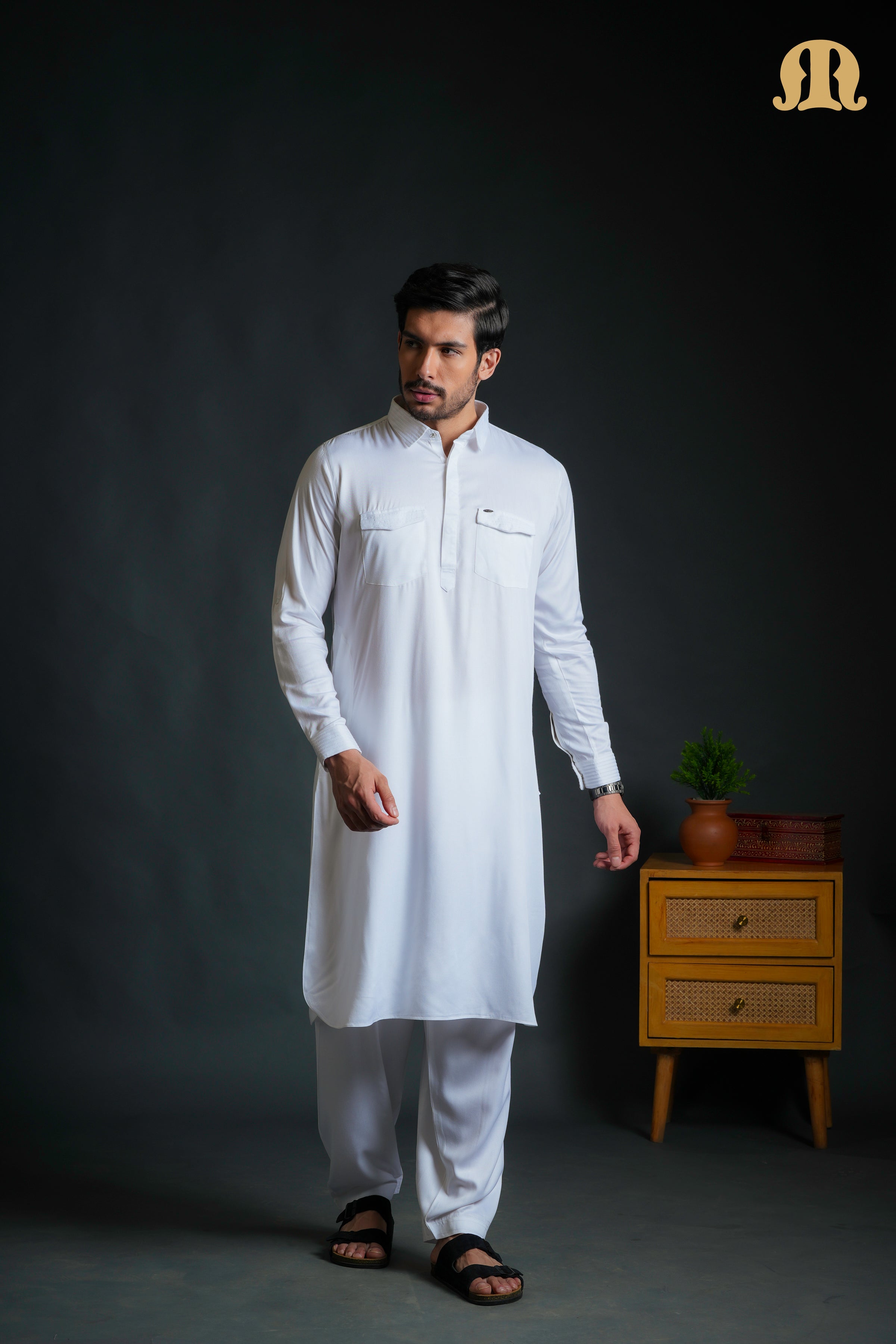 Make a bold yet refined statement with the Kikan White Pathani Set, tailored from premium viscose fabric for a smooth feel and elegant drape. Designed with a shirt-style collar and cuffs, this set delivers a sharp, contemporary Pathani look while ensuring all-day comfort.