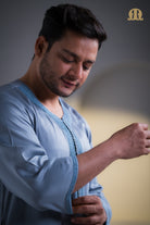 Introducing the Erkek Moroccan Thobe by Mashroo, an exquisite piece that brings together traditional Moroccan design and modern elegance. This thobe is crafted from shining premium poly-cotton, offering a luxurious and comfortable fit that is both durable and breathable. The stunning grey fabric is complemented by intricate grey embroidery across the neck, placket, and sleeves, adding a touch of sophistication and artisanal charm.