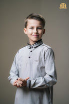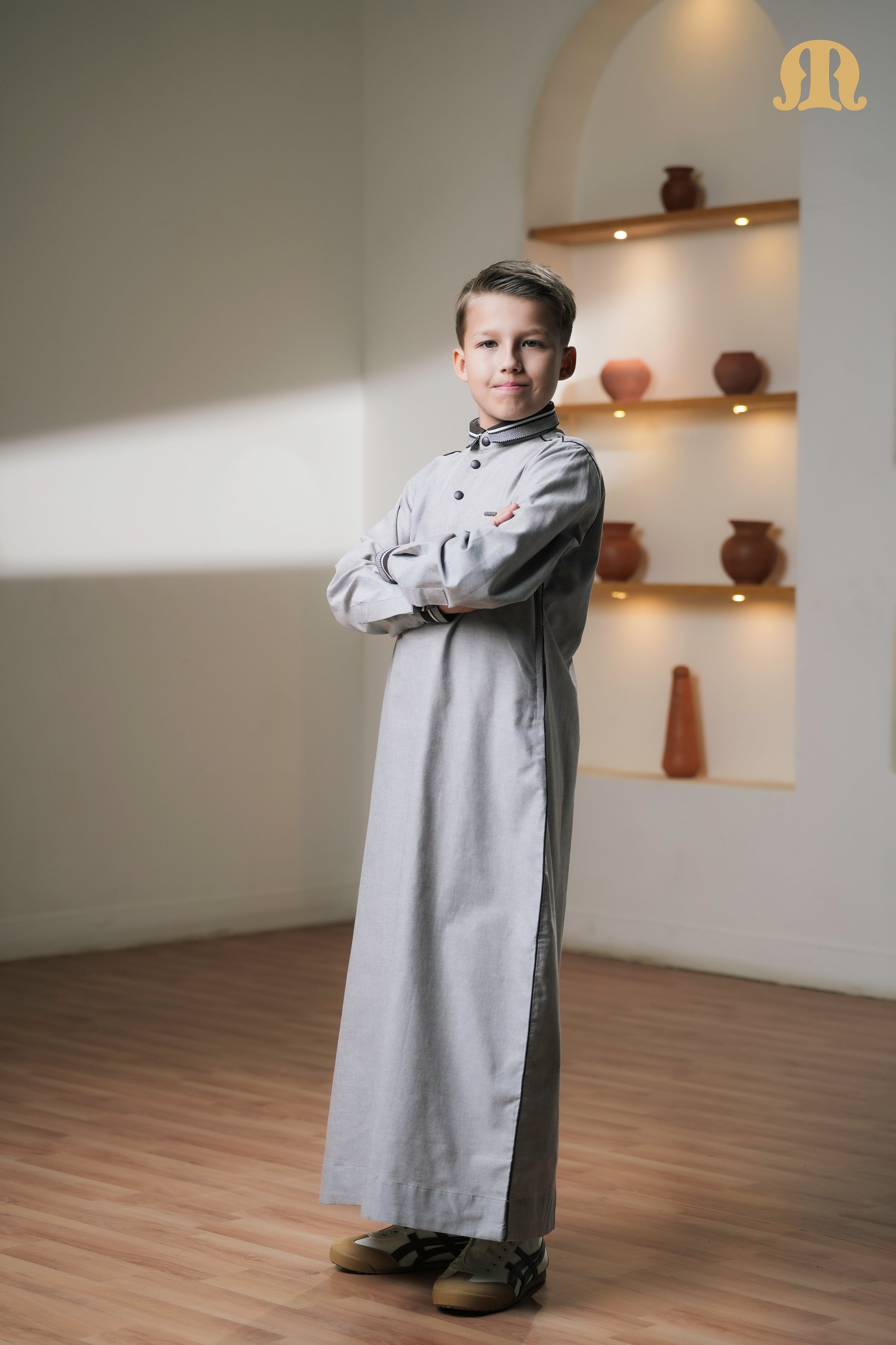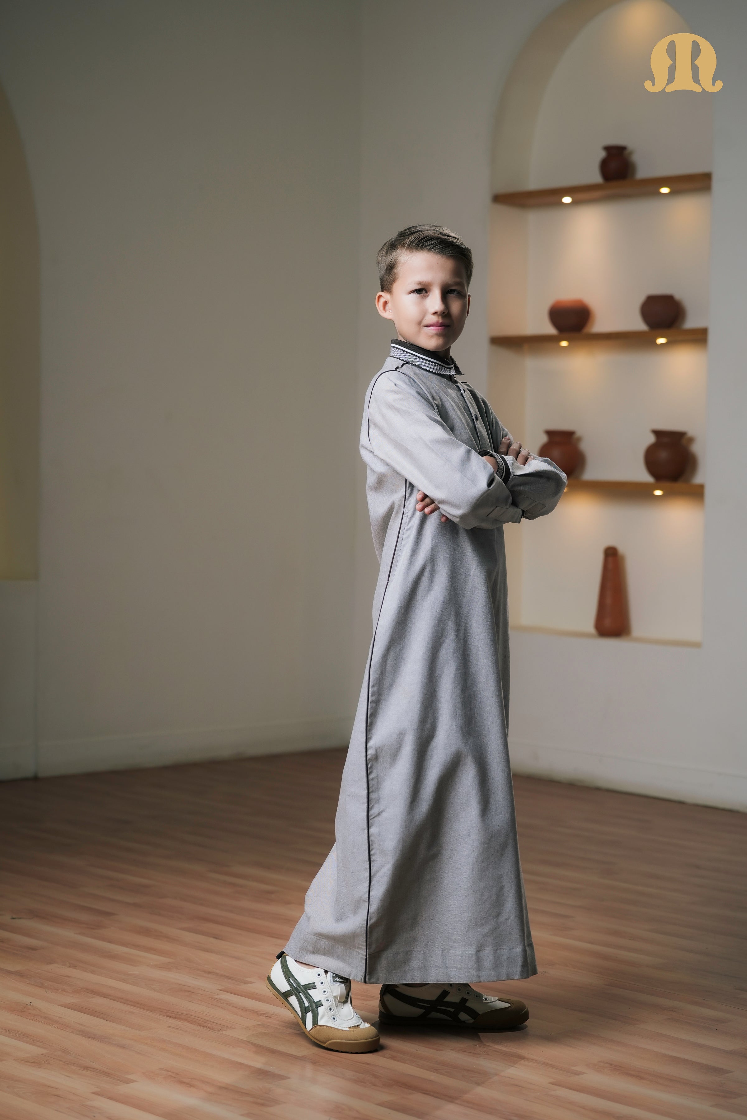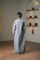The Brown Akomos Thobe is crafted from soft, light brown polycotton fabric, offering a comfortable and refined fit. It features a stretchable shirt collar and cuffs for ease of movement and a tailored look.