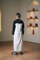 Featuring a hood with adjustable drawstrings, a front zipper, and elastic sleeves, it combines functional design with a sleek, sporty look. The black and white color palette adds a modern edge, making it ideal for casual outings, travel, or relaxed gatherings.