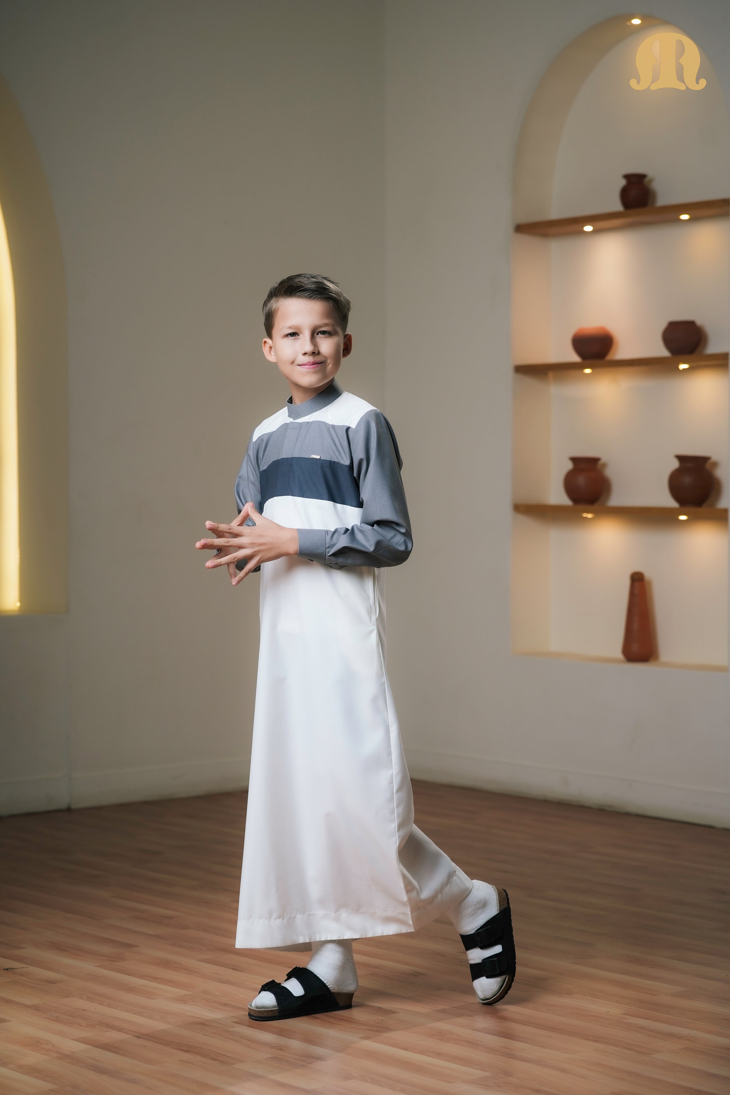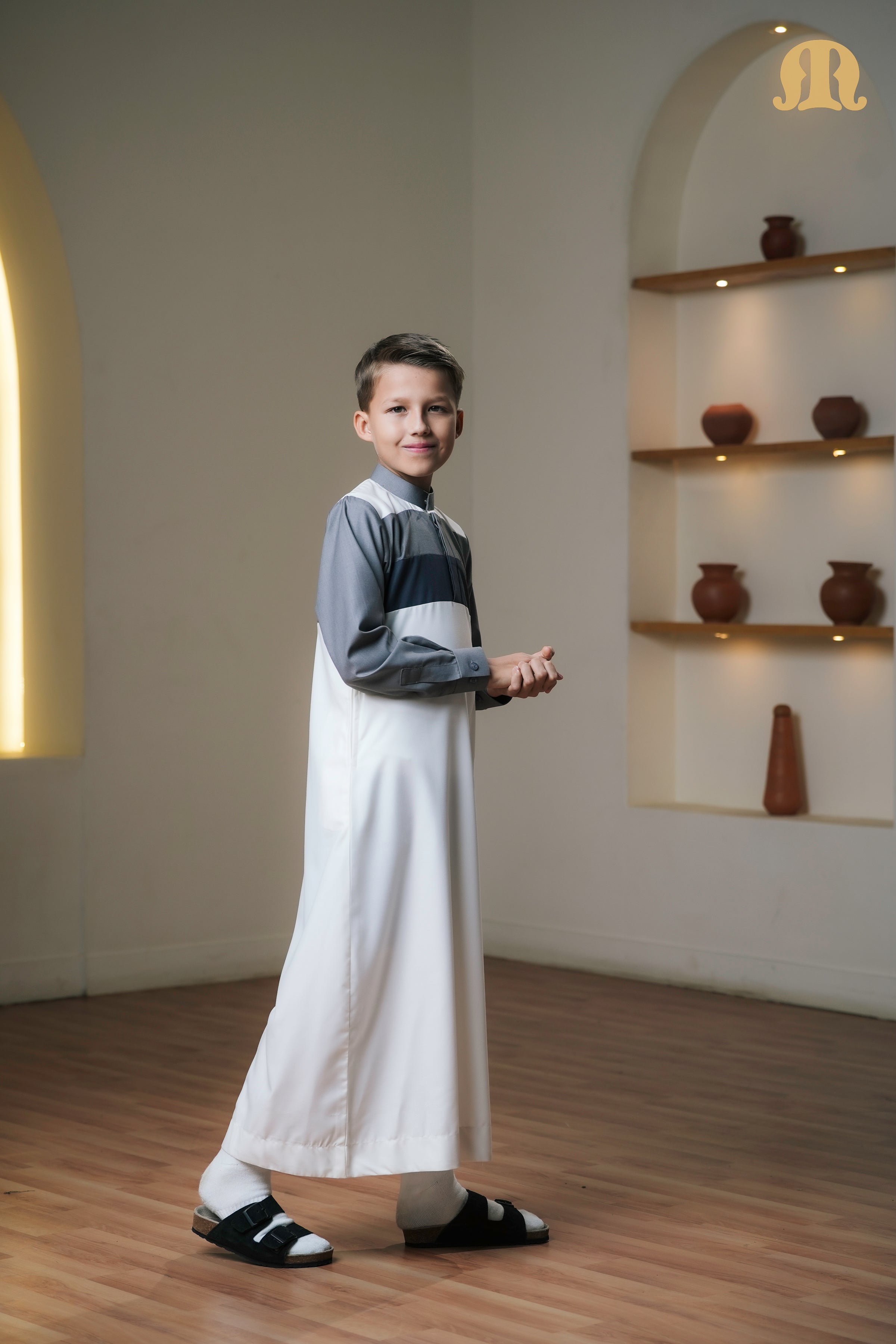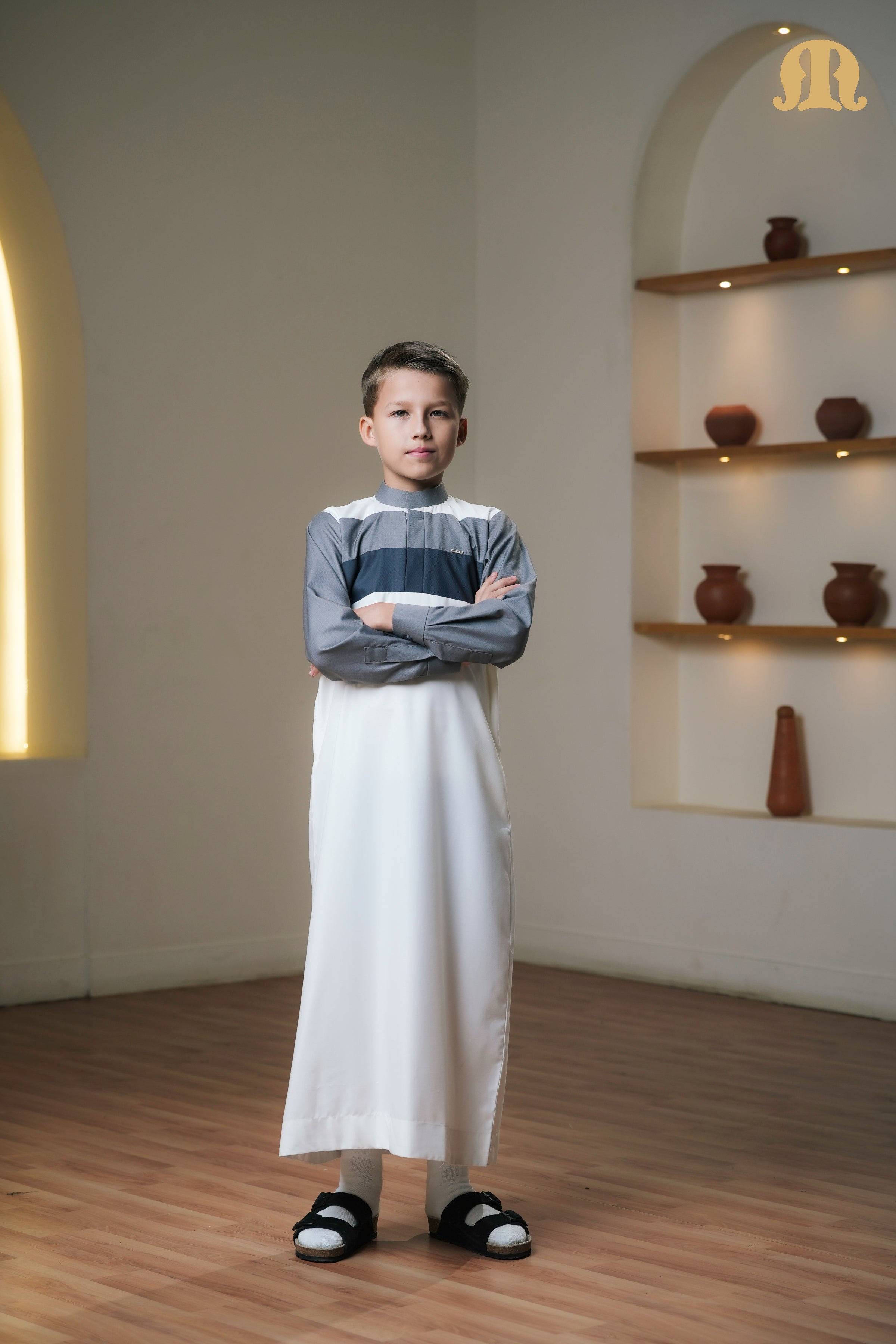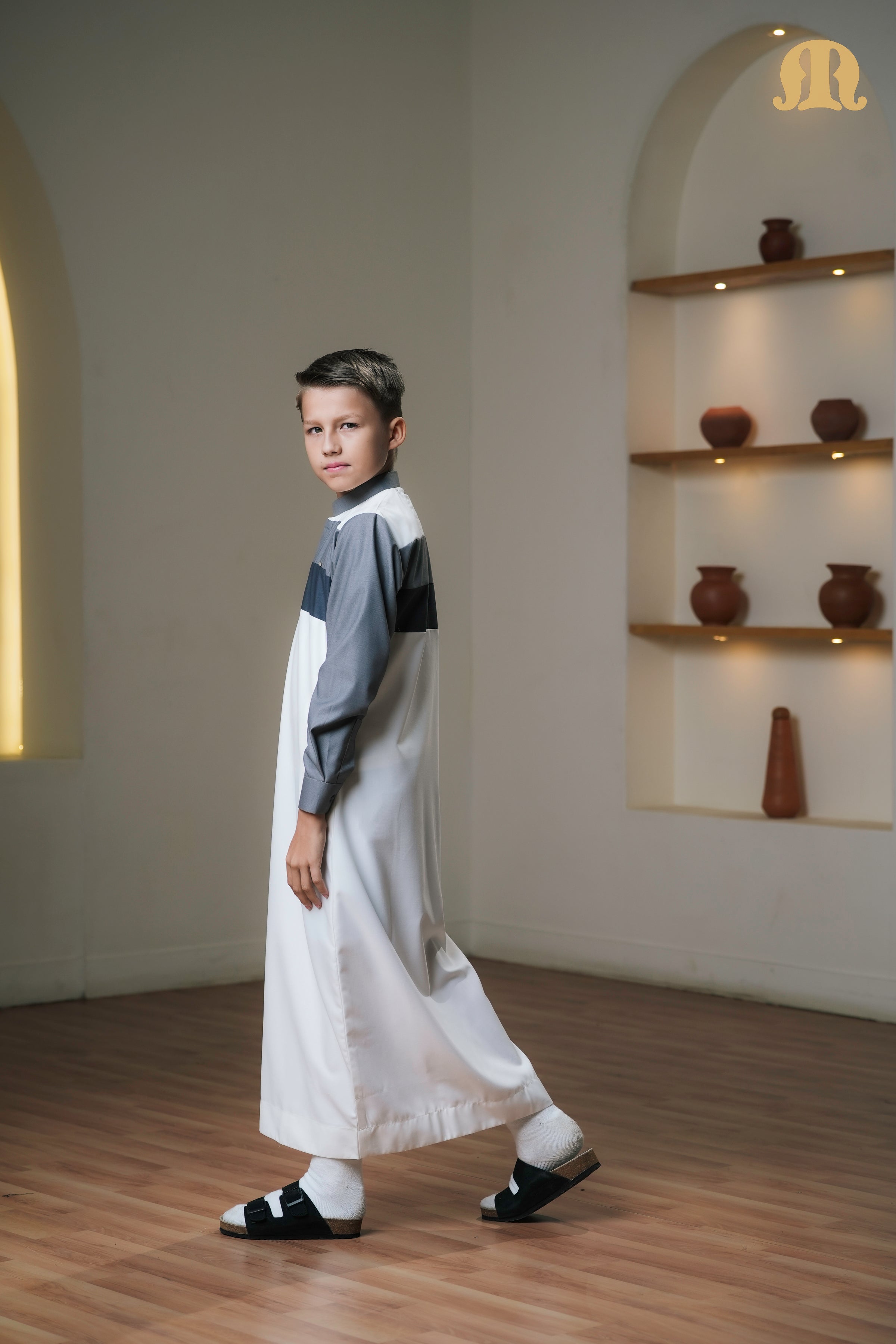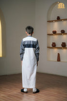 The tri-color fabric in off-white, light brown, and dark grey adds subtle depth and modern flair, while the Mashroo ID on the chest gives it a distinctive signature touch. Perfect for those who value both style and tradition, the Mikros Thobe balances elegance, comfort, and a contemporary aesthetic.