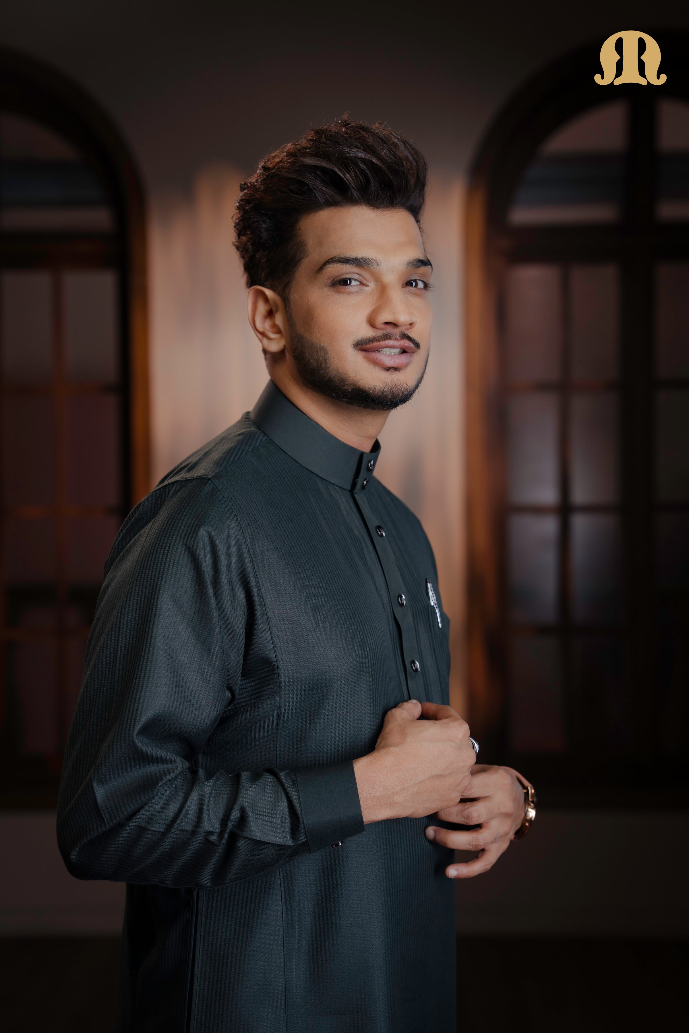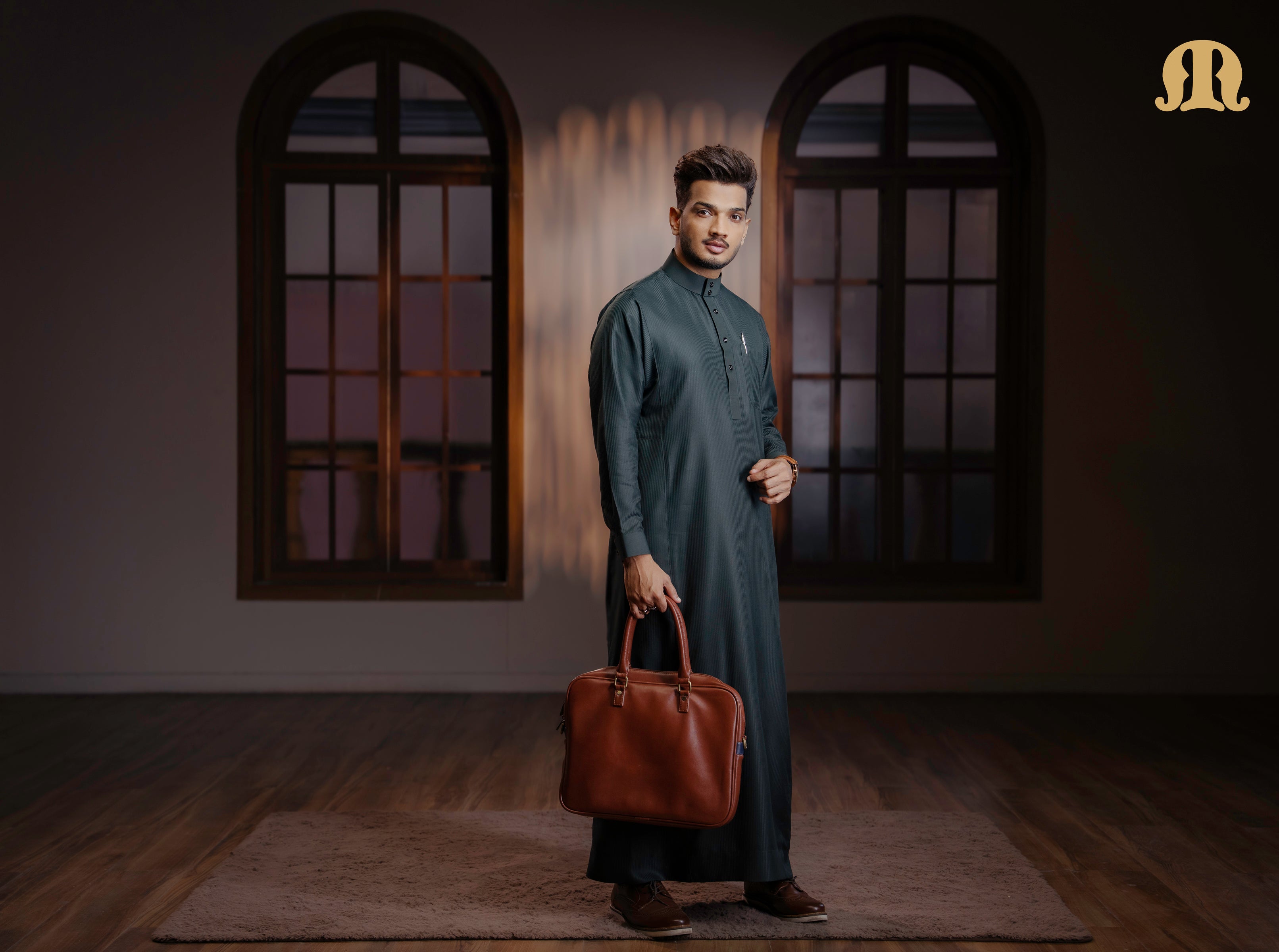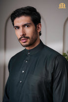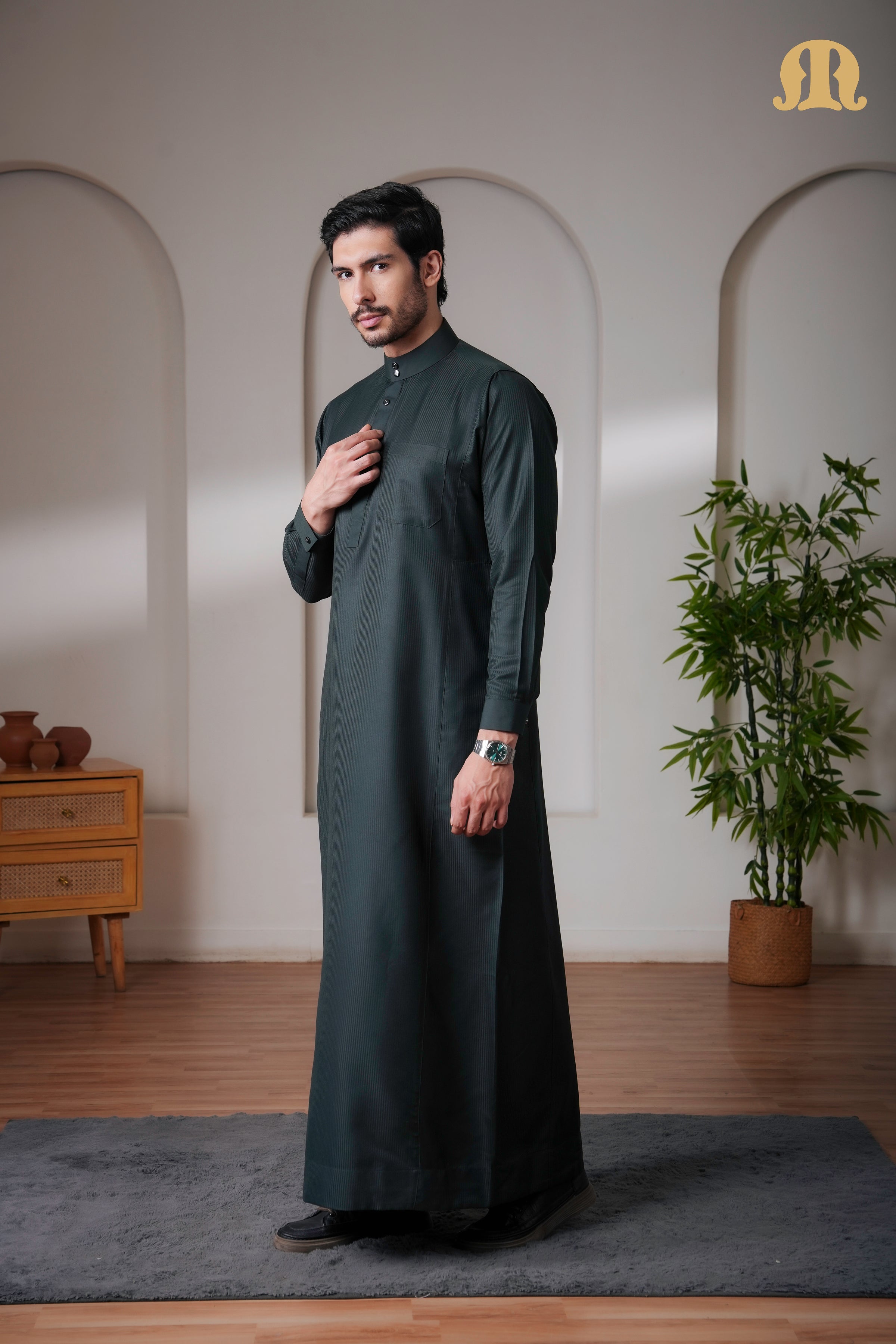 The OZ Striped Green Saudi Thobe is crafted from high-quality polycotton fabric, offering the perfect balance of comfort, durability, and breathability. Designed in a classic Saudi silhouette, it features a sleek band collar accented with a metal button, complemented by a refined front placket with metal button detailing for a polished finish.