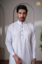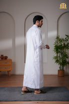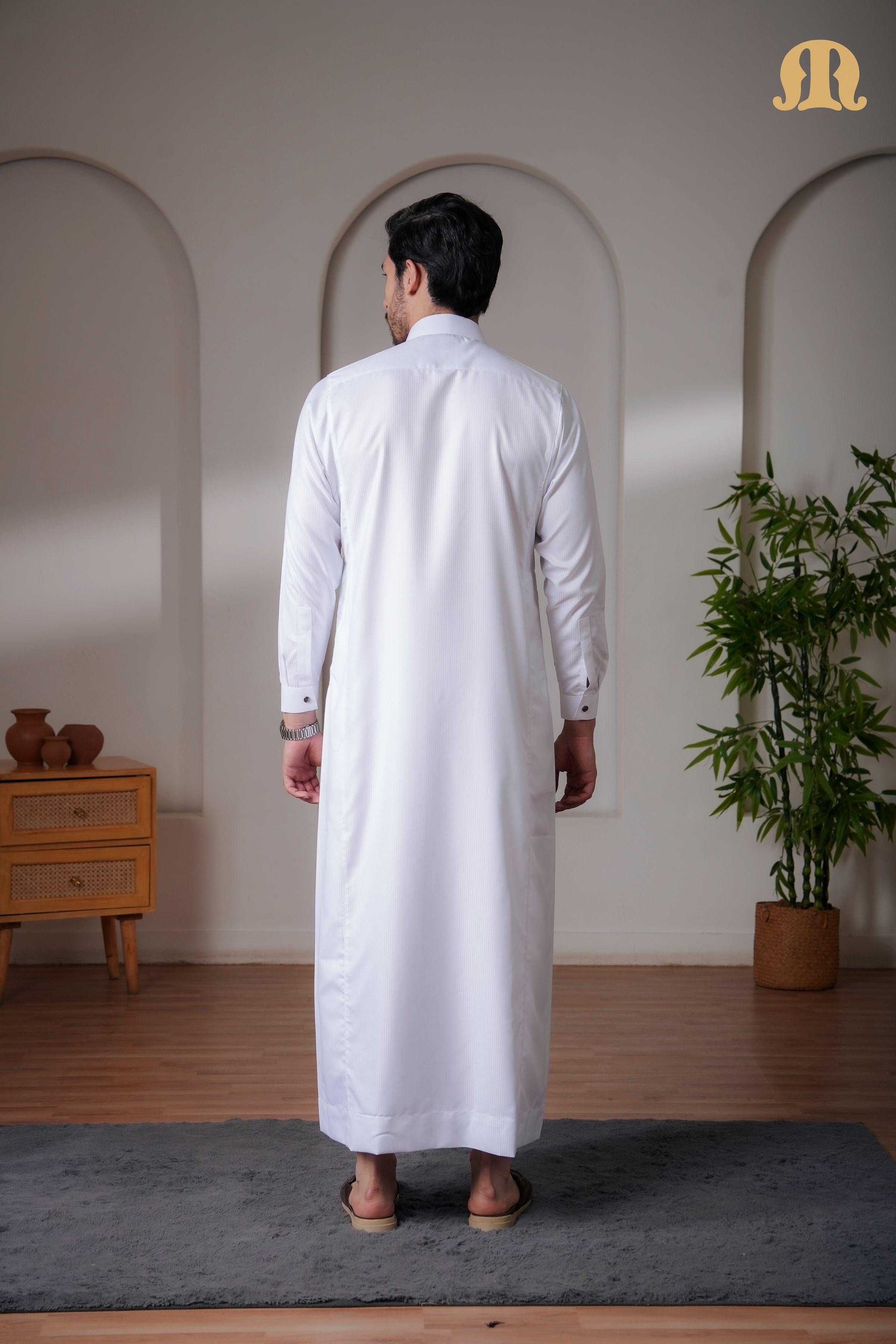 The OZ Striped White Saudi Thobe is crafted from high-quality polycotton fabric, offering the perfect balance of comfort, durability, and breathability. Designed in a classic Saudi silhouette, it features a sleek band collar accented with a metal button, complemented by a refined front placket with metal button detailing for a polished finish.