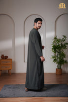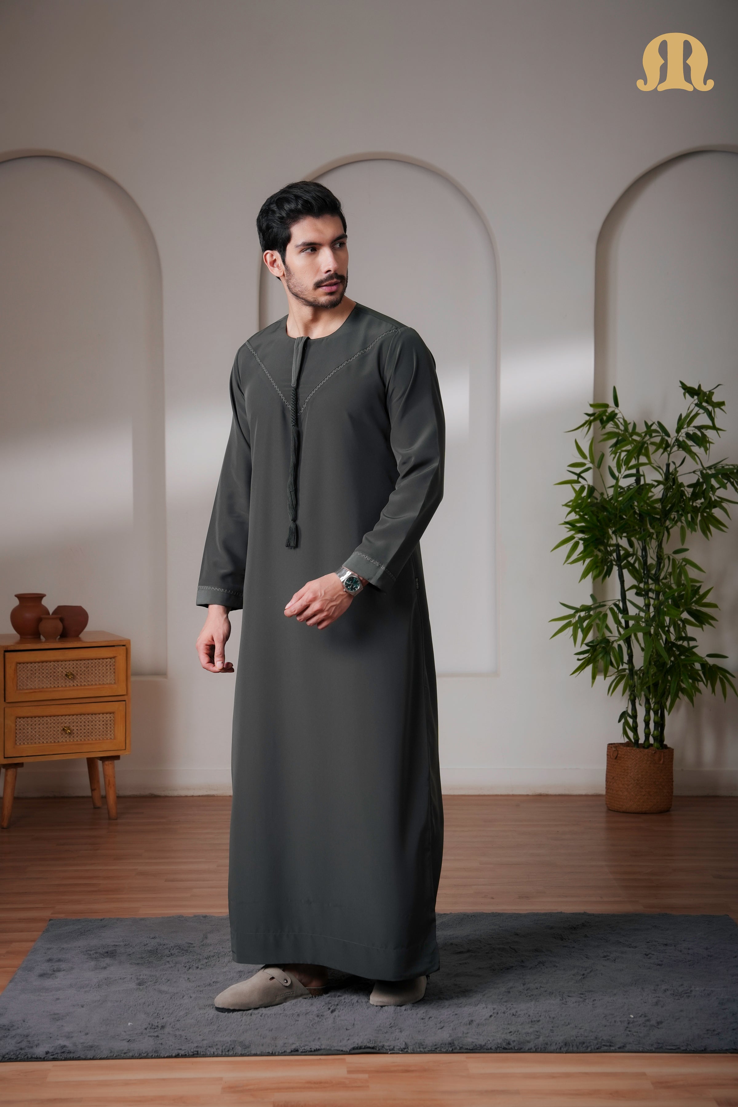 The design is elevated by front tassels at the neckline, adding a traditional touch, while subtle embroidery on the front and sleeves enhances the thobe with understated sophistication. These fine details provide depth and character without overpowering the minimalist aesthetic.