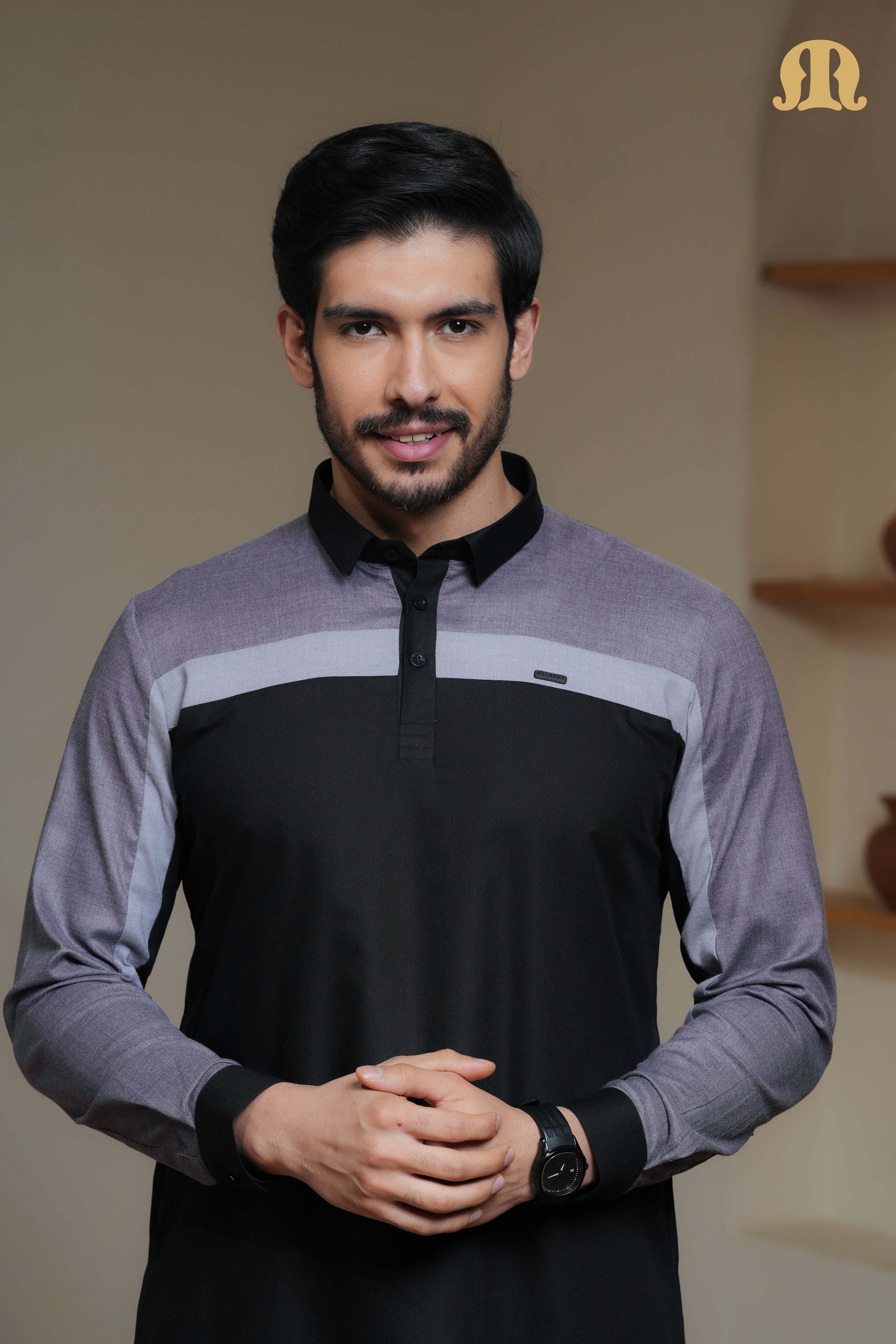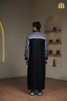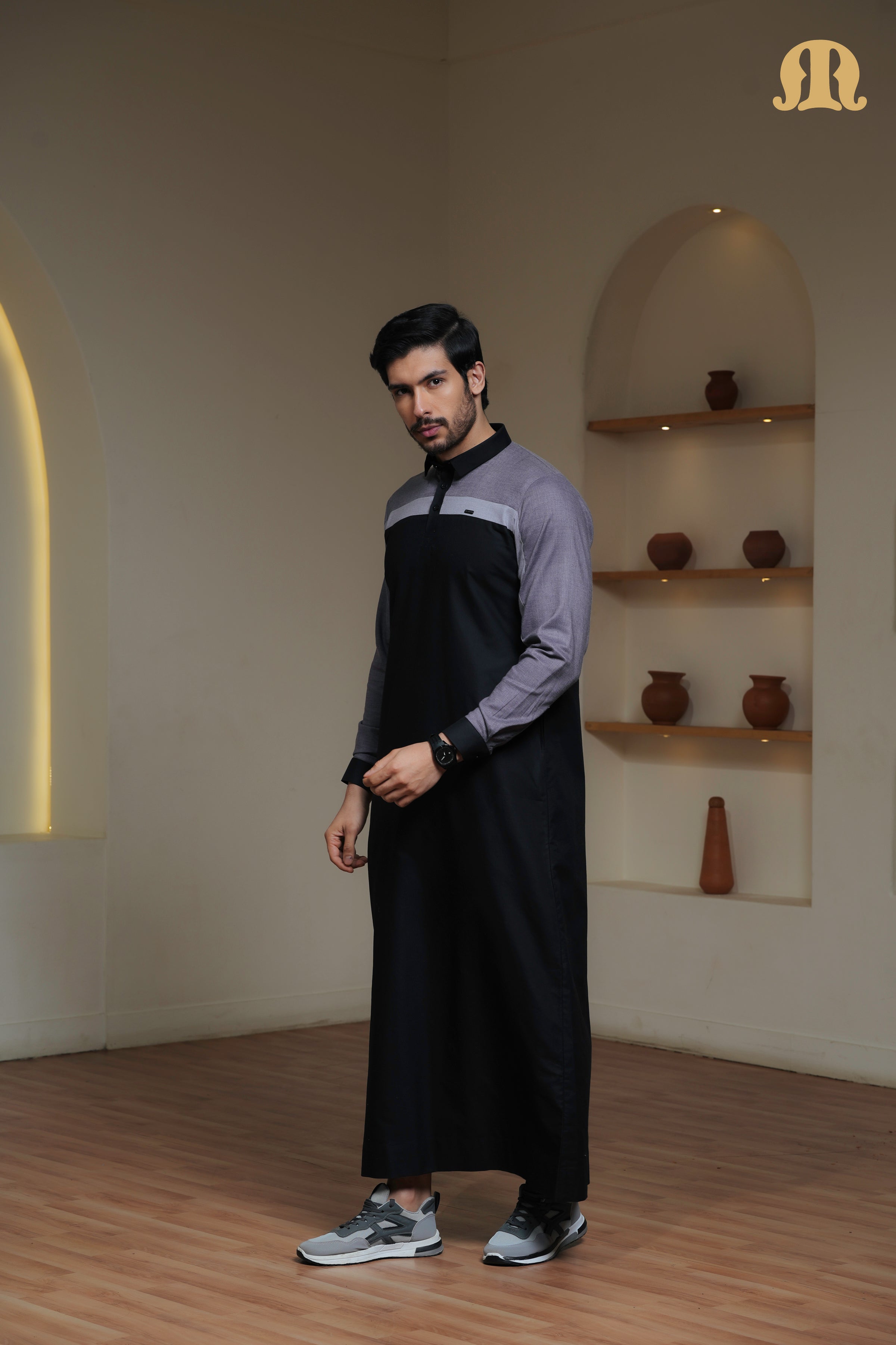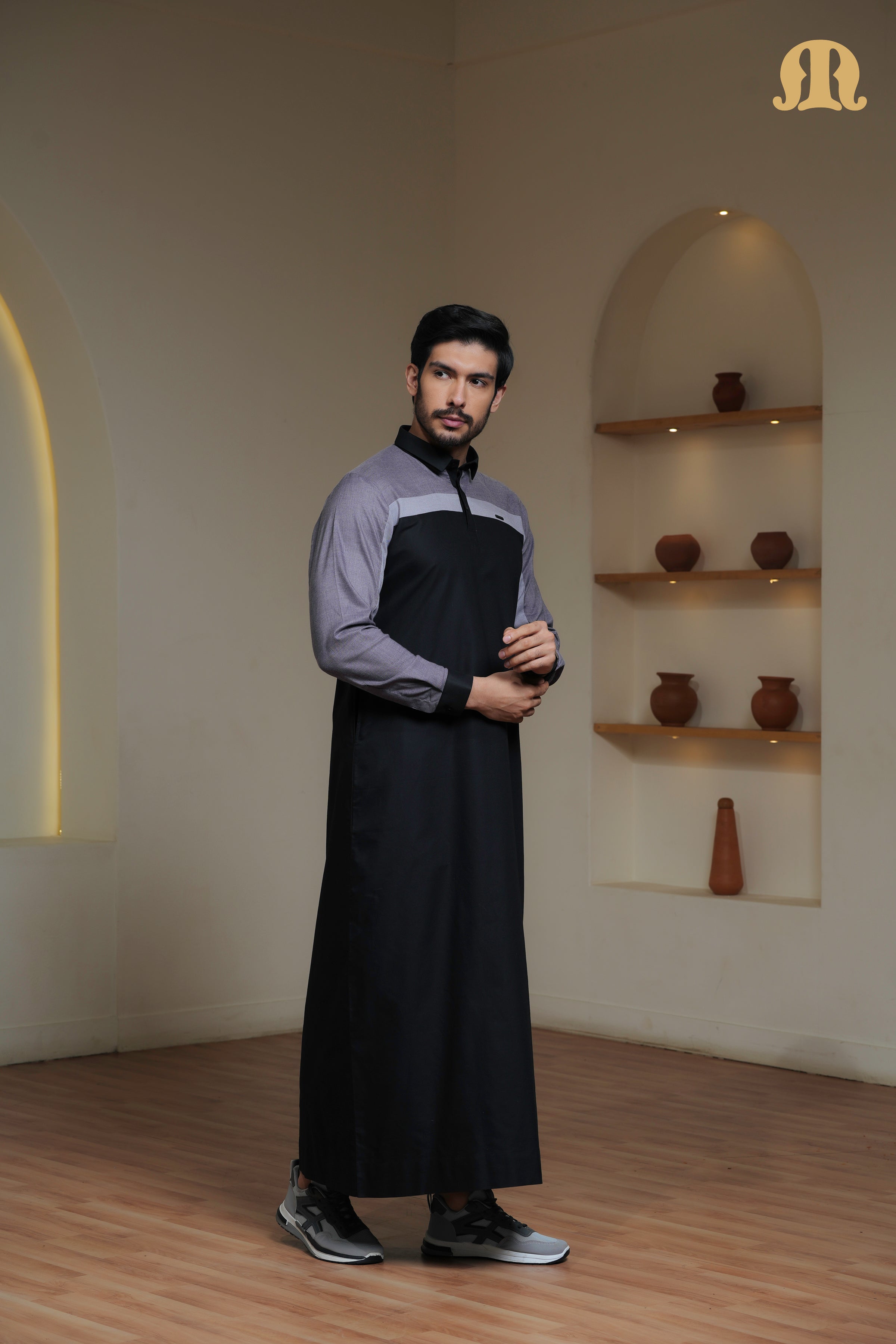 The Pequero Thobe is crafted from premium polycotton fabric in a sophisticated tri-color palette of purple, grey, and black, offering a modern yet refined aesthetic. It features a shirt-style collar and cuffs along with a front placket, delivering a crisp, formal look suitable for professional and special occasions.
