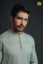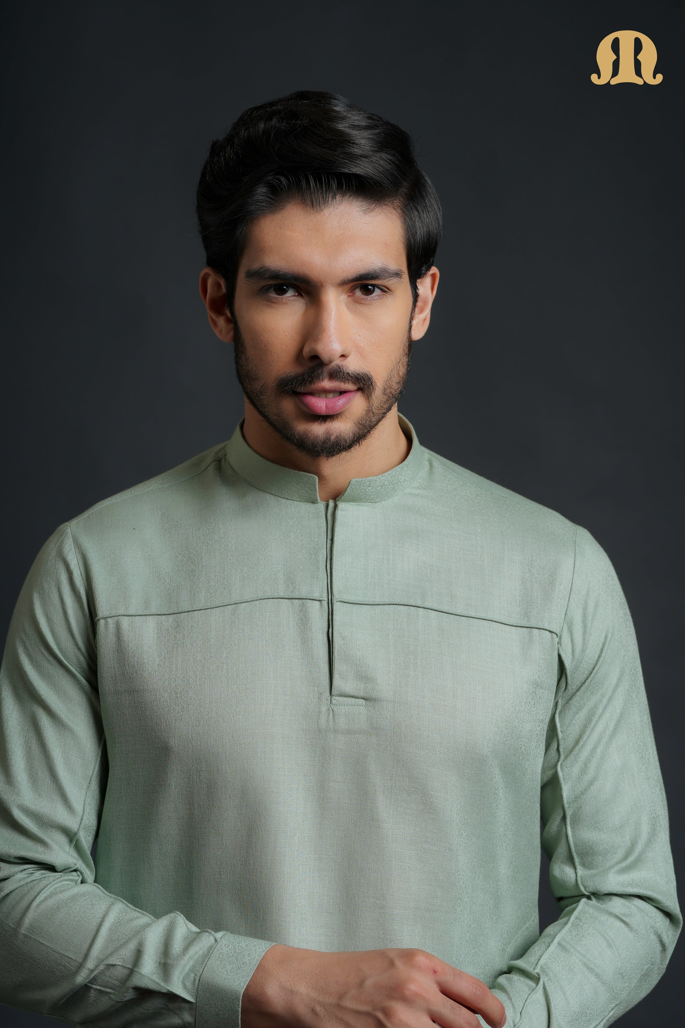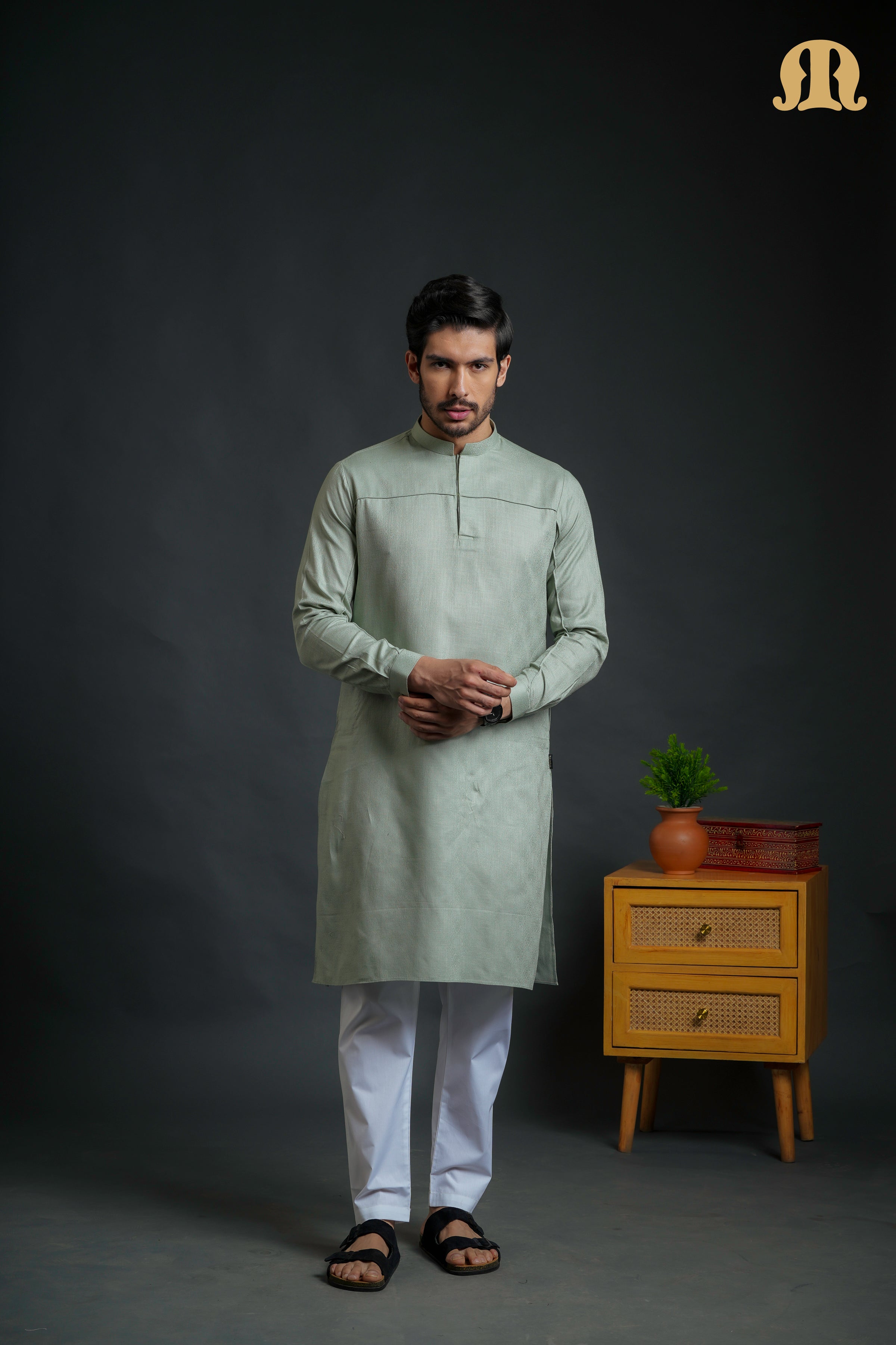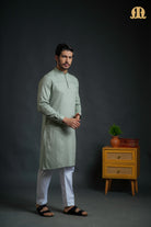 It features a classic band collar with neatly tailored cuffs, enhanced by self-coloured piping running across the chest and along the sleeves, adding a distinctive yet understated design element. The kurta is paired with a straight-fit white pajama, creating a crisp contrast that completes the look with sophistication.
