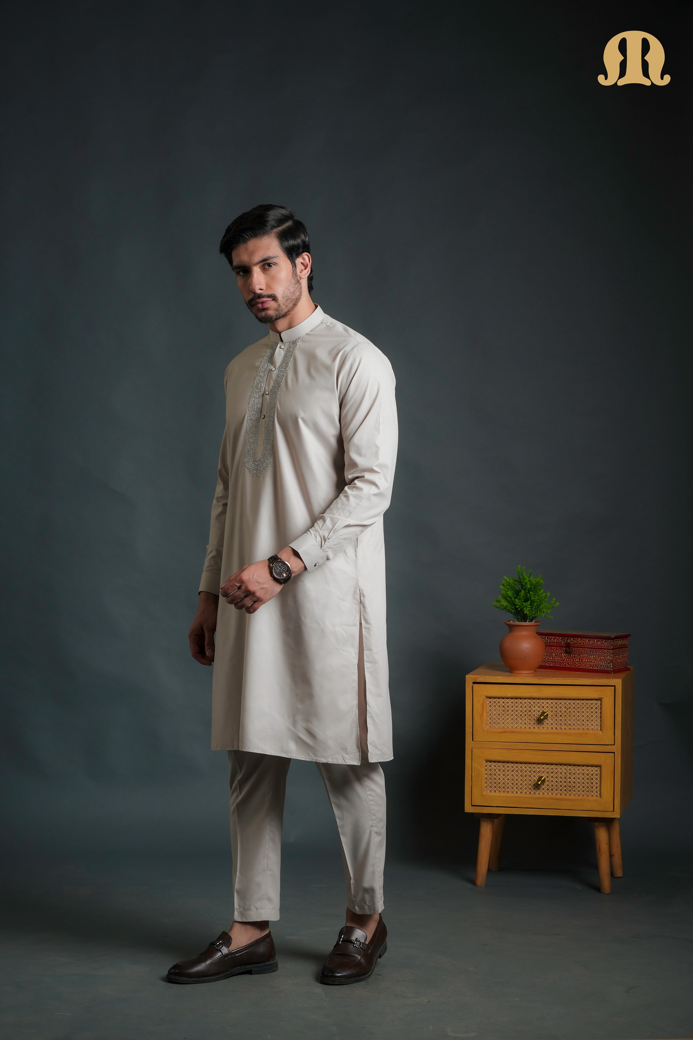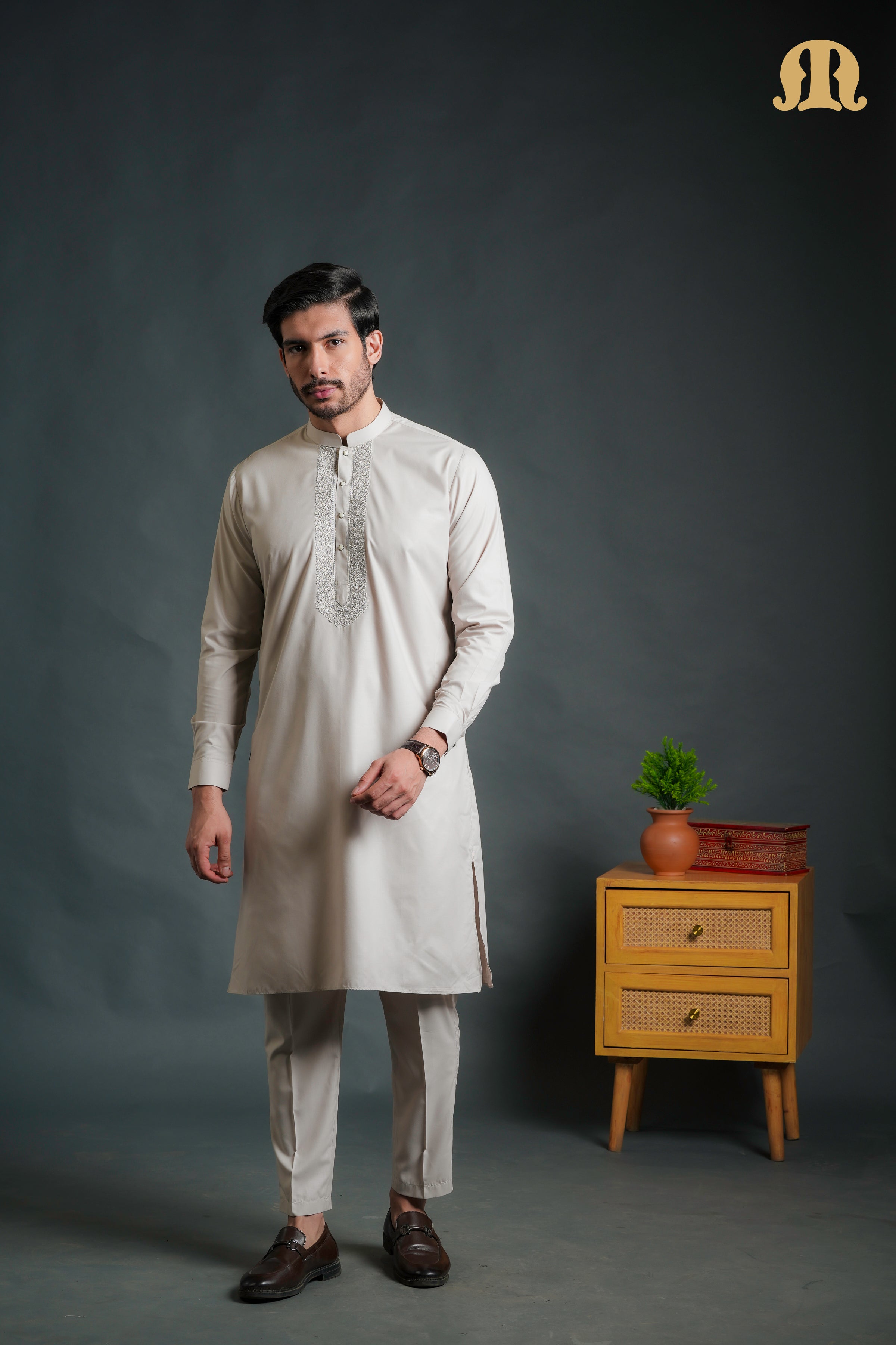 The kurta features a classic band collar with neatly tailored cuffs, while the delicate embroidery along the front placket adds an elegant touch of detailing without overpowering the design. It is paired with a straight-fit pajama in the same color, creating a cohesive and sophisticated ensemble.
