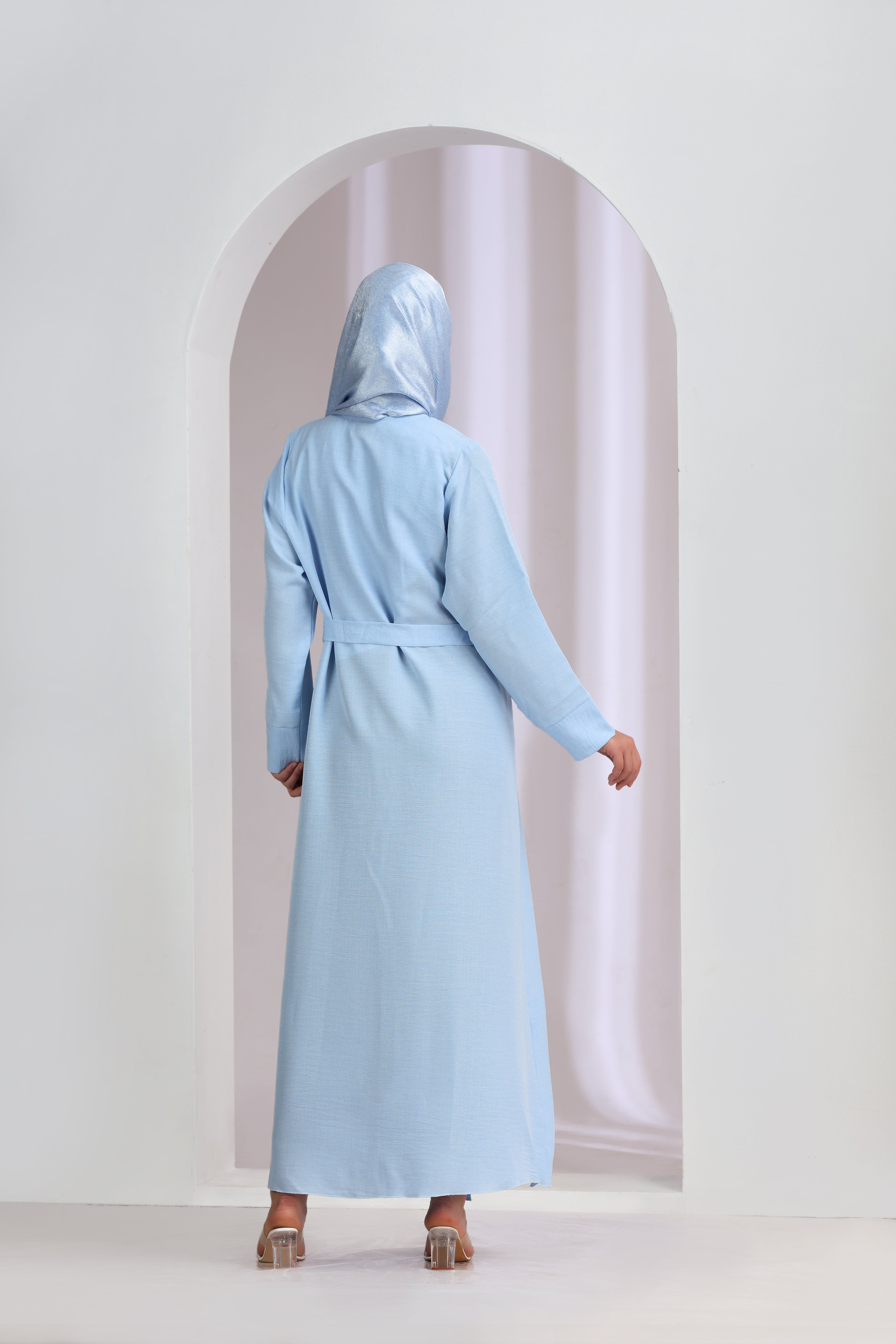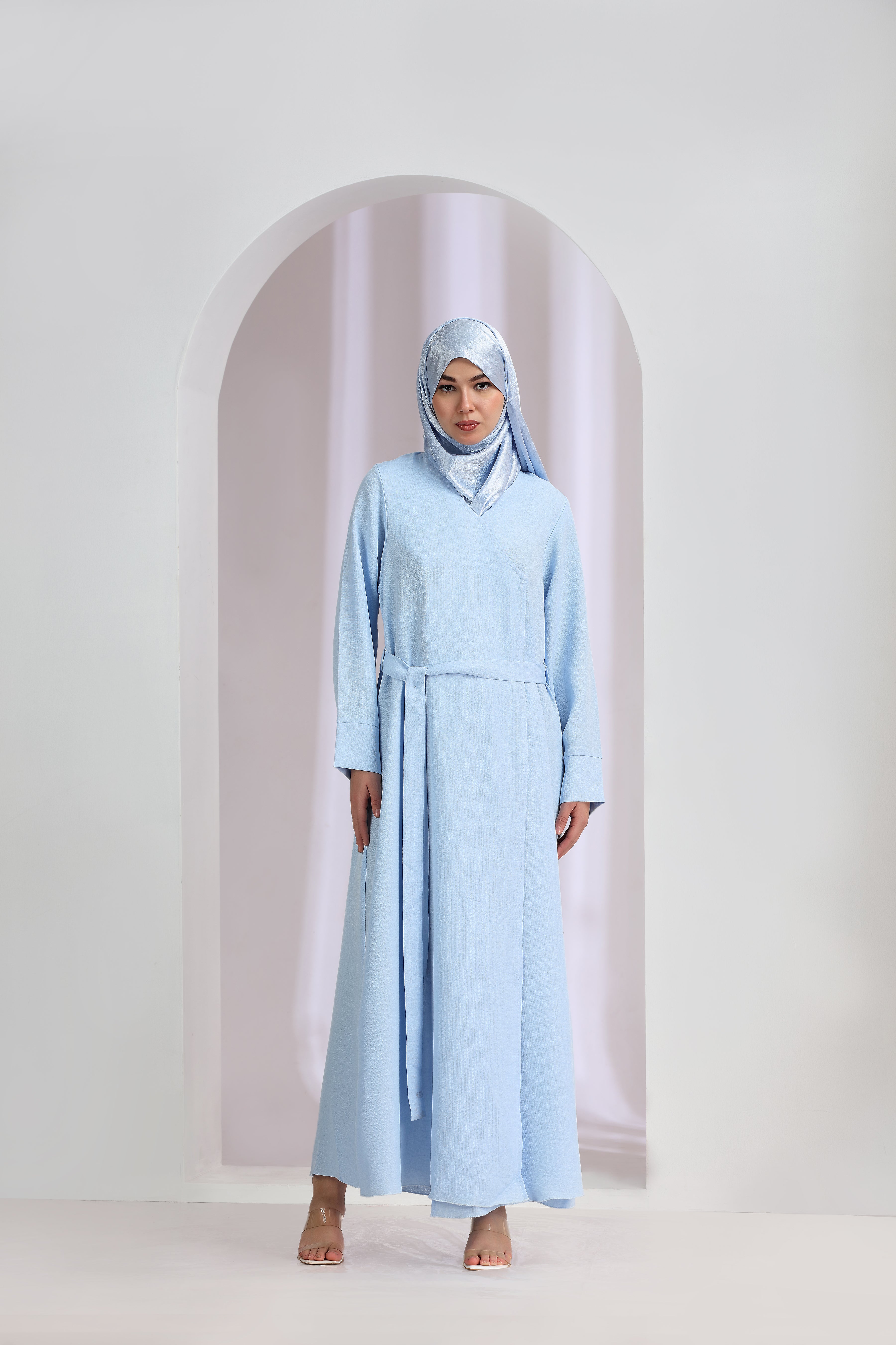 The STELLA Abaya is a refined expression of modern modest fashion. Designed with a clean wrap-style neckline and a matching waist belt, this full-length abaya creates a graceful, flattering silhouette while maintaining complete modesty. Its minimalist design makes it a timeless wardrobe essential.