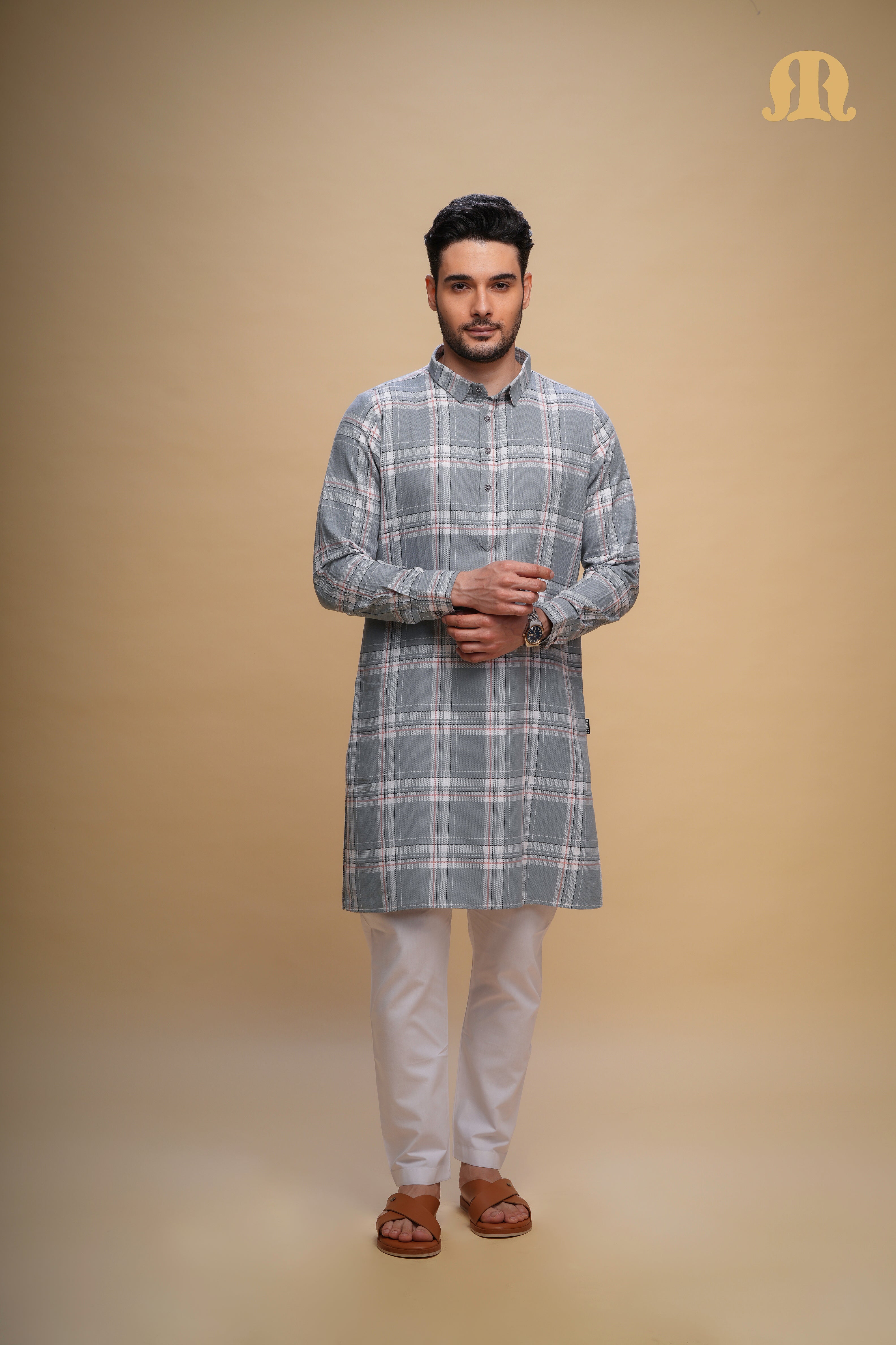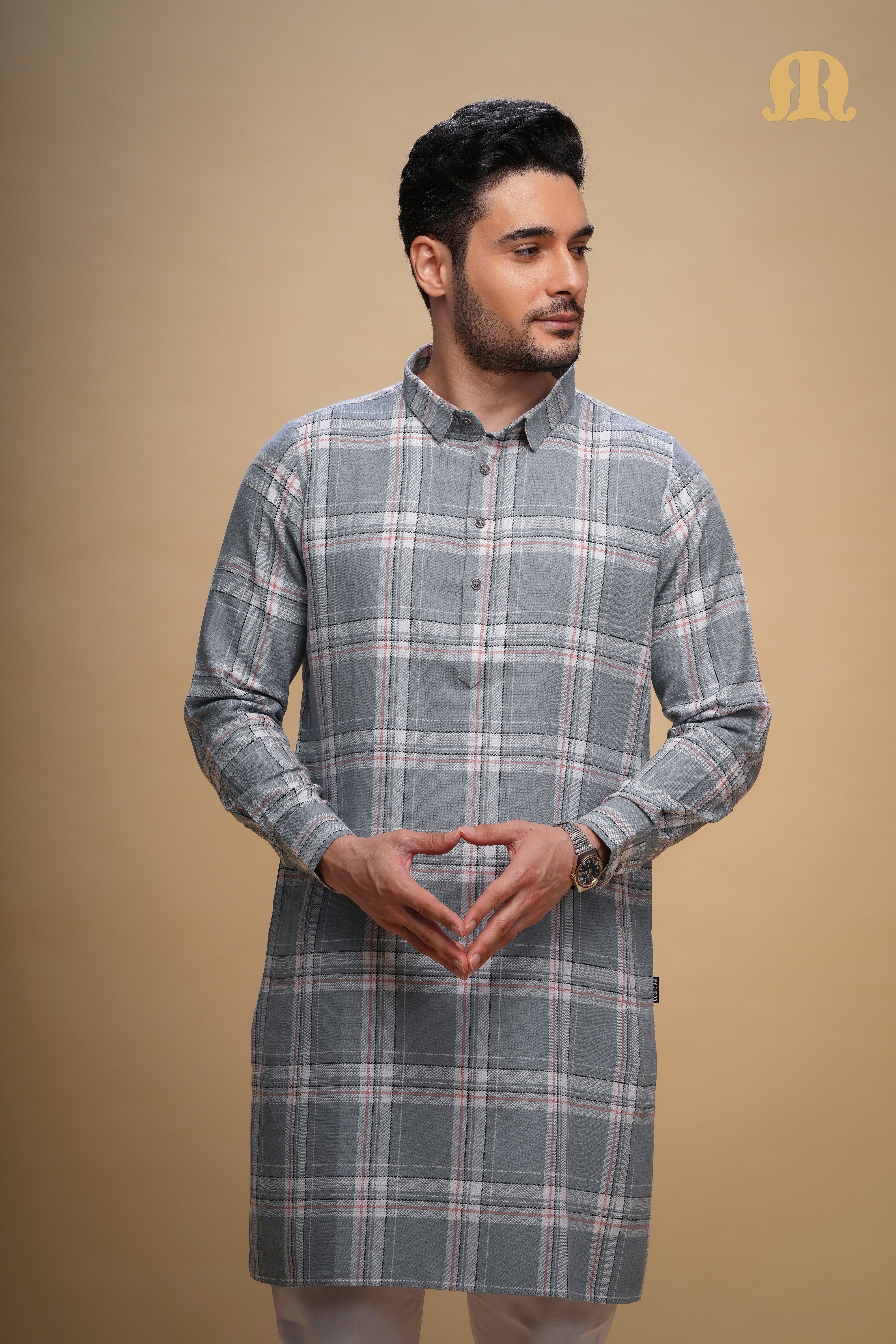 ऑक्सन चेक कुर्ता ग्रे सेट पुरुषों के लिए