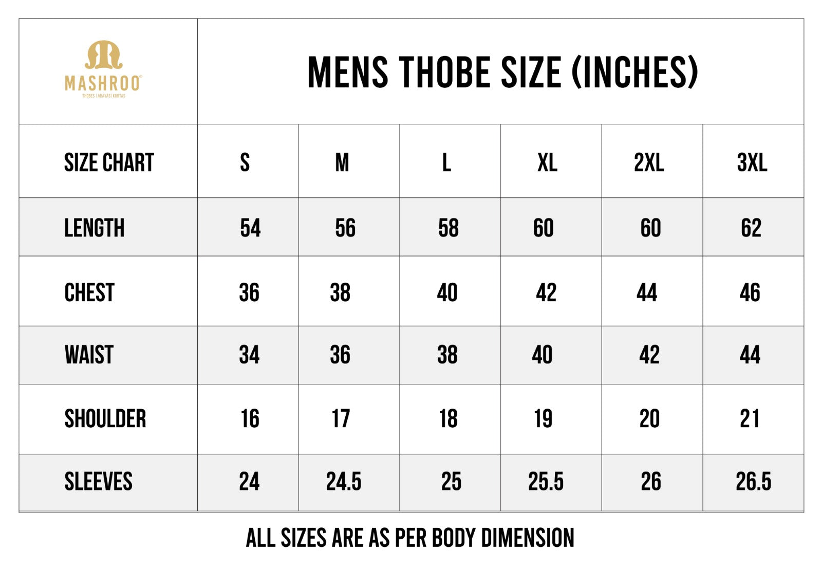 नीचे शरीर के माप दिए गए हैं।