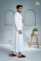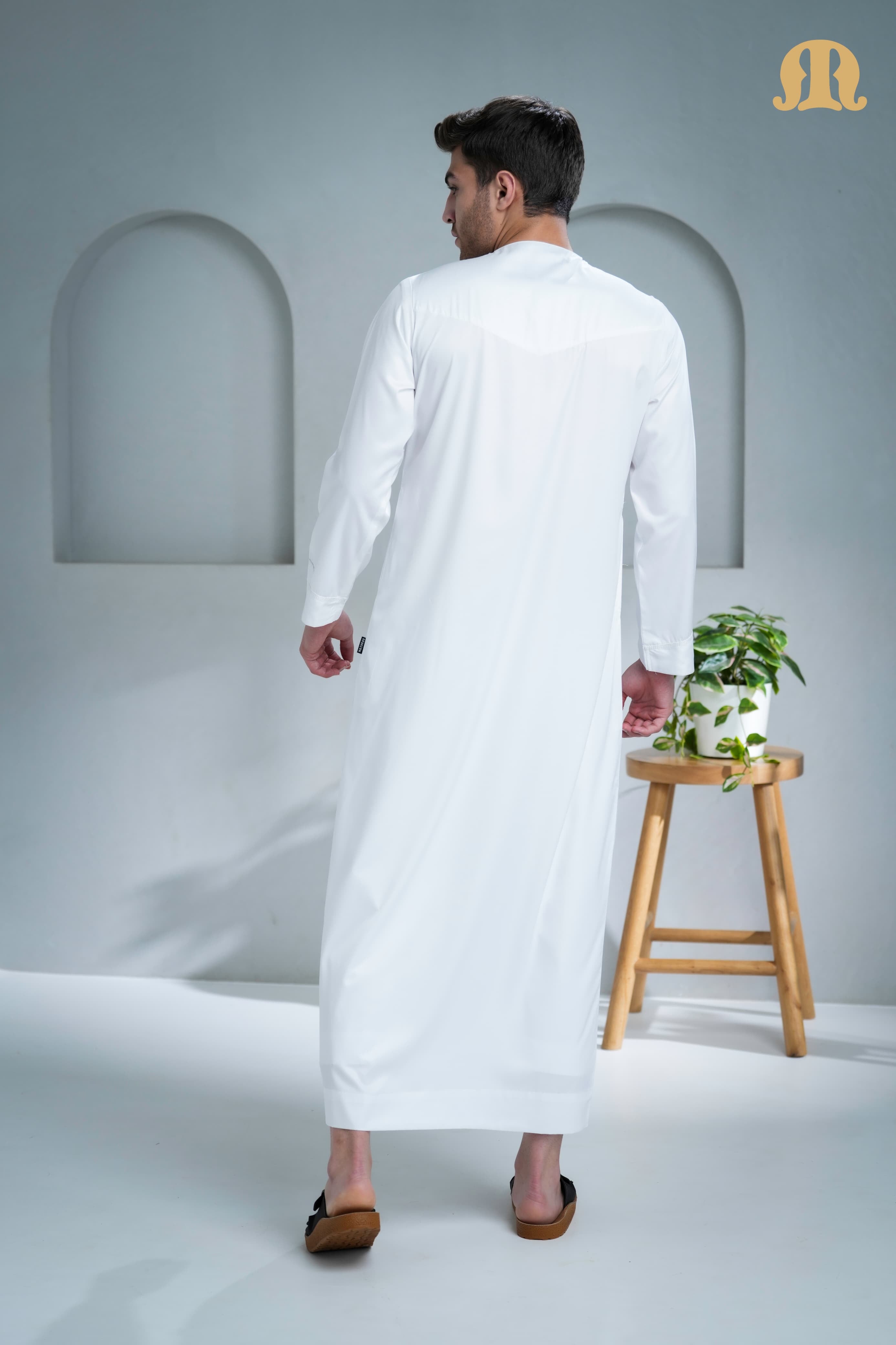 Designed for both style and functionality, this Emirati Thobe features two side pockets, seamlessly integrated into the silhouette. Practical yet discreet, these pockets provide convenience without compromising the garment's sleek aesthetic.