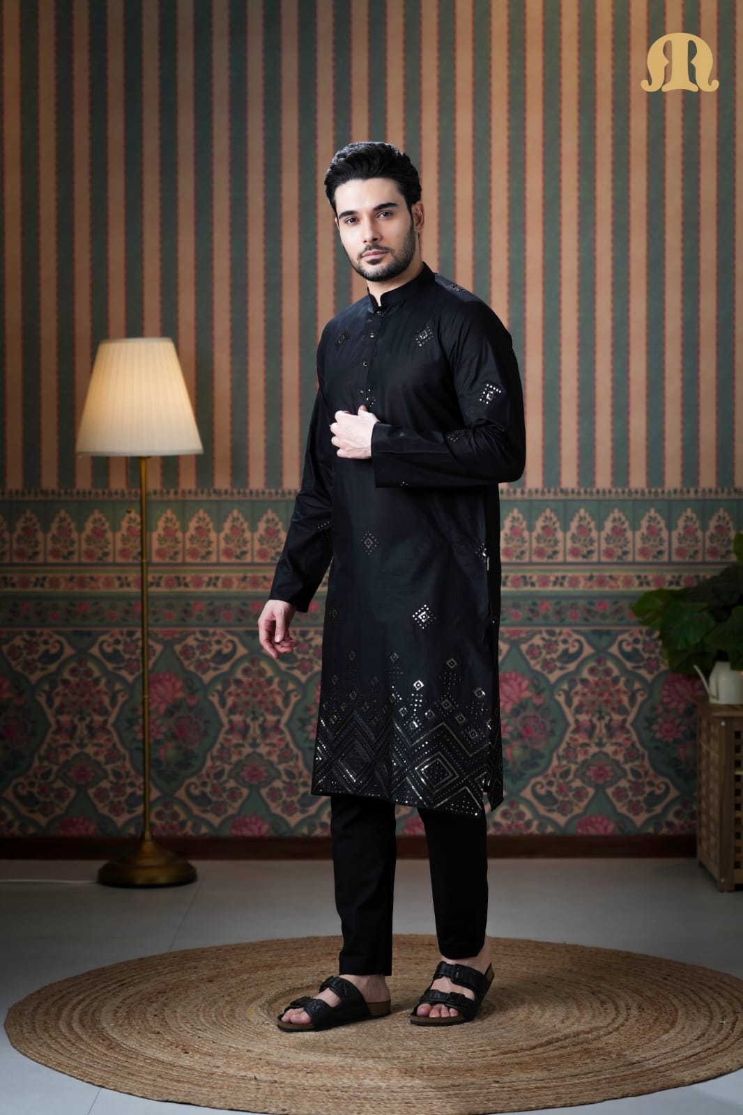 Elevate your party wear with our Eski Cotton Kurta Black. Its classic design, comfortable fabric, and stylish sequence make it an ideal choice for anyone looking to make a fashion statement.