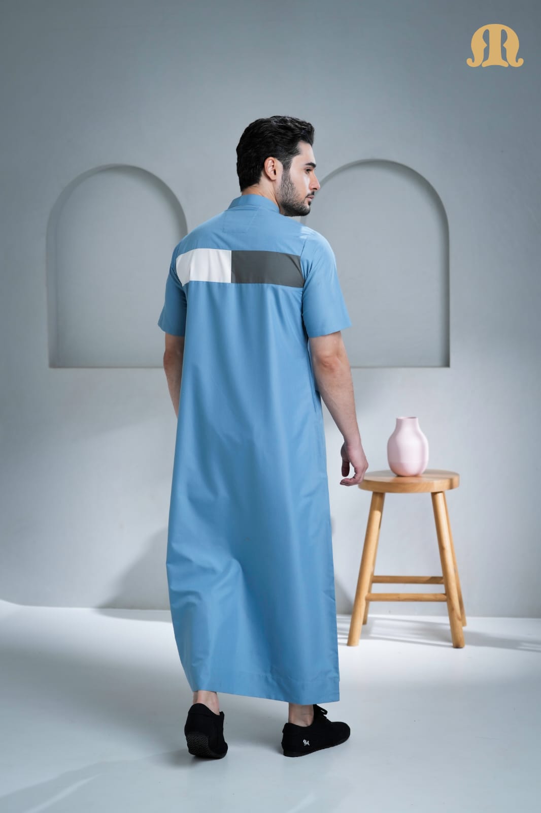The thobe features a striking royal blue color, complemented by a bold strip of contrasting white and dark grey across the chest, adding a dynamic touch to its design. The band collar enhances its clean, minimalistic look, while the front zipper provides ease of wear.