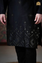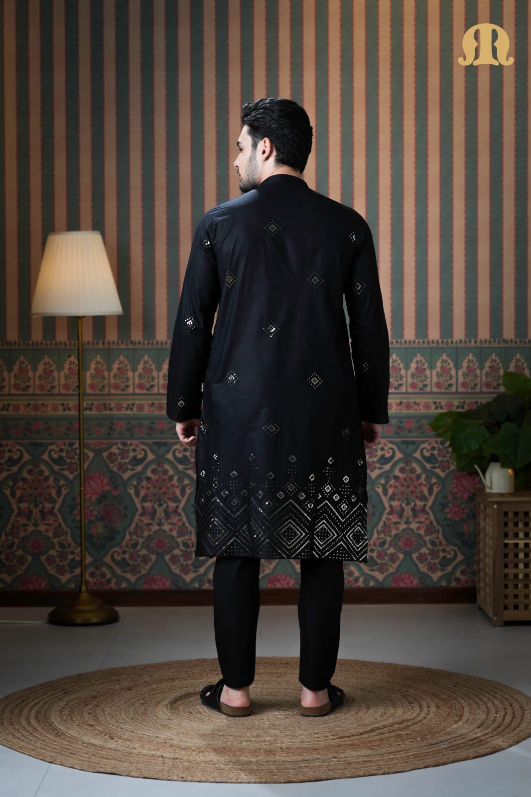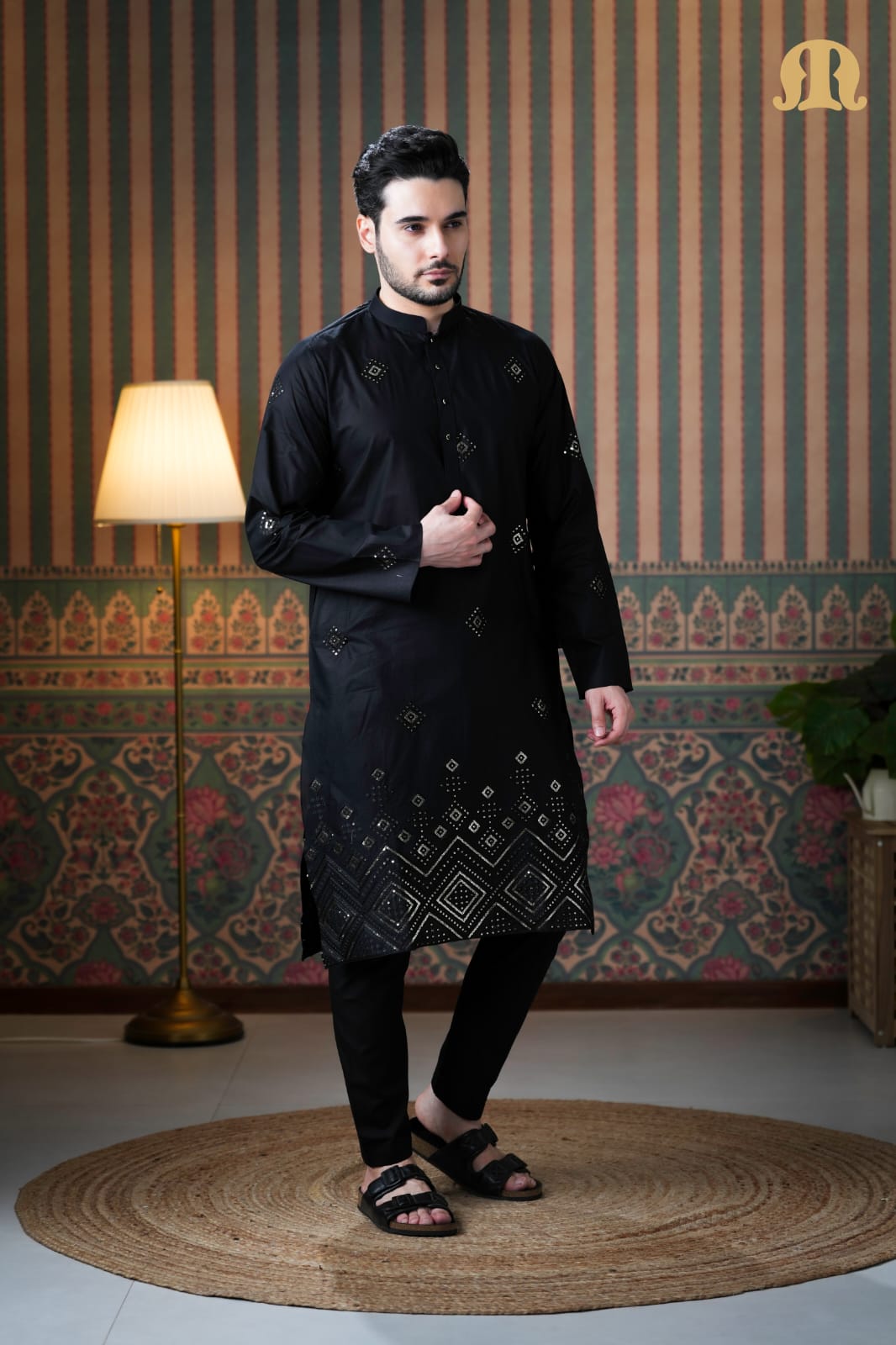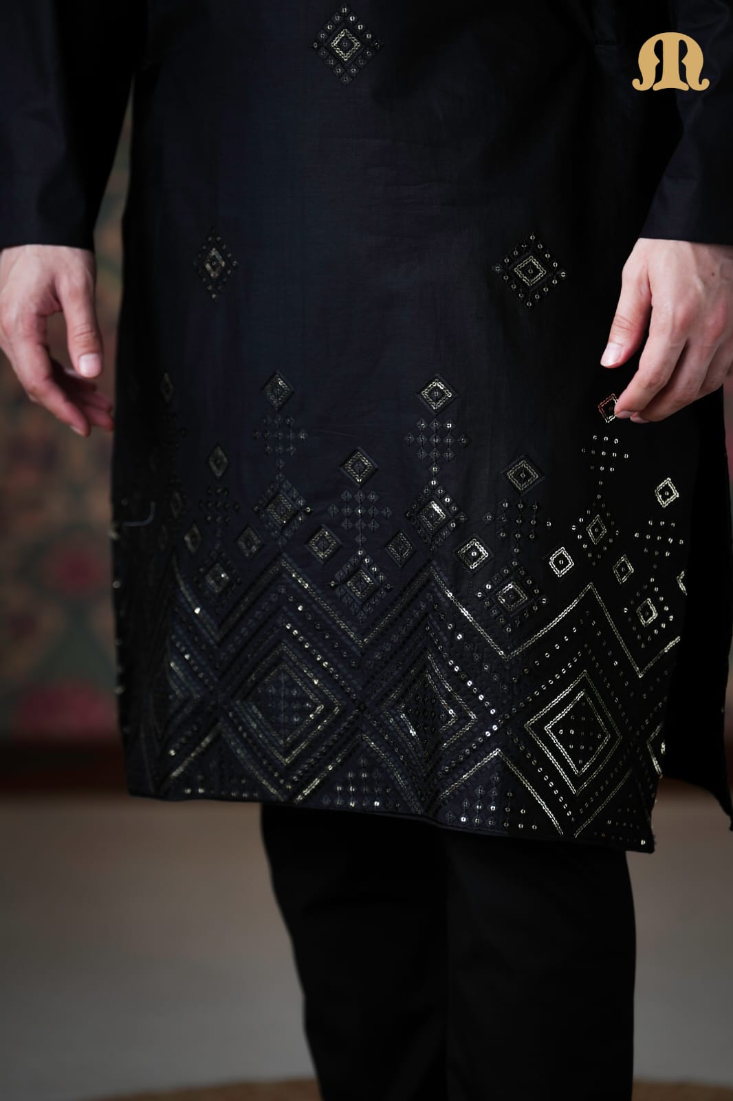 Elevate your party wear with our Eski Cotton Kurta Black. Its classic design, comfortable fabric, and stylish sequence make it an ideal choice for anyone looking to make a fashion statement.