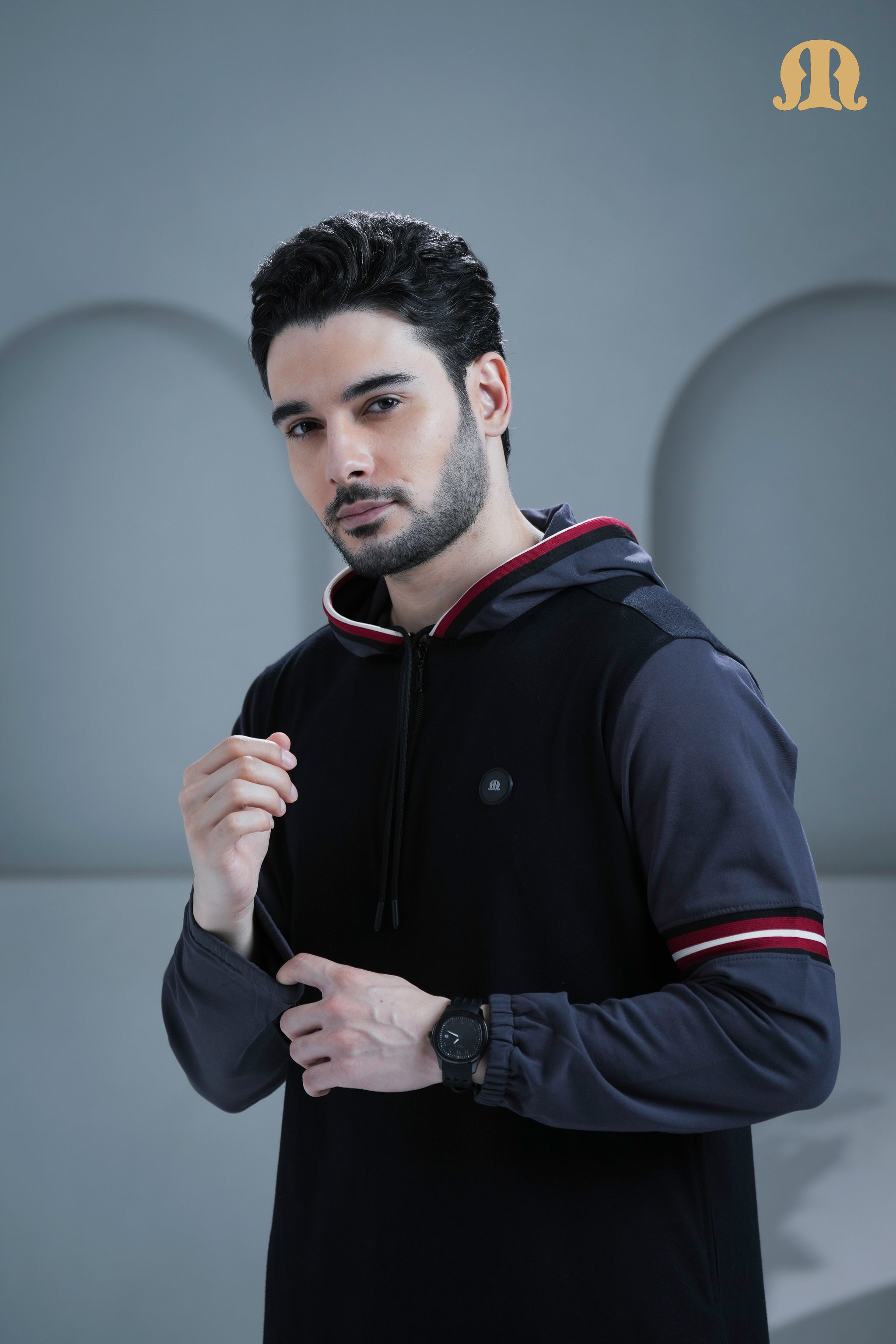 Upgrade your wardrobe with our innovative Fontaine Knaine Hoodie Thobe, featuring a unique hoodie design and stretchy knitted fabric.