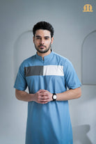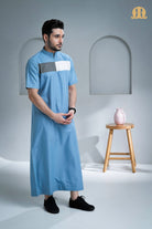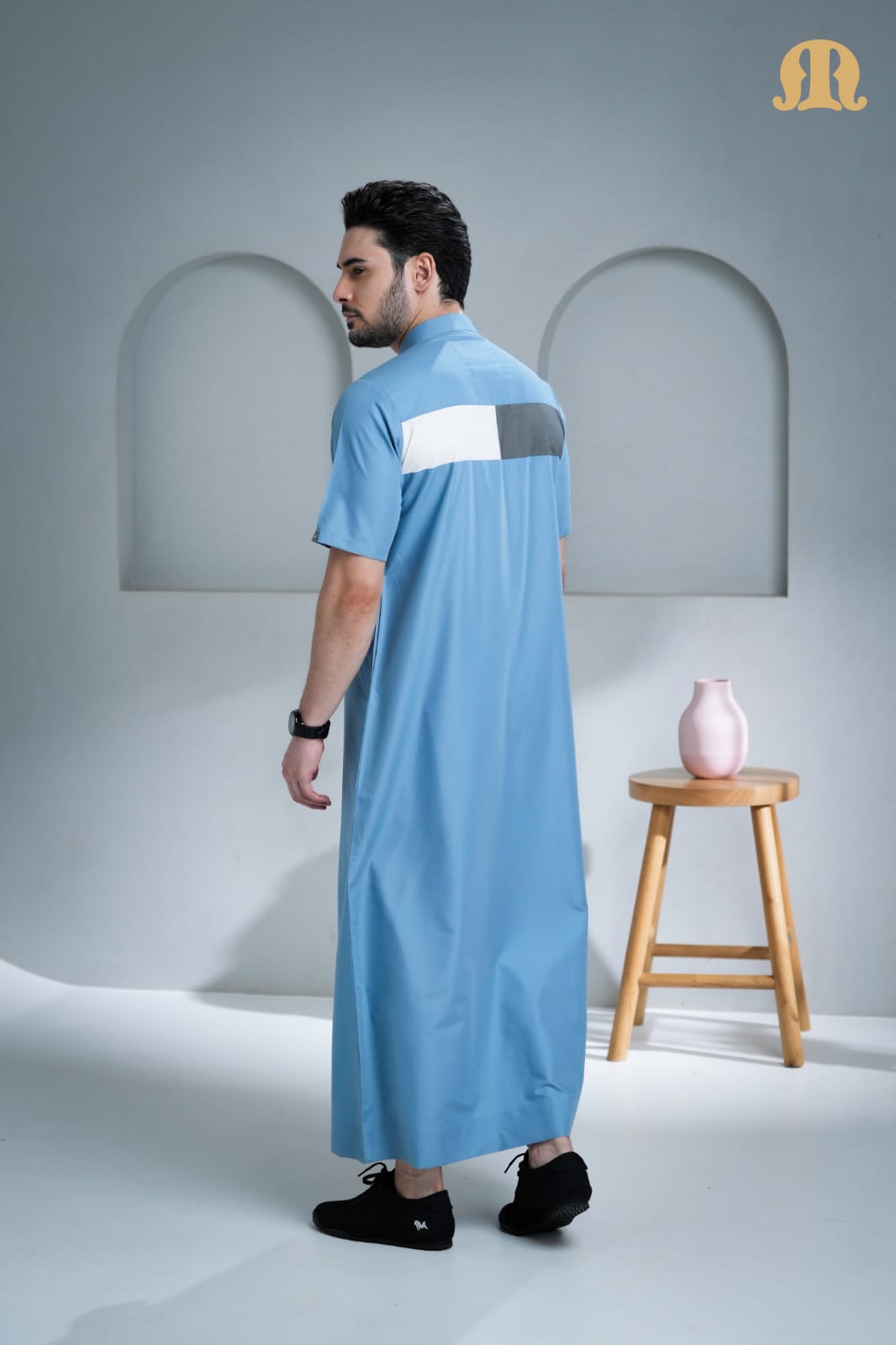 The thobe features a striking royal blue color, complemented by a bold strip of contrasting white and dark grey across the chest, adding a dynamic touch to its design. The band collar enhances its clean, minimalistic look, while the front zipper provides ease of wear.
