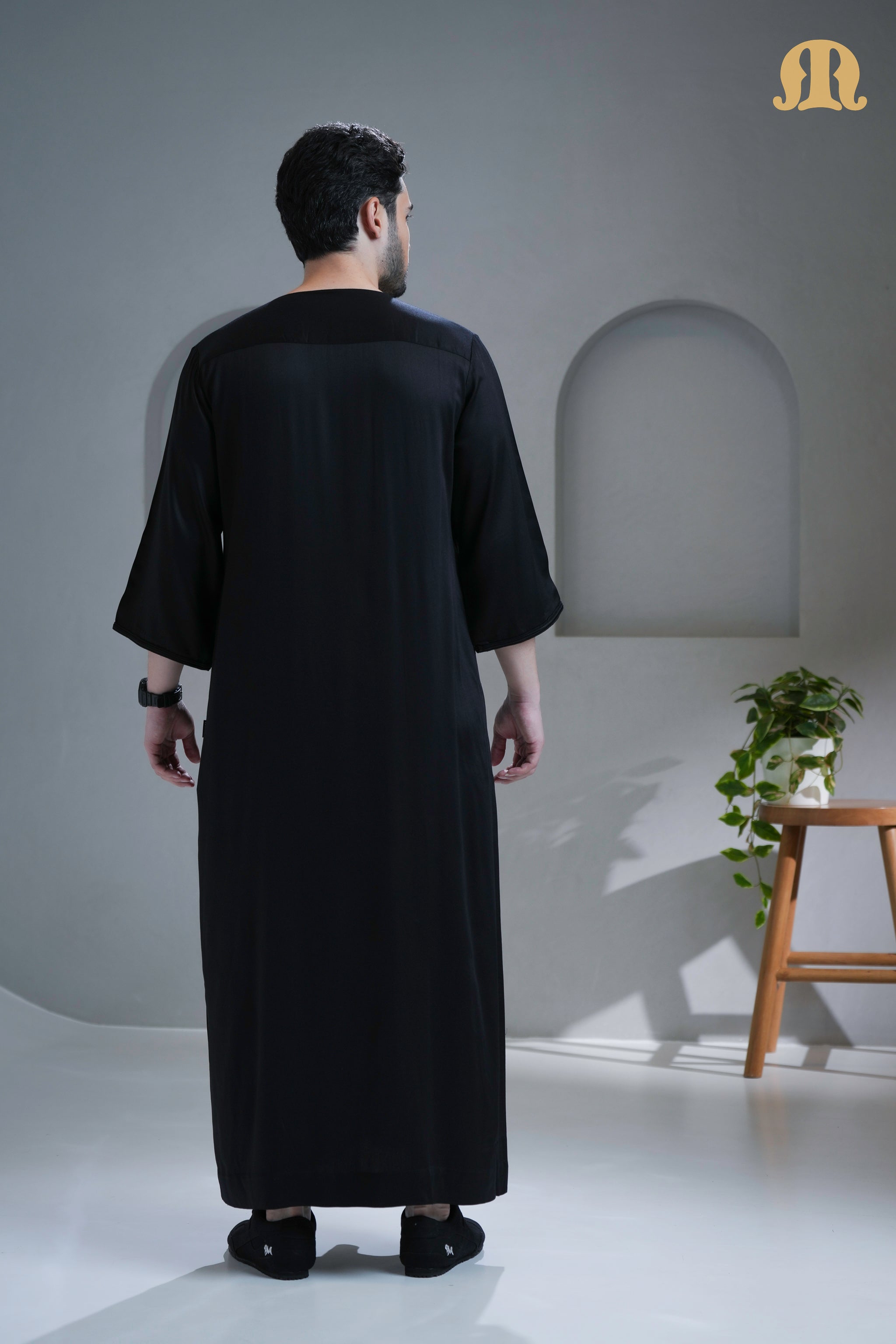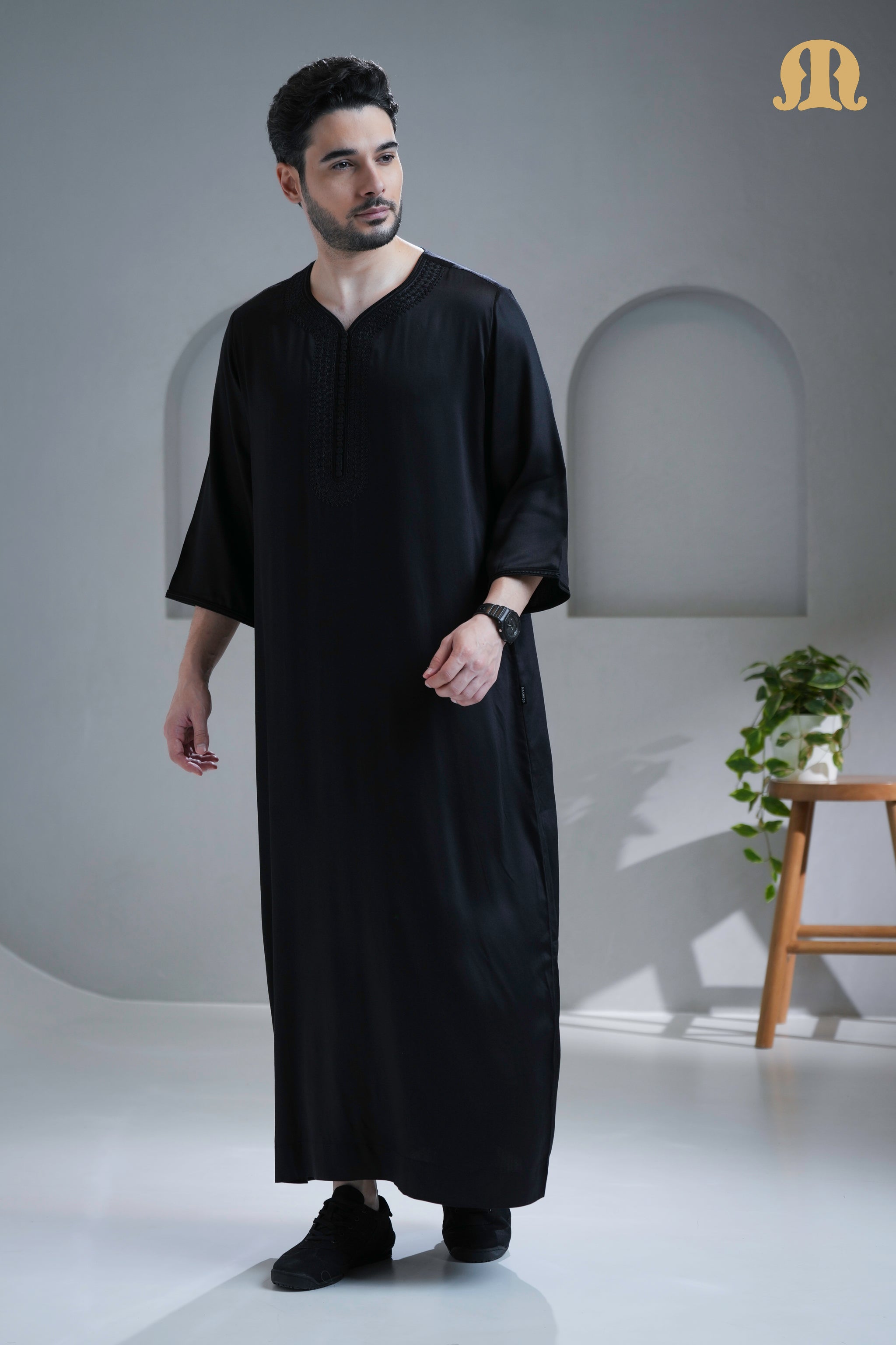 Elevate your traditional wear with our sleek Tiznit Black Moroccan Thobe, expertly crafted in the authentic Moroccan style.
