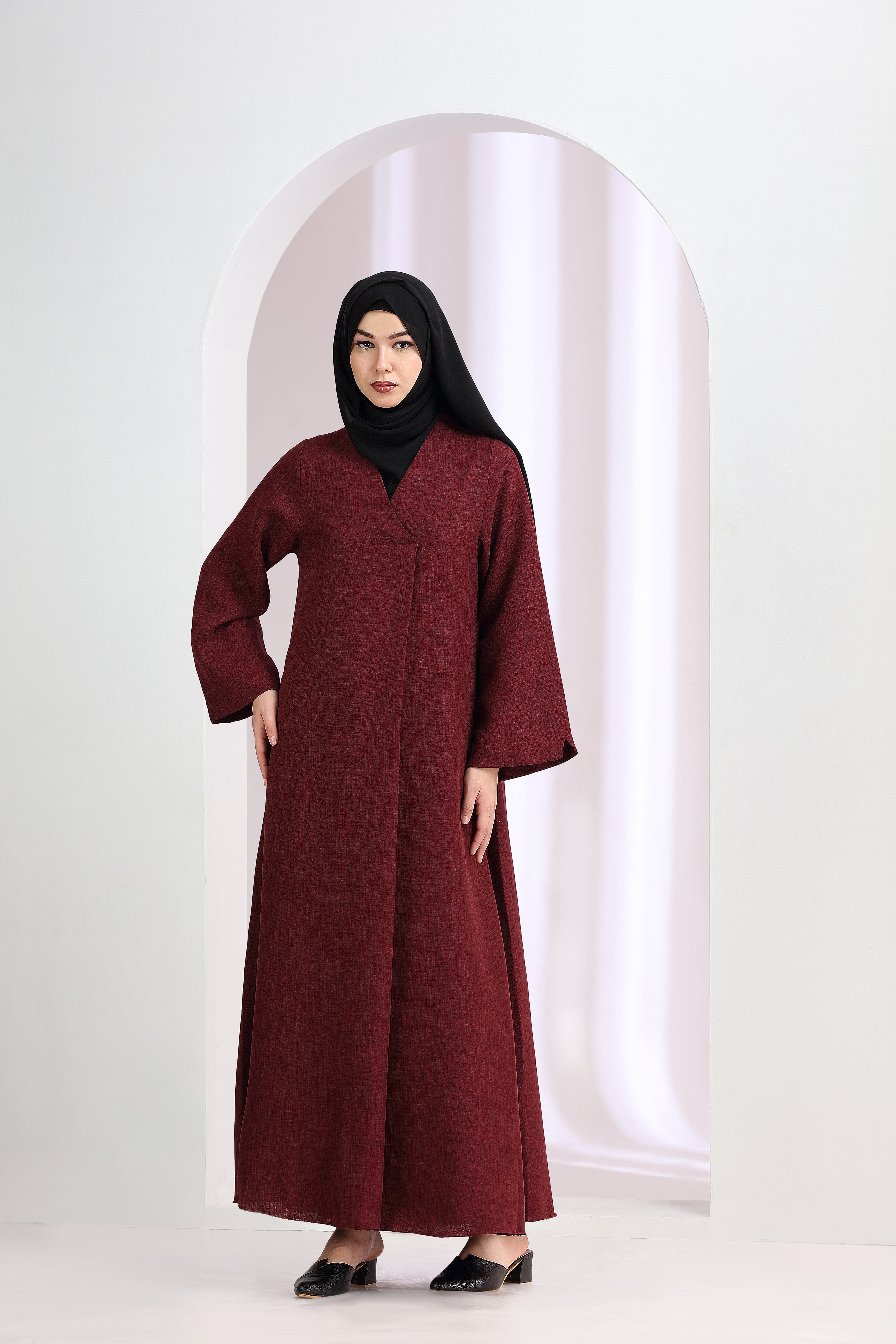 Aiza Shrug Abaya Maroon Elevate your modest fashion with the Aiza Shrug Abaya in Maroon—a sophisticated layering piece that seamlessly blends contemporary design with traditional elegance. Crafted for versatility, this shrug abaya features a refined silhouette that drapes gracefully over your everyday wear, offering effortless coverage without compromising on style. The neutral cream tone pairs beautifully with any wardrobe, making it an essential investment for those who value both comfort and understated luxury. Perfect for layering over kurtas, dresses, or traditional garments, this piece embodies minimalist sophistication for the modern woman.