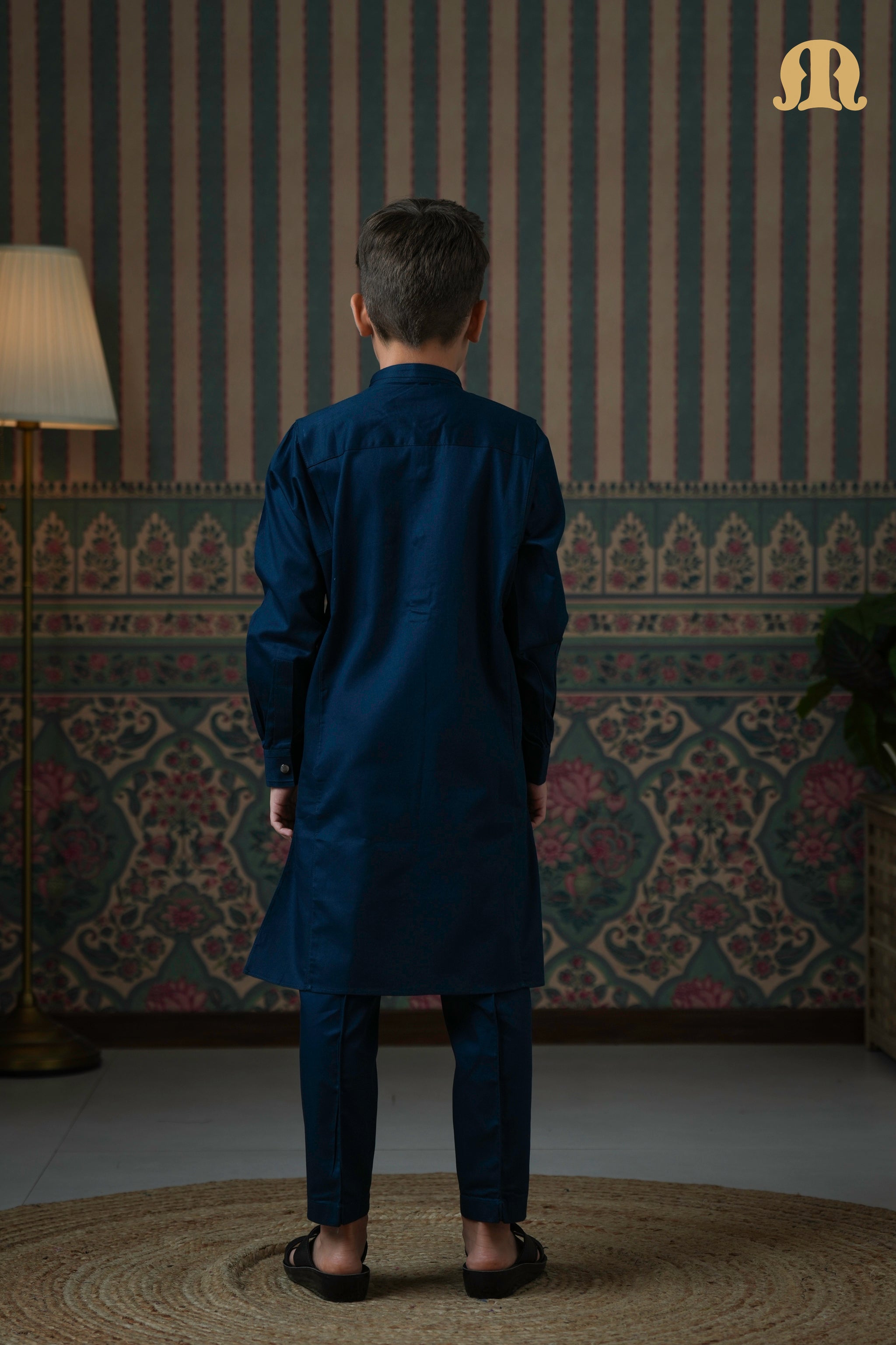 The White Kali Kurta for Kids by Mashroo is made up of Dobby cotton fabric, it sports a mandarin collar and custom-designed logo encrypted buttons. Being dressed in a Mashroo Kurta would become the favourite look of your minors, sooner than you would know.