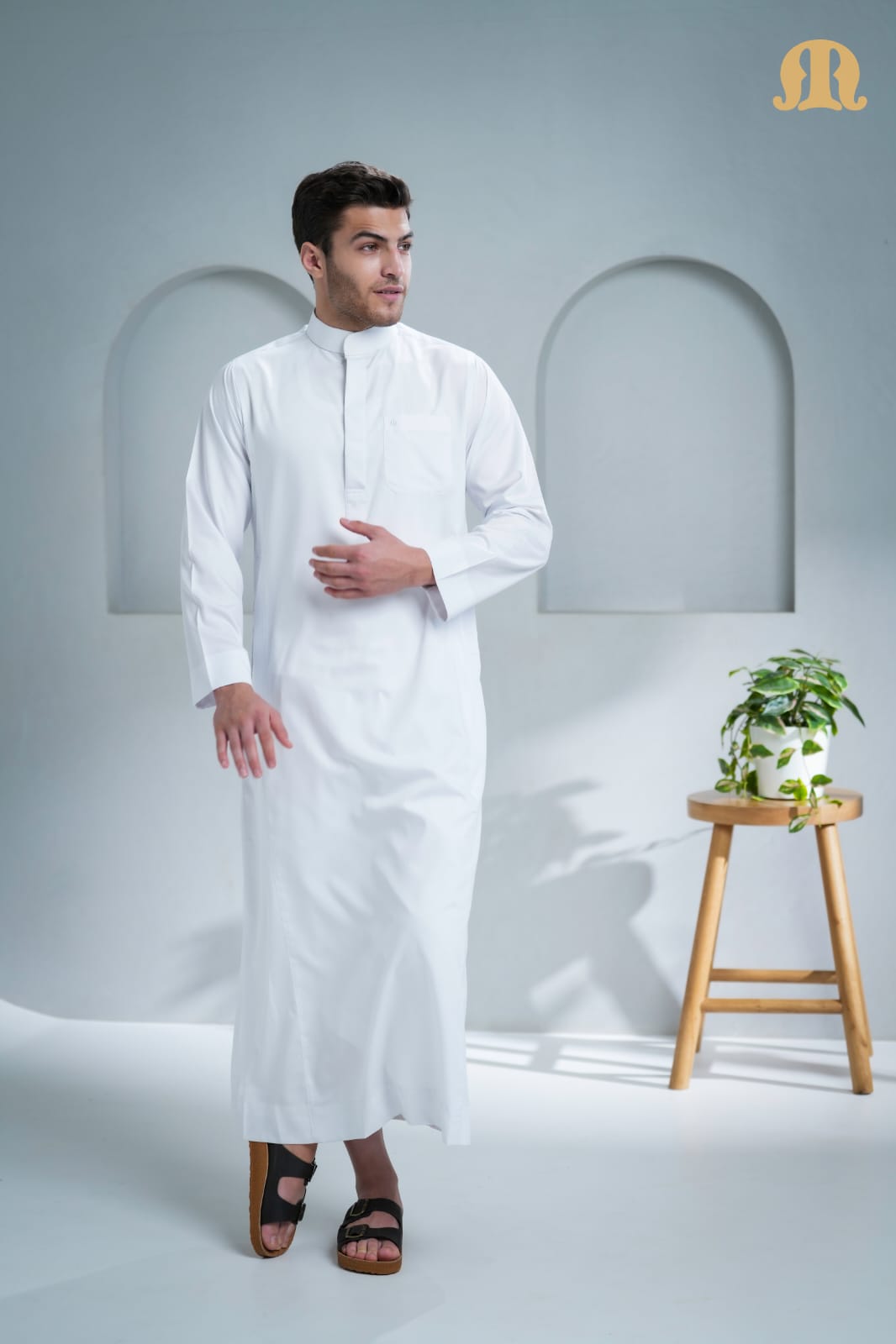 Introducing the "Kurvig Saudi Thobe," a sophisticated and modern take on traditional Saudi attire. Crafted from high-quality poly-cotton fabric, this thobe seamlessly blends comfort with style, making it a versatile choice for various occasions.