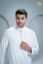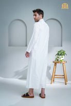 The distinctive feature of the Kurvig Saudi Thobe is its refined design, starting with a sleek band collar that adds a touch of contemporary flair. The thobe boasts a concealed placket, contributing to its polished look and maintaining a clean and seamless appearance. The front pocket serves both functional and aesthetic purposes, providing a subtle yet practical detail.