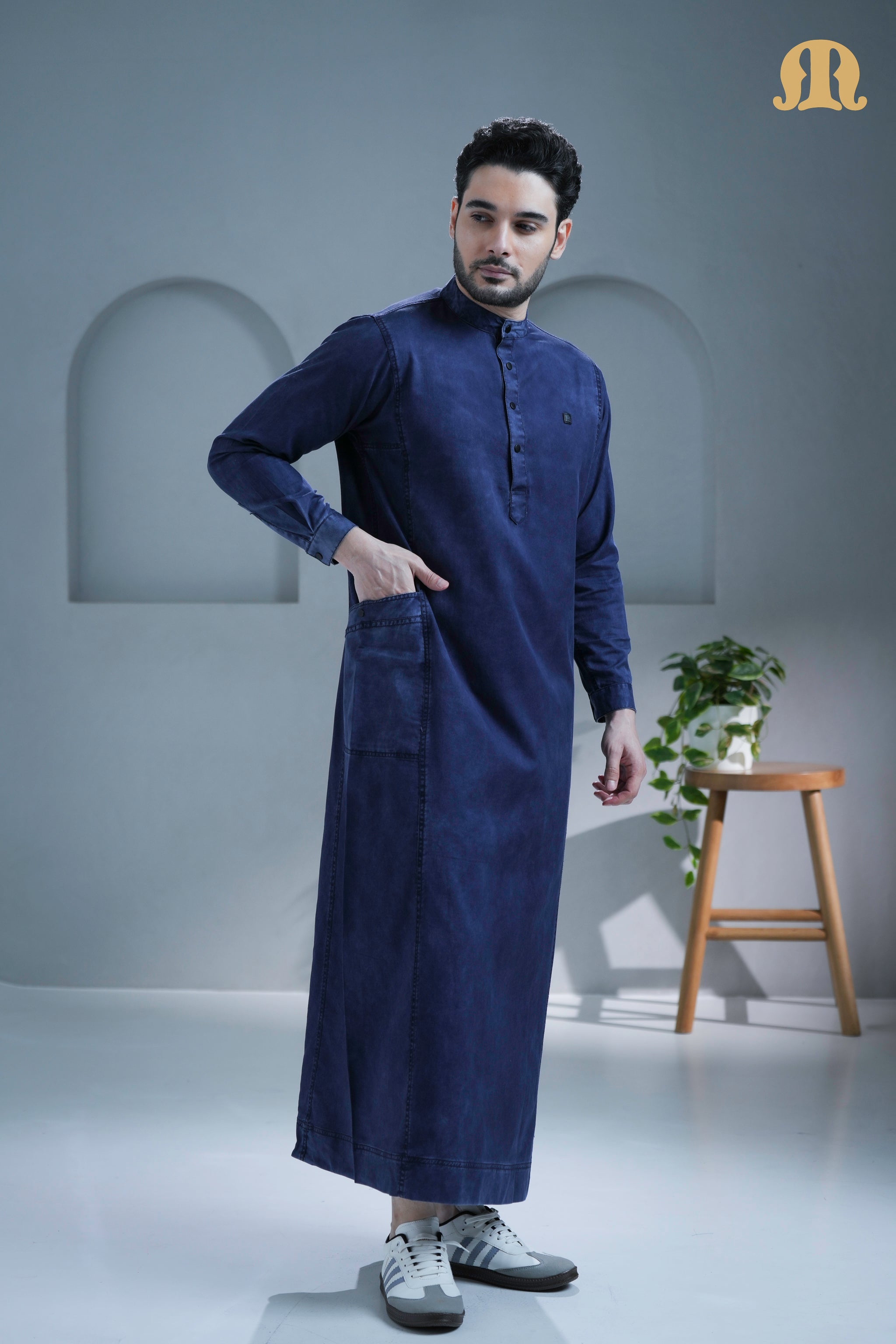 Experience the perfect blend of tradition and modern style with our Mekong Navy Blue Denim Thobe. Order now!