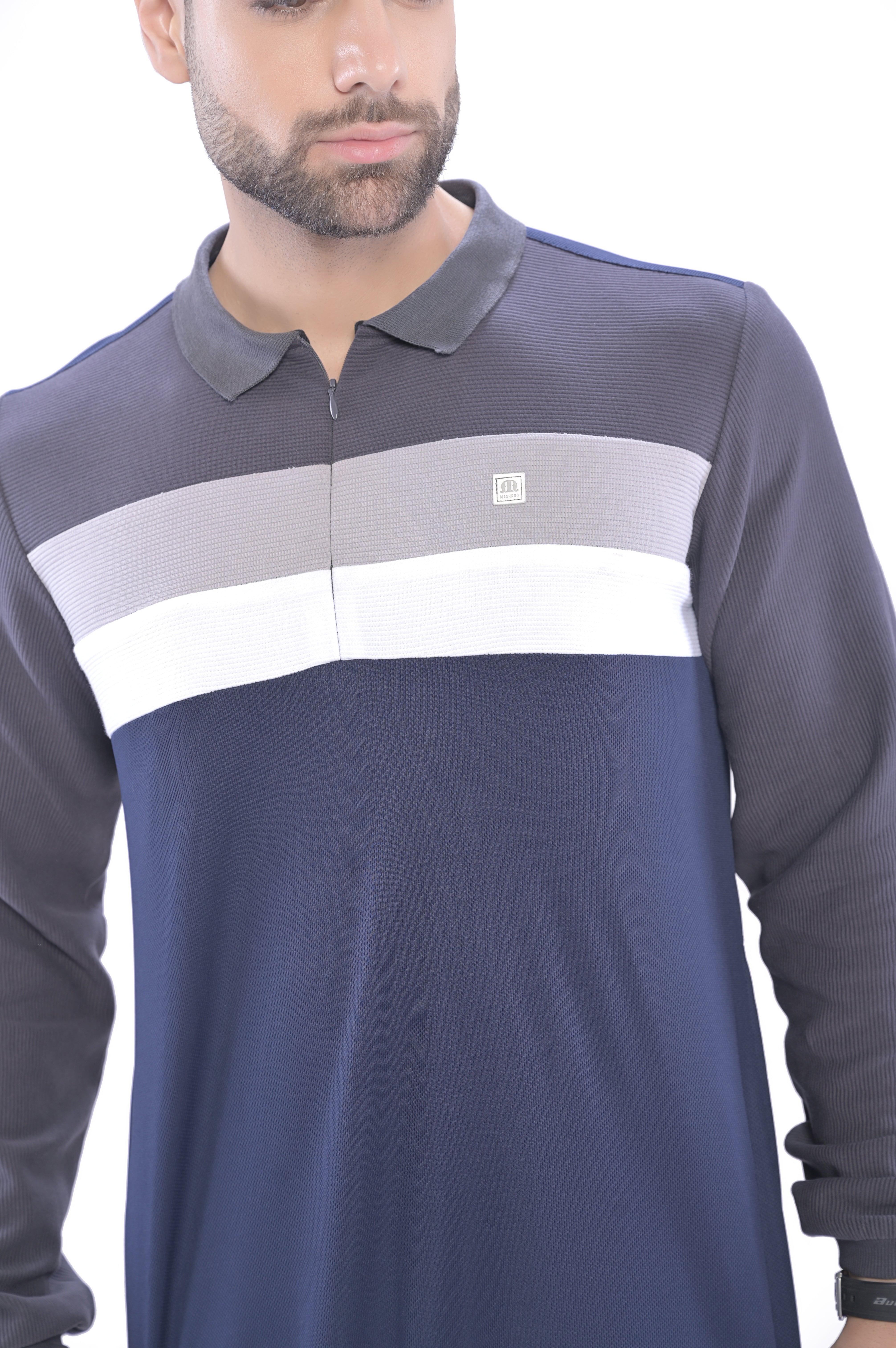The 'Royal Blue Tertius' Thobe boasts a distinctive design with ribs on the cuffs, adding a touch of texture and refinement. The shirt collar further elevates the overall aesthetic, providing a polished and versatile look suitable for various occasions.